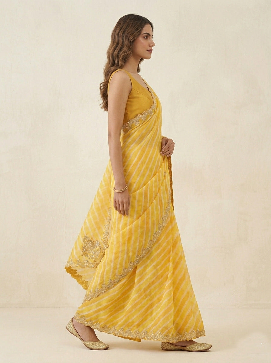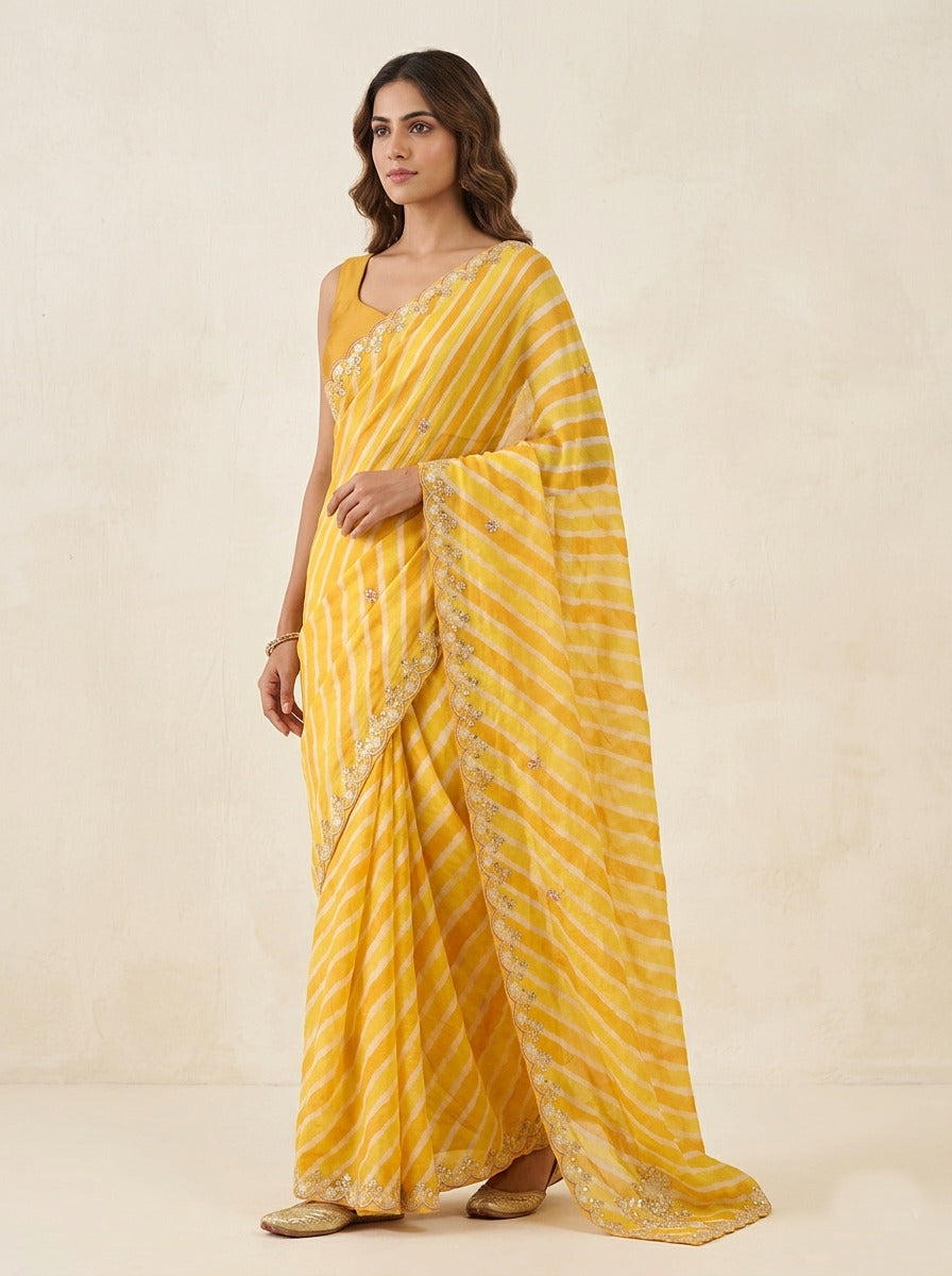 Saree Color : Yellow Leheriya Saree Fabric : Tussar Silk Saree Work : Pearl, Sequine, Aari Blouse Color : Yellow Blouse Fabric : Silk Blouse Work : Pearl, Sequine, Aari |