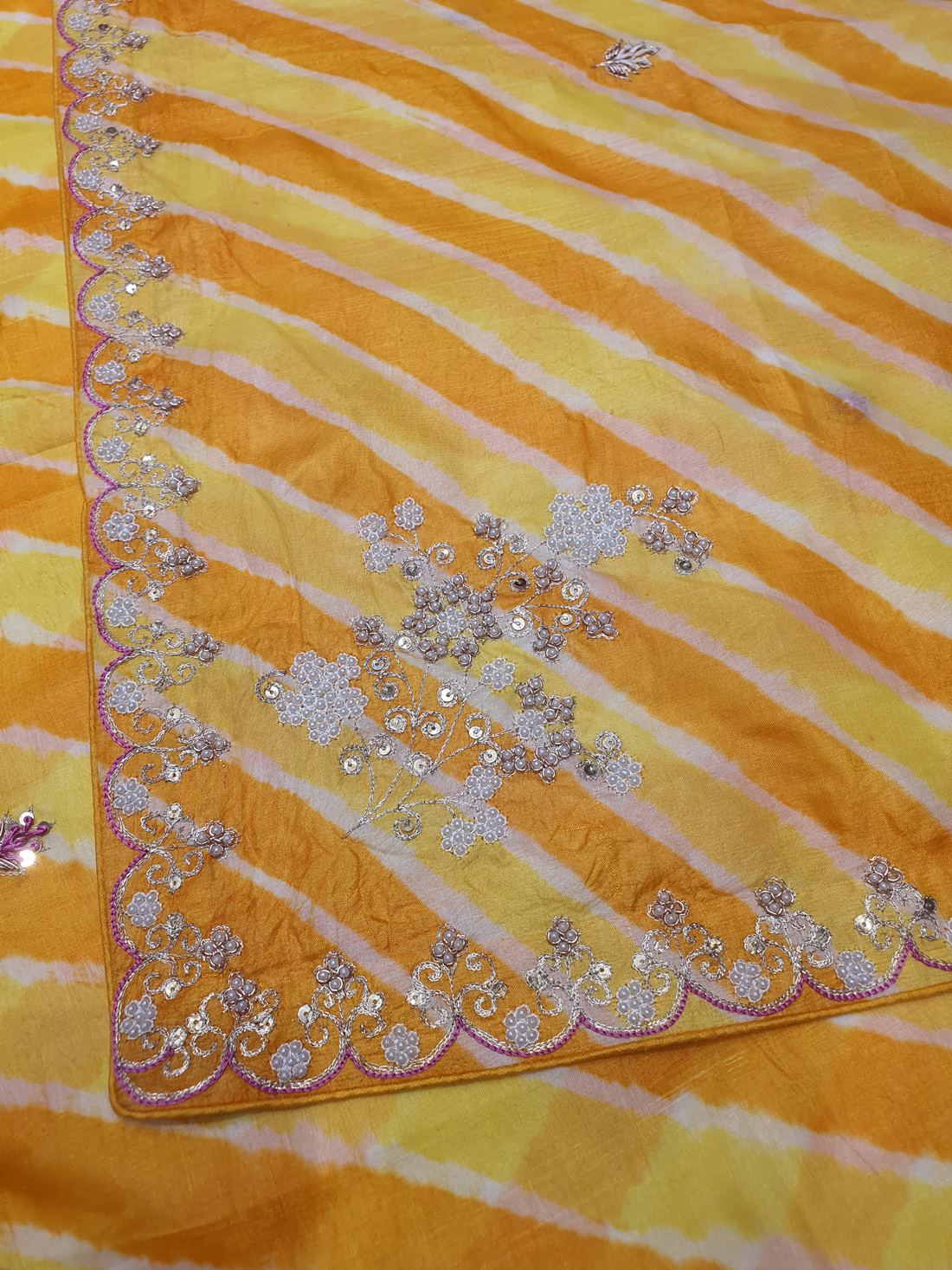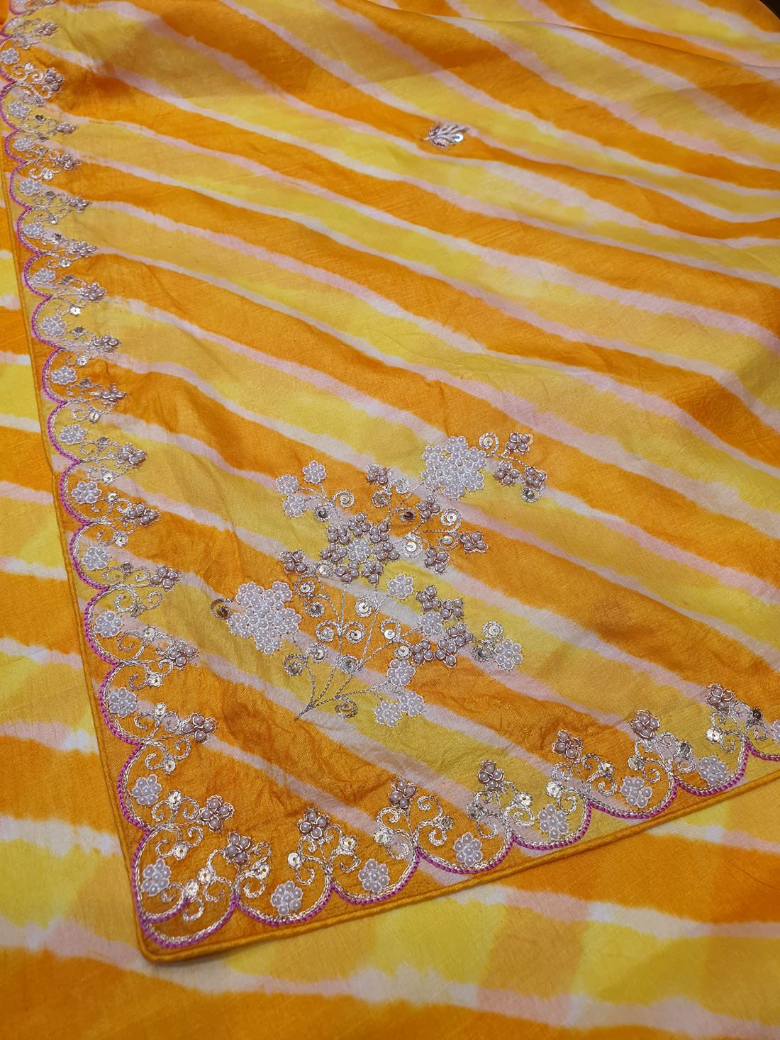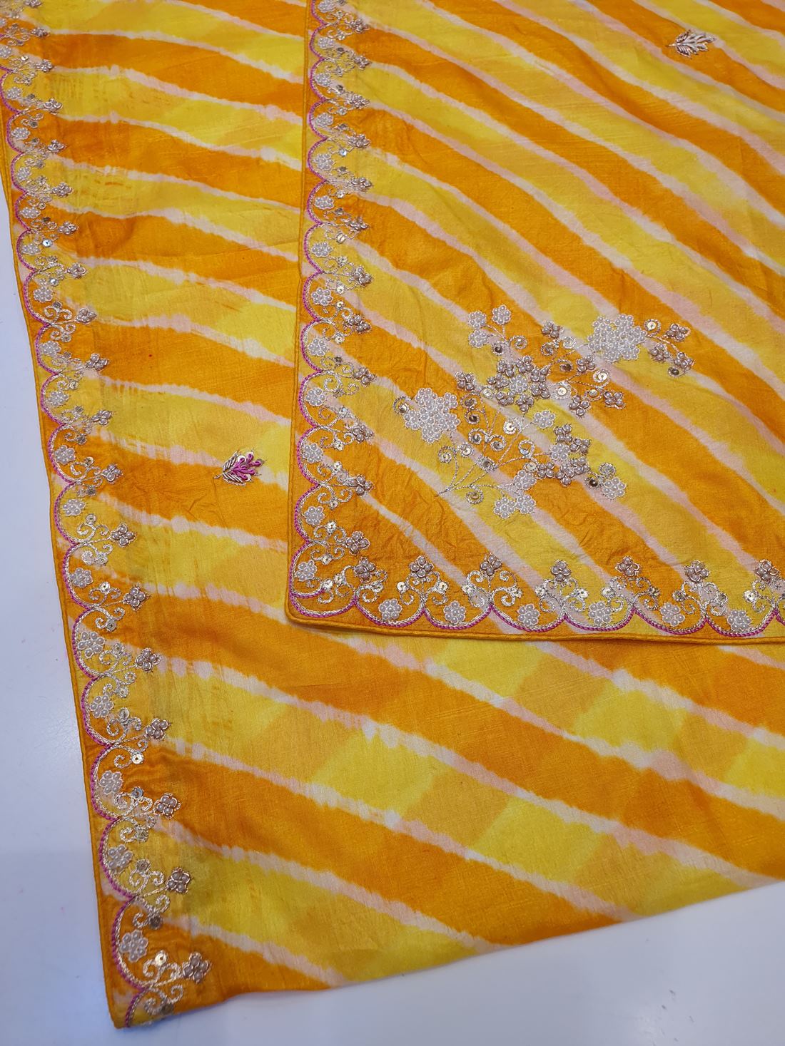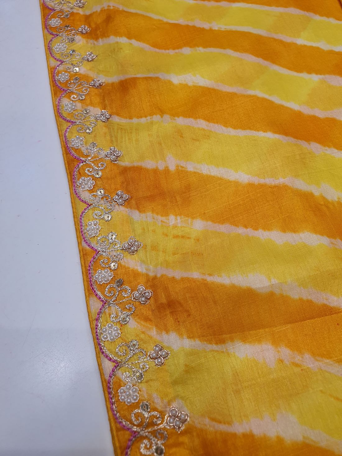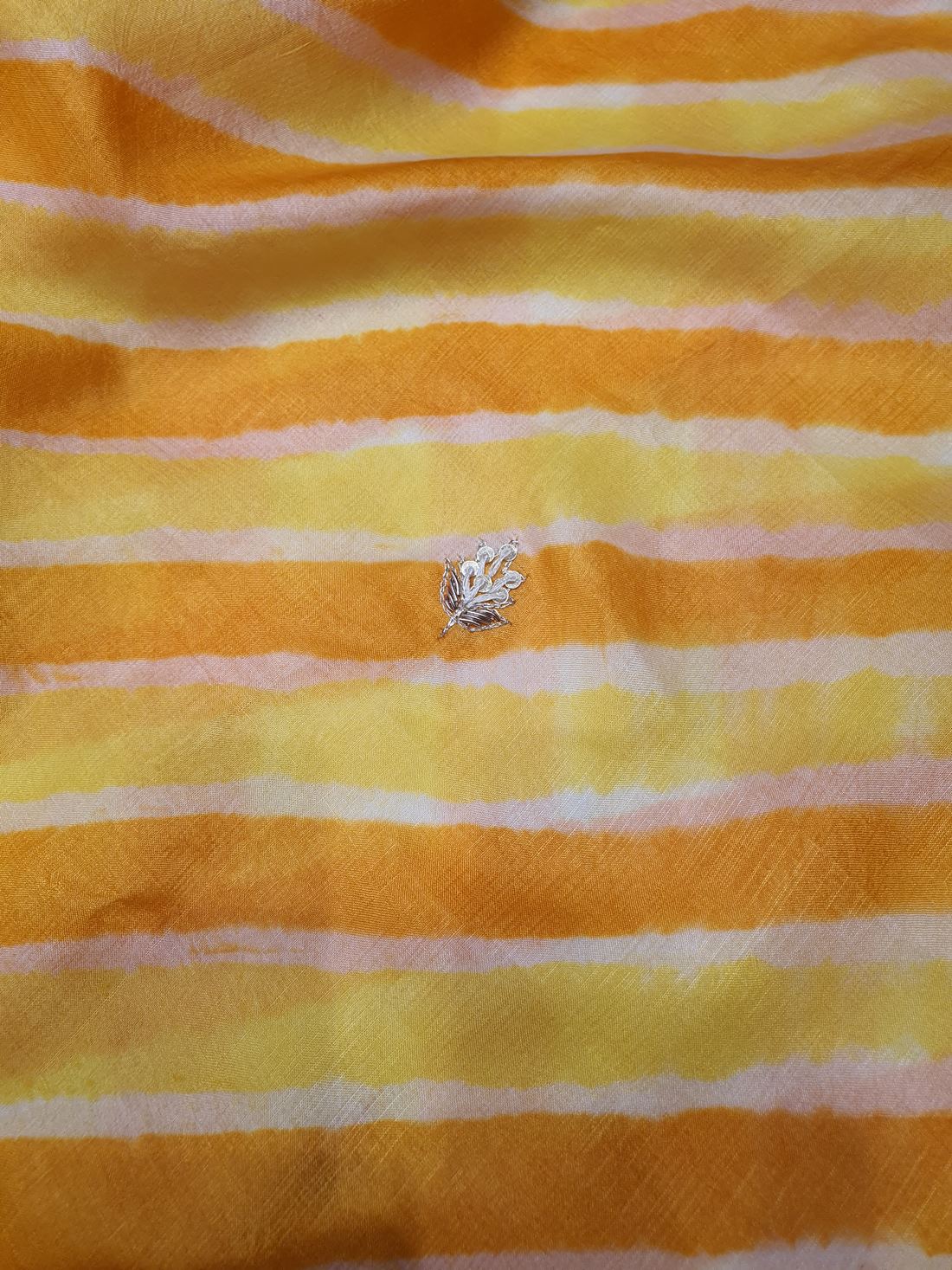 Elevate your ethnic wardrobe with the Ranas Pearl & Sequine Work Saree, a stunning blend of traditional craftsmanship and contemporary elegance. Crafted from premium tussar silk, this saree features an eye-catching yellow leheriya pattern that radiates warmth and vibrancy. Adorned with intricate pearl and sequine embellishments, it adds a touch of glamour perfect for festive occasions, celebrations, and special events. The soft drape and luxurious fabric ensure comfort throughout the day, while the detailed embroidery work showcases exceptional artistry. Ideal for those who appreciate timeless beauty with modern flair, this saree is a versatile addition to any collection.