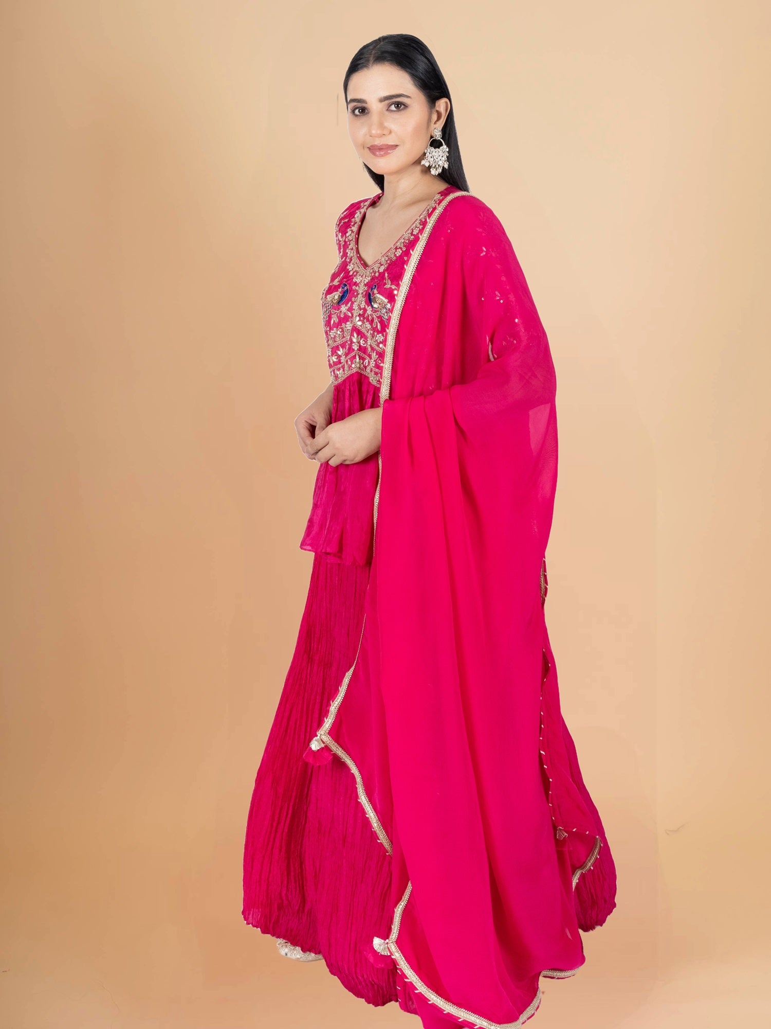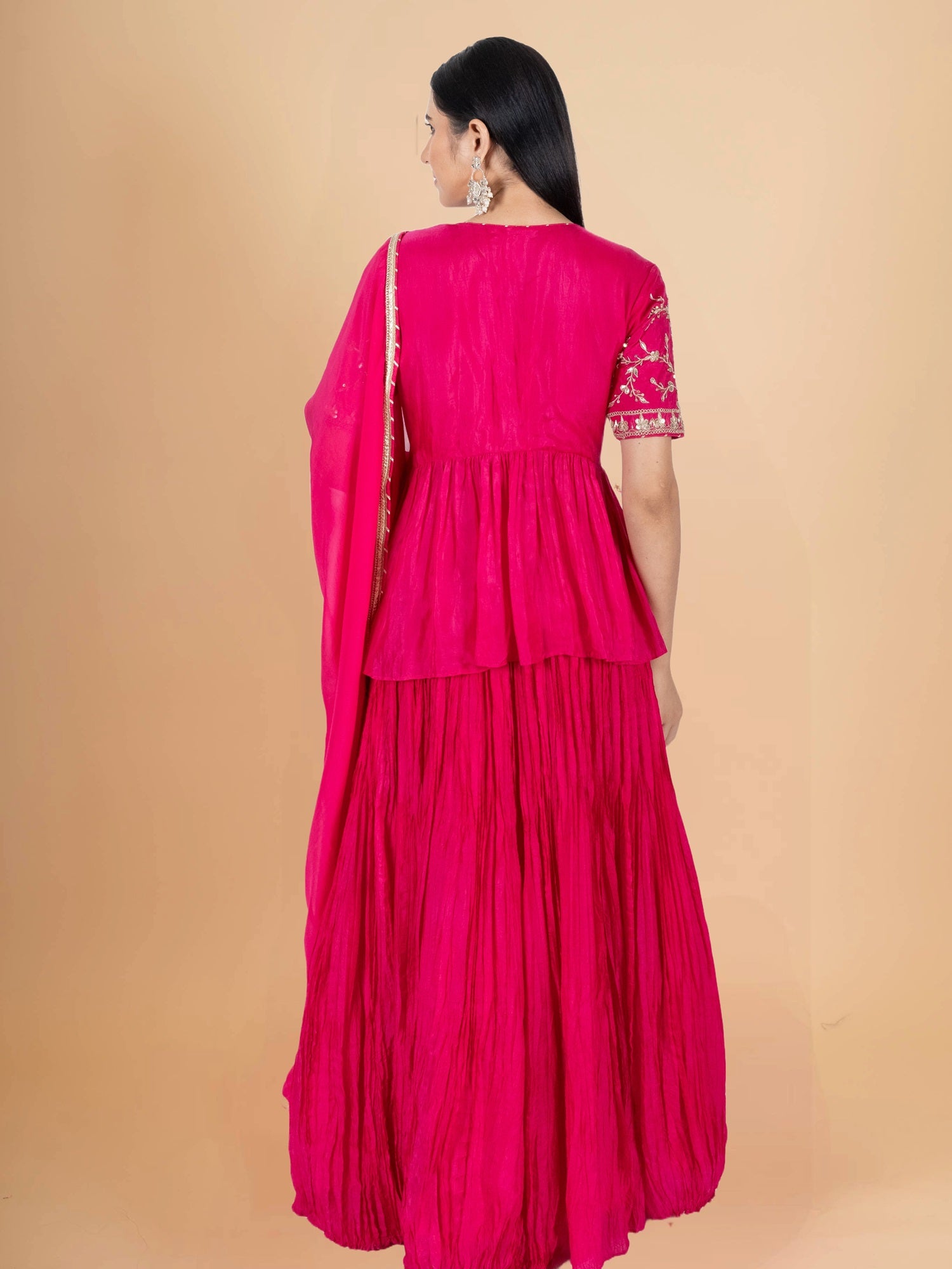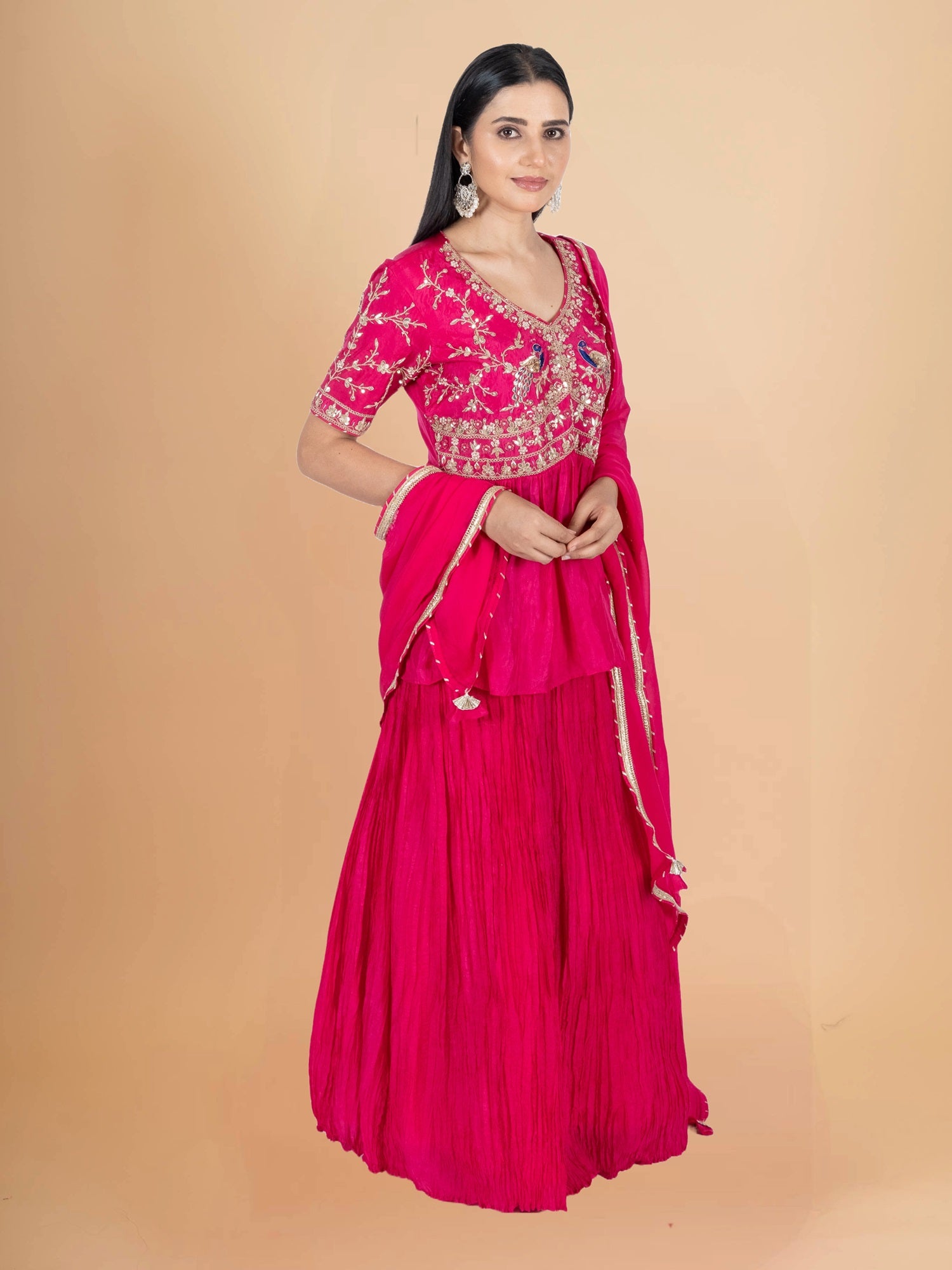 | Peplum Color : Rani Pink Peplum Fabric : Silk Peplum Work : Gota Patti , Marori , Sequins , Peacock motif Dupatta Color : Rani Pink Dupatta Fabric : Organza Dupatta Work : Lace Bottom Type : Skirt Skirt Color : Red Rani Skirt Fabric : Silk |