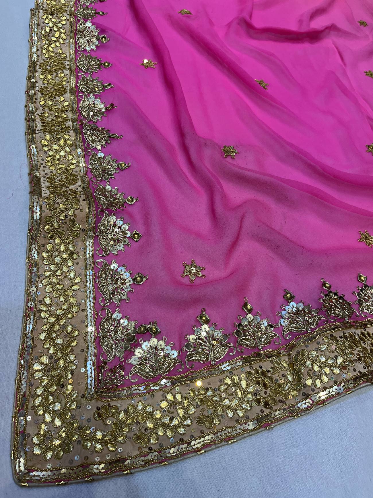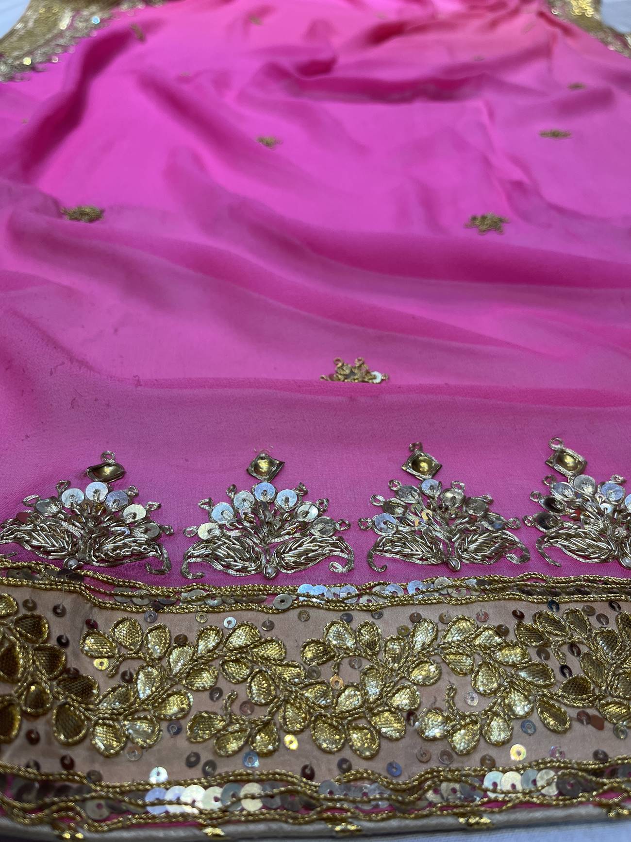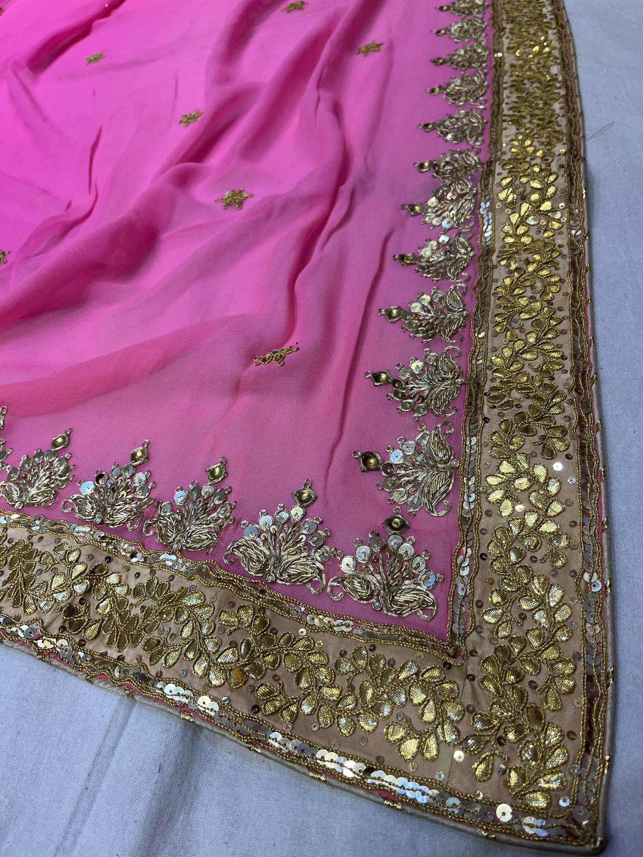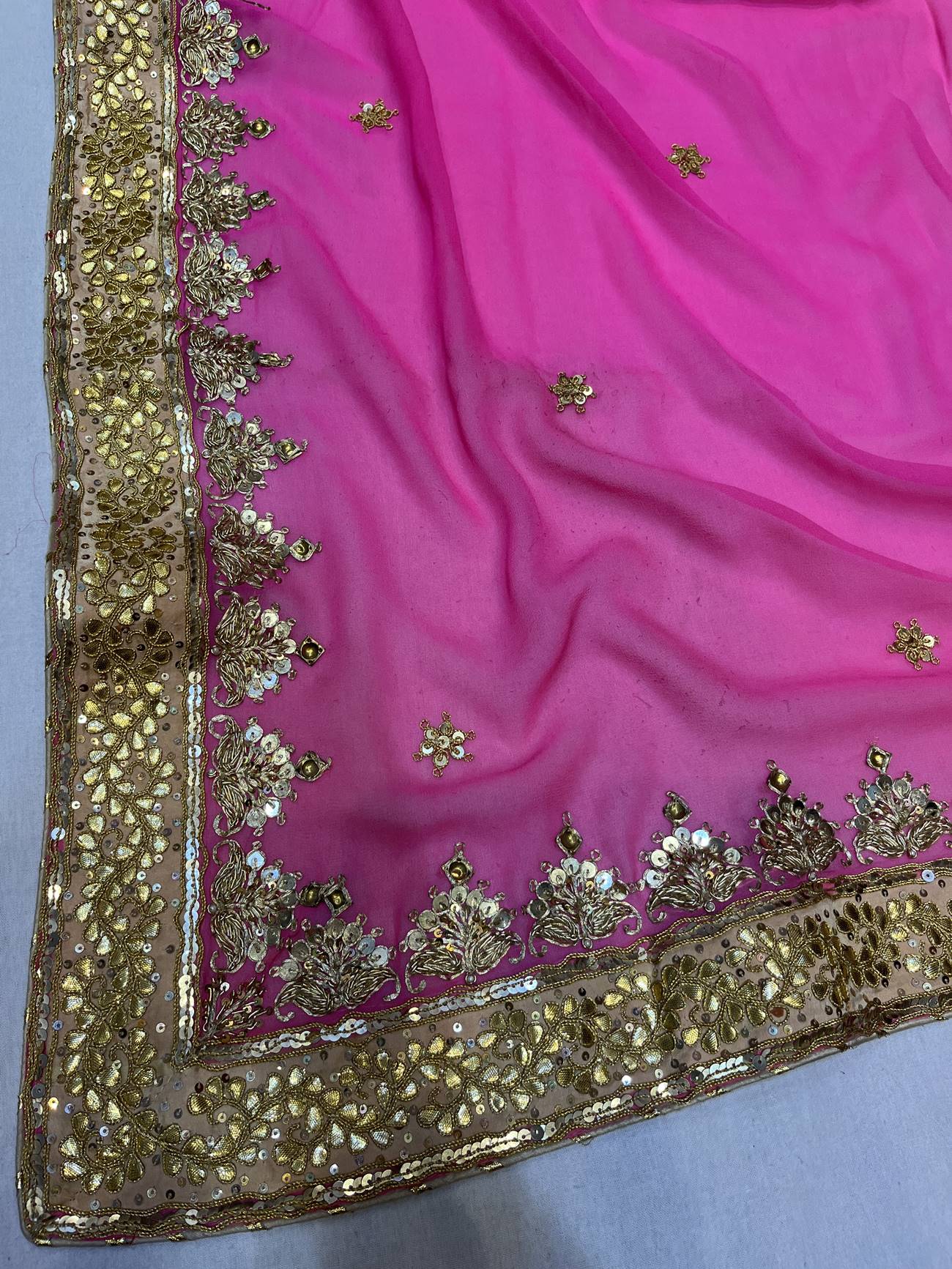 Saree Color : Pink Saree Fabric : Georgette Saree Work : Danka, Gota , kasab, Zardosi, Squine Blouse Color : Golden Blouse Fabric : Tissue Blouse Work : Danka, Gota , kasab, Zardosi, Squine |