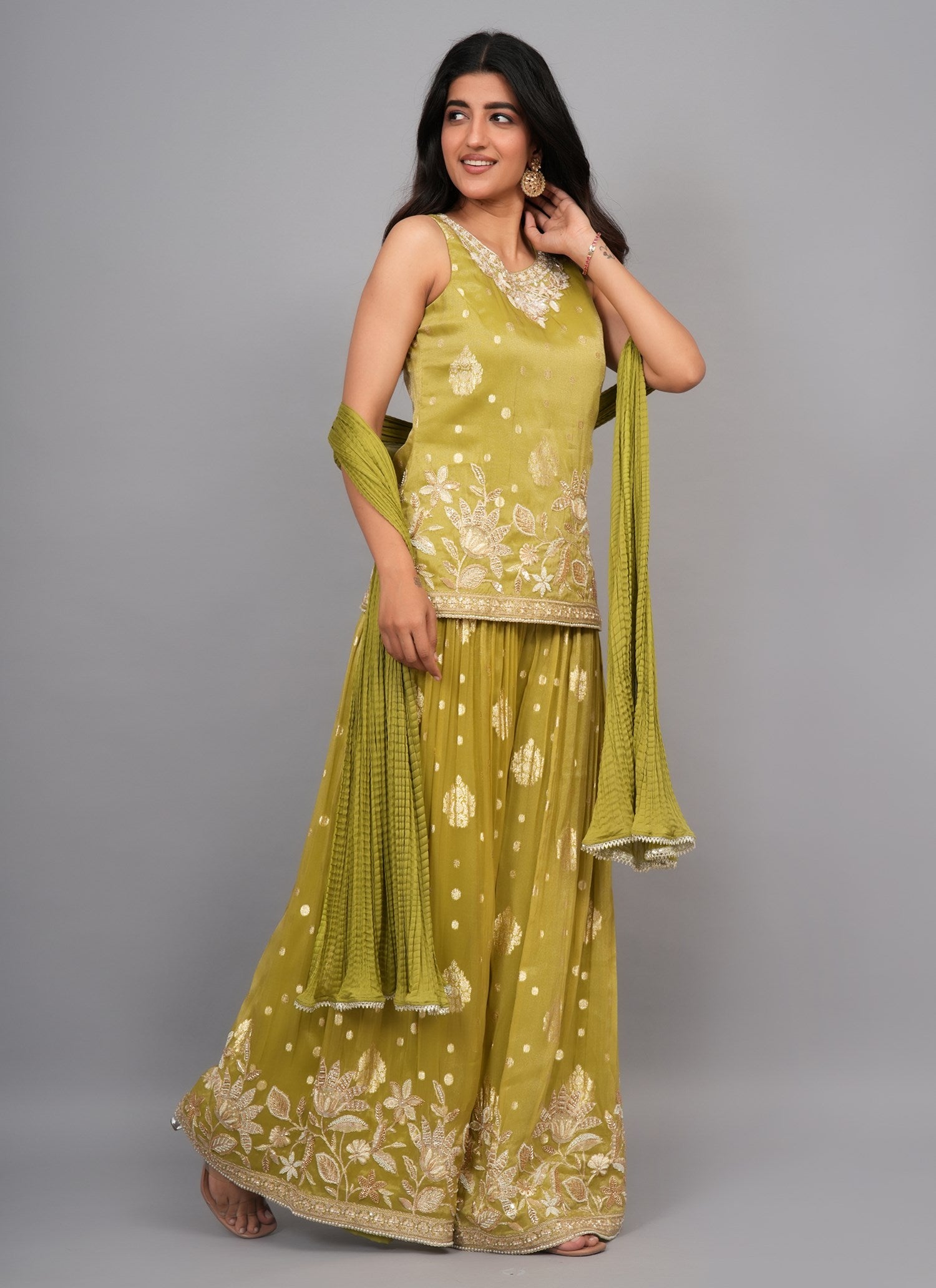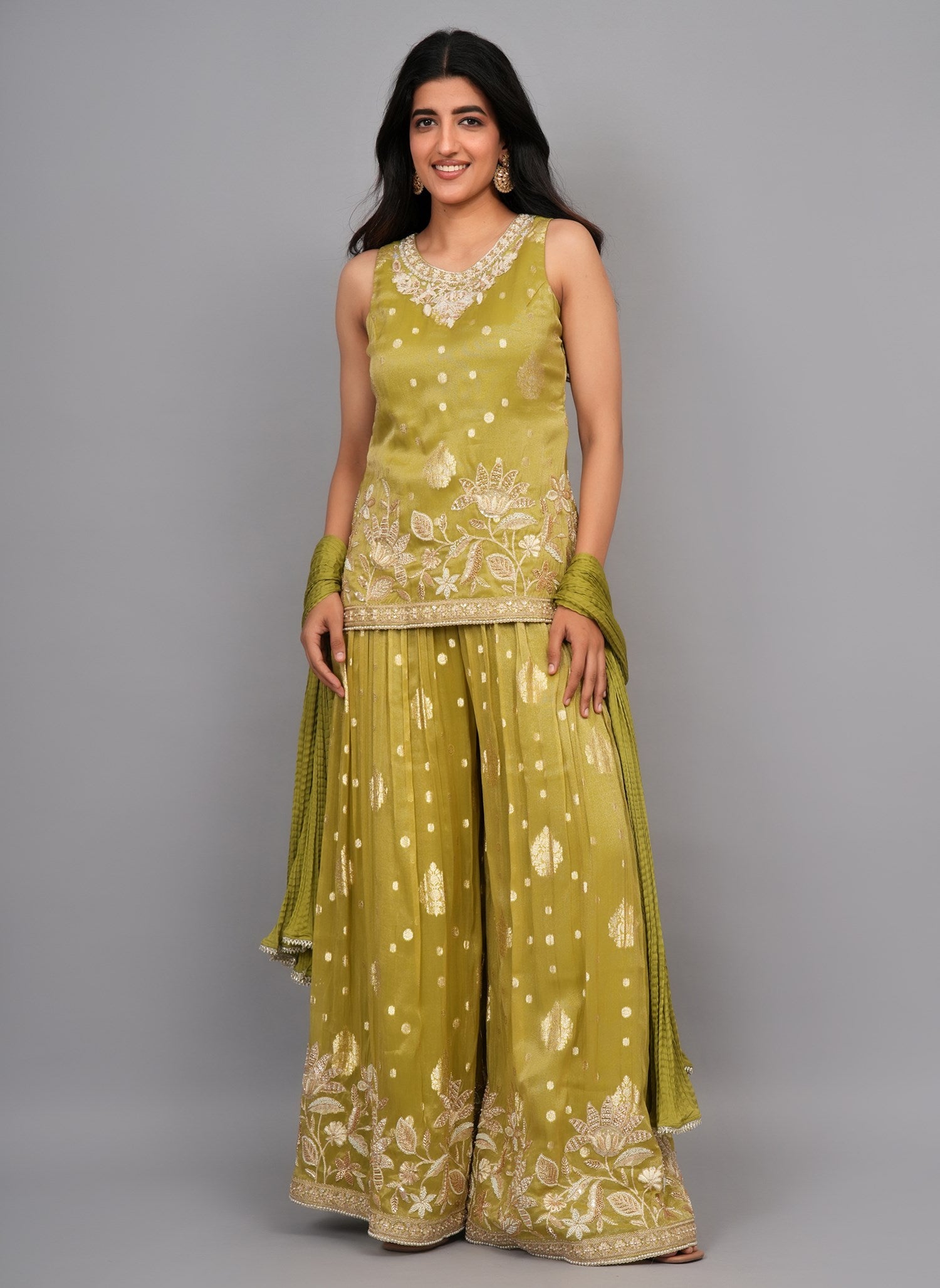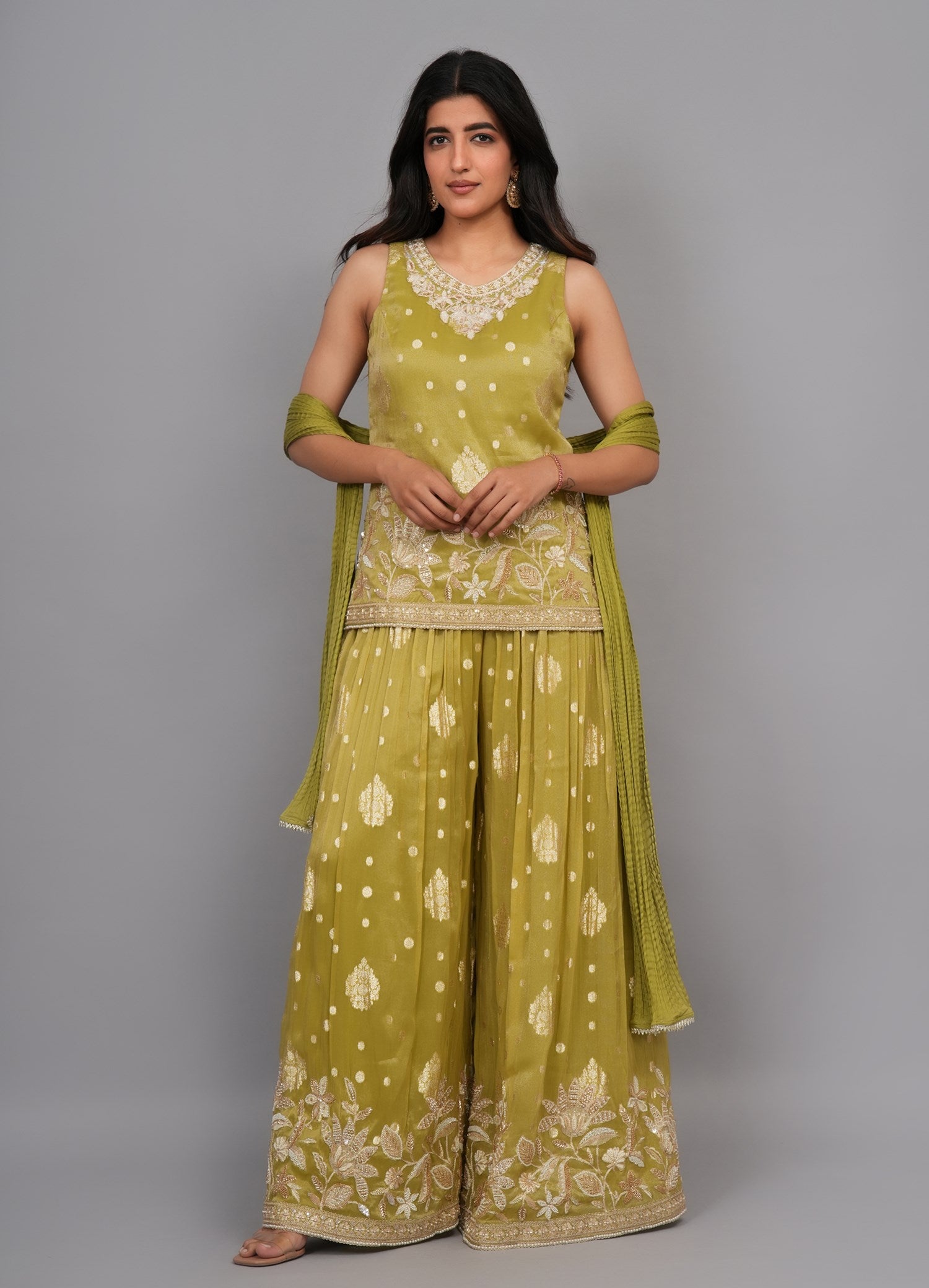 Kurti Color: Pista Green Kurti Fabric : Tissue Kurti Work : Cutdana & Pearl Dupatta Color : Pista Green Dupatta Fabric : Wrinkle Chiffon Dupatta Border: Lace Sharara Color : Pista Green Sharara Fabric : Tissue Sharara Work : Pearl & Cutdana Β |