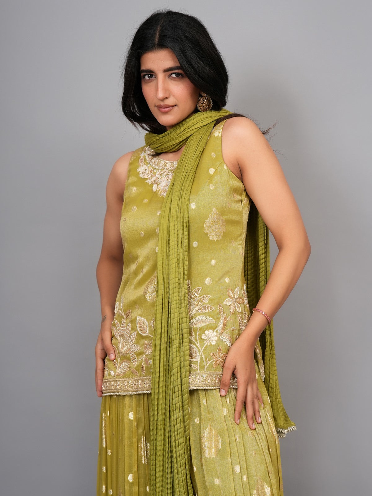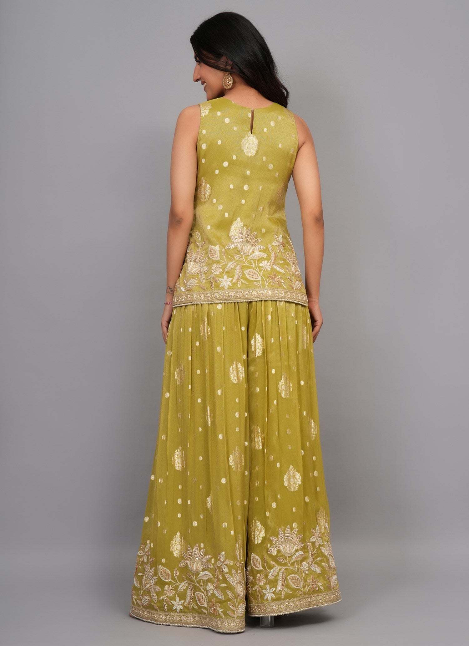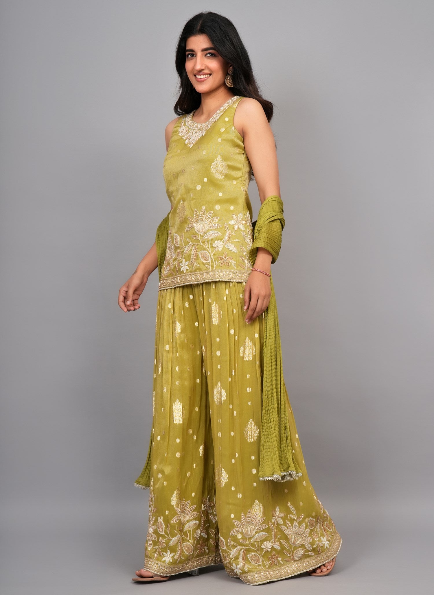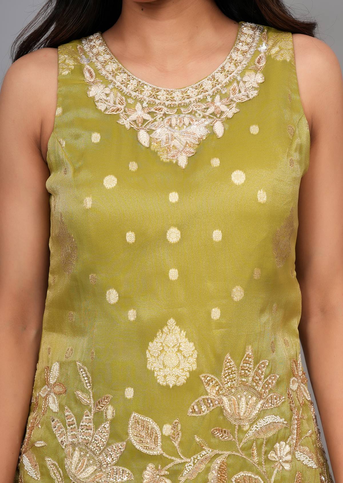 Kurti Color: Pista Green Kurti Fabric : Tissue Kurti Work : Cutdana & Pearl Dupatta Color : Pista Green Dupatta Fabric : Wrinkle Chiffon Dupatta Border: Lace Sharara Color : Pista Green Sharara Fabric : Tissue Sharara Work : Pearl & Cutdana Β |