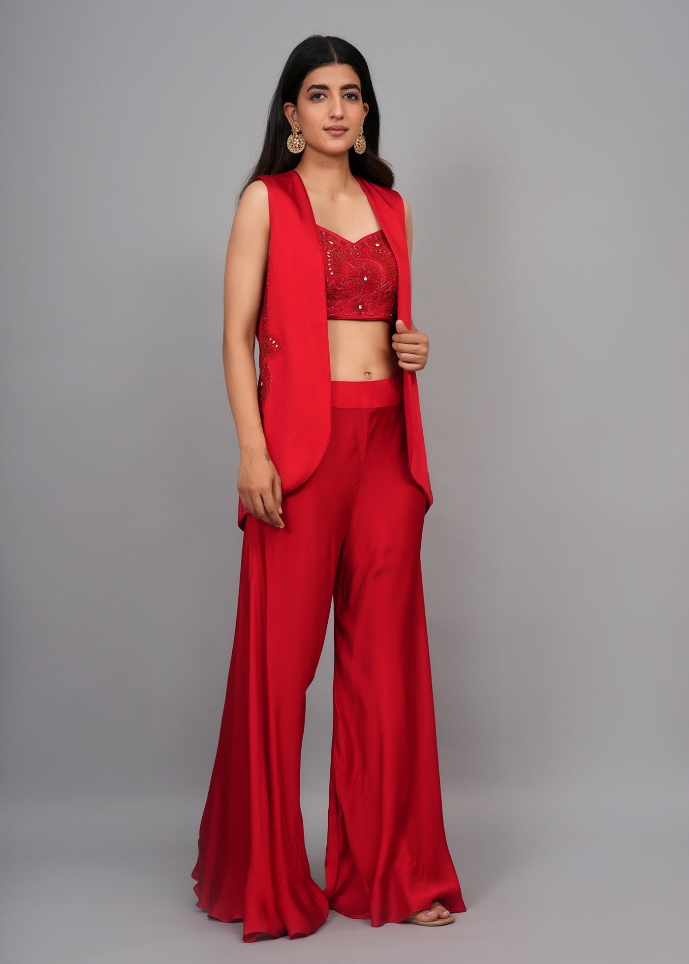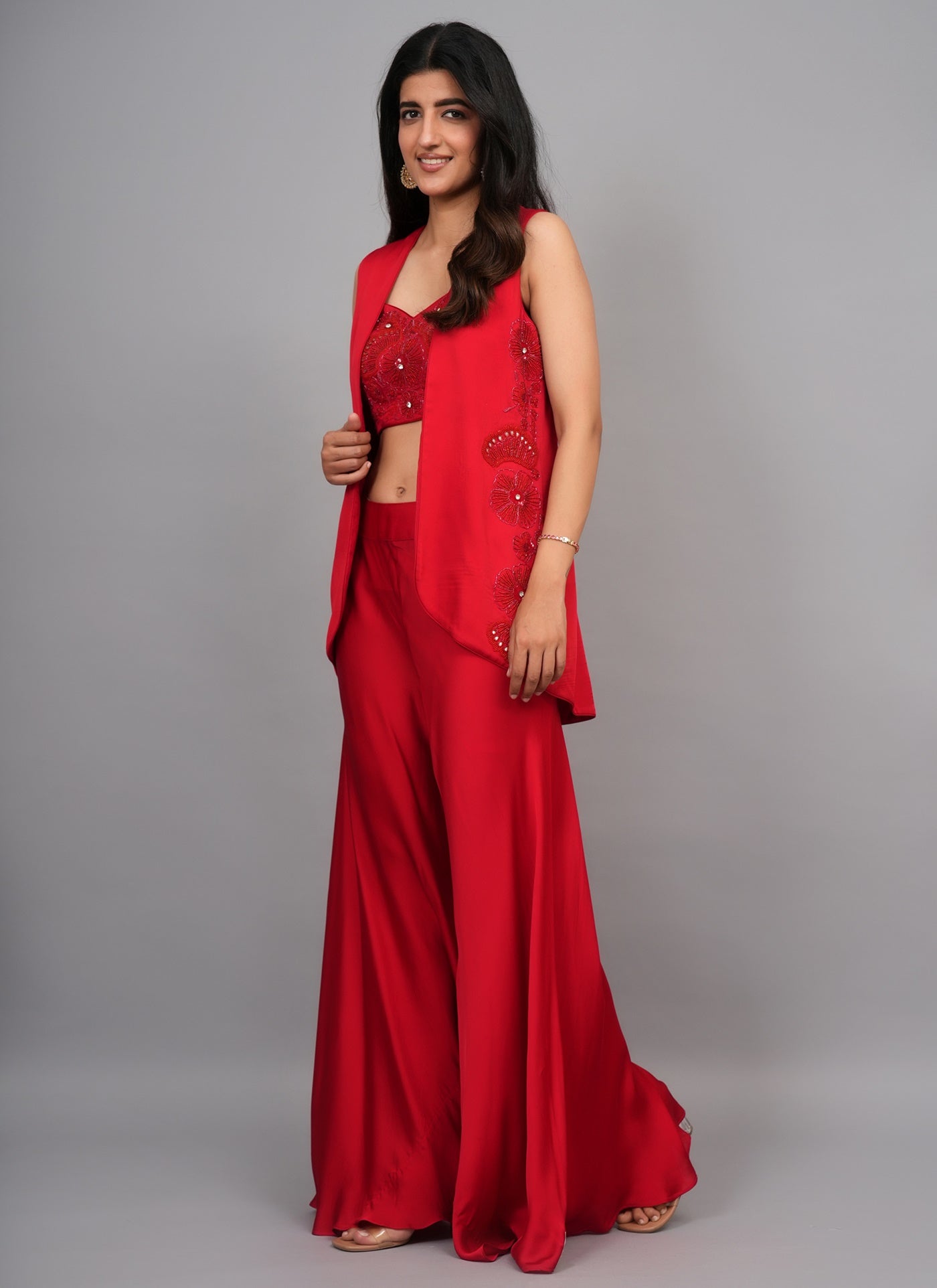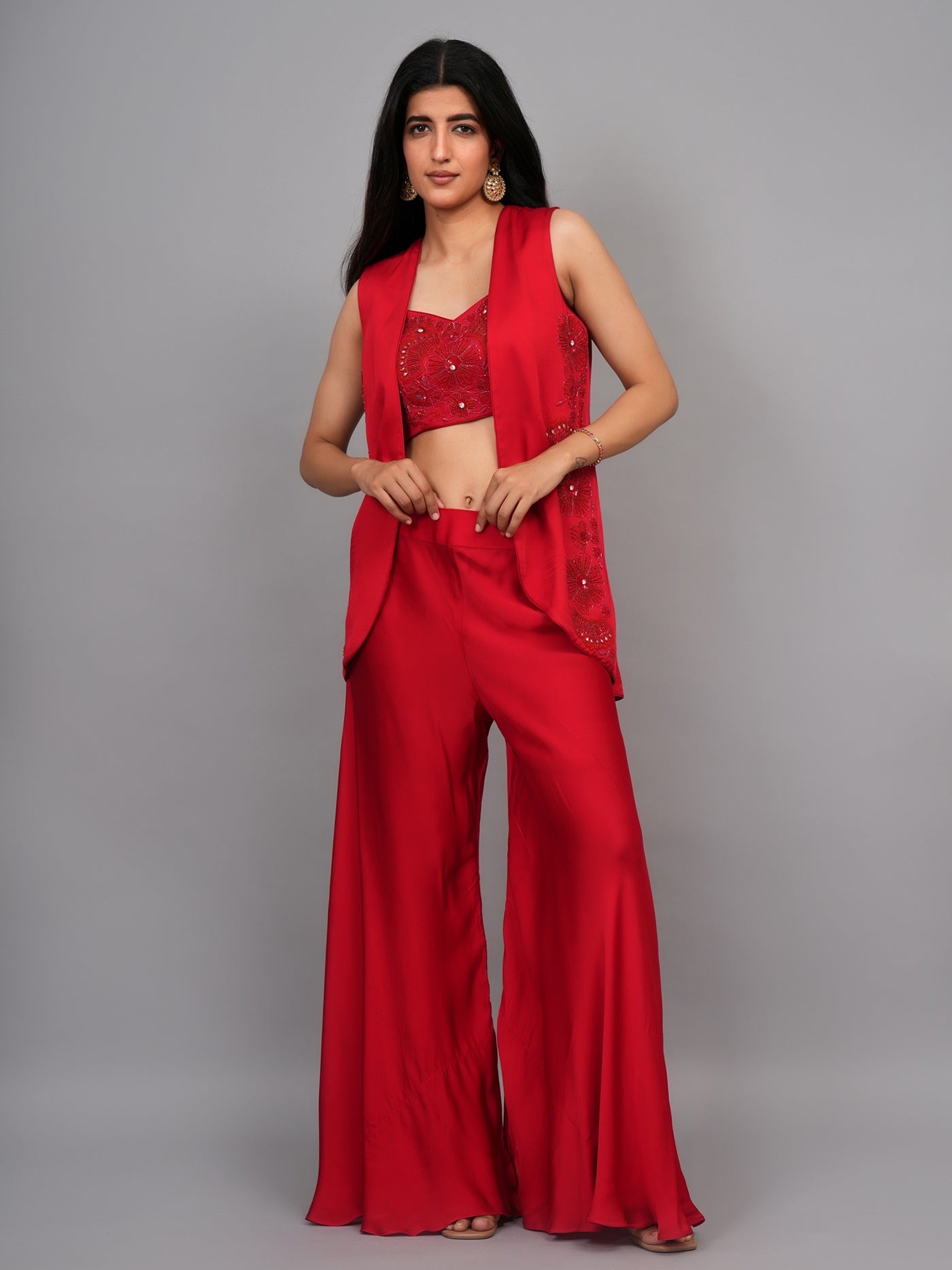 Jacket Color: Red Jacket Fabric : Satin Silk Jacket Work : Cutdana ,Moti , Sequine Blouse Color : Red Blouse Fabric : Satin Silk Blouse Work: Cutdana ,Moti , Sequine Divider Color : Red Divider Fabric : Satin Silk |