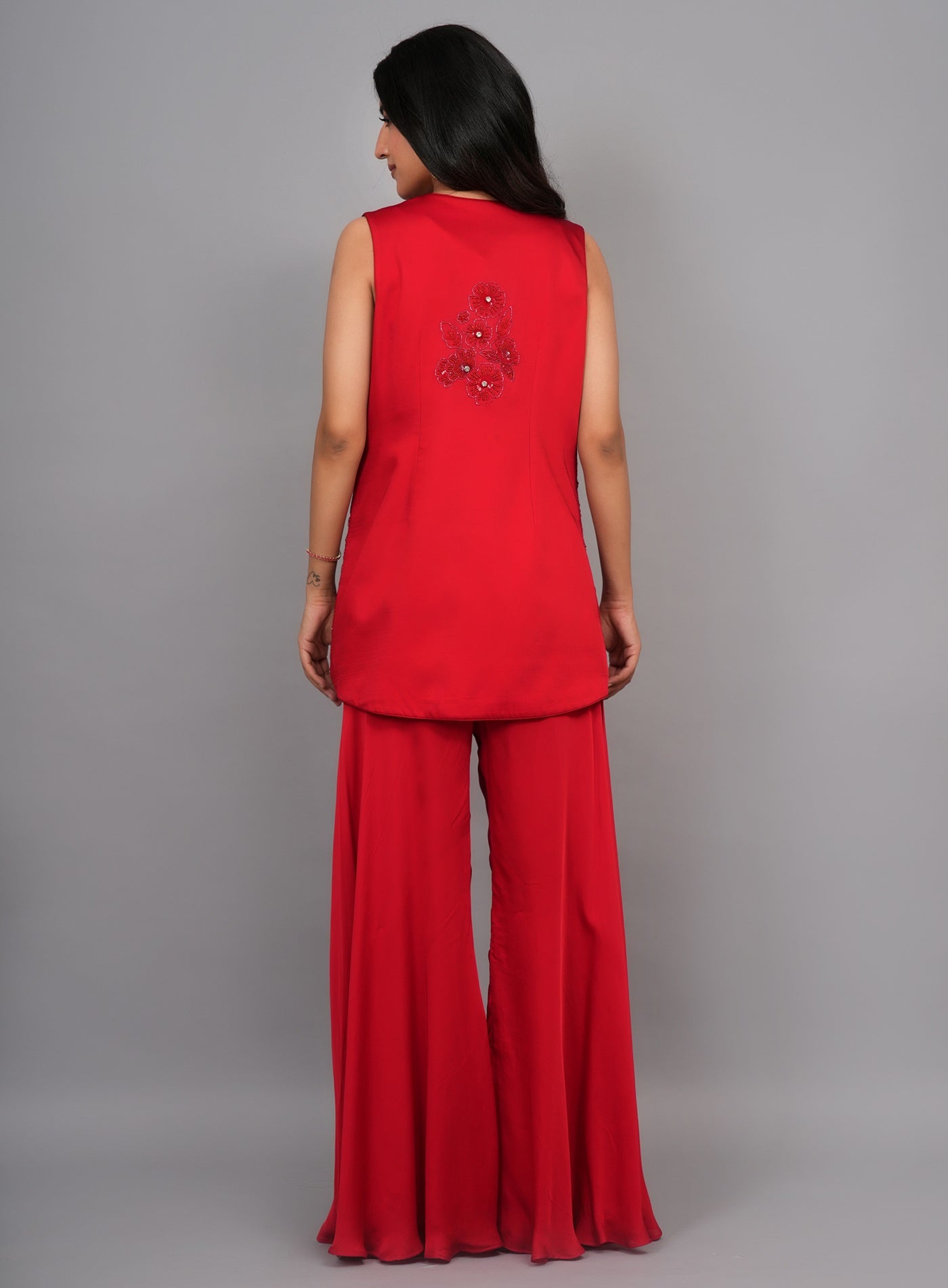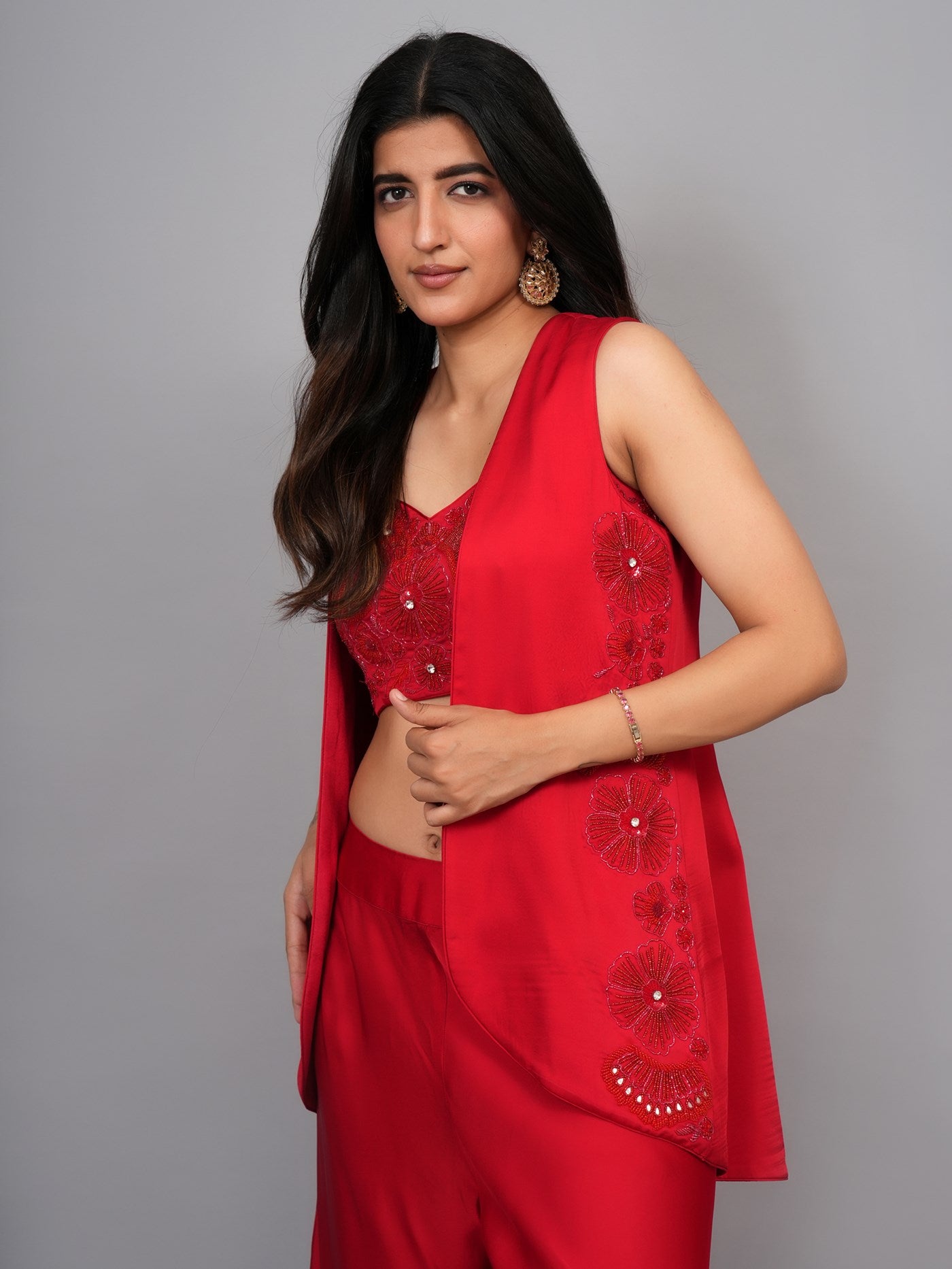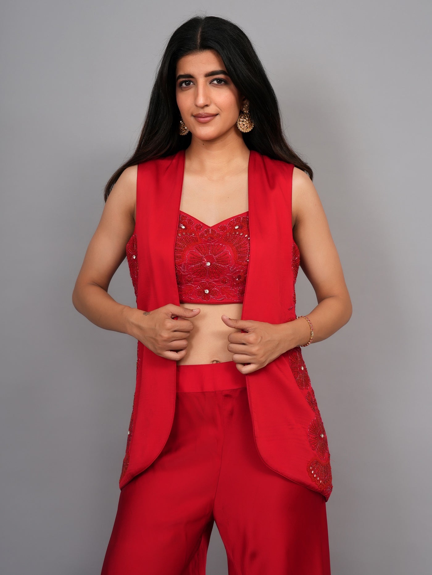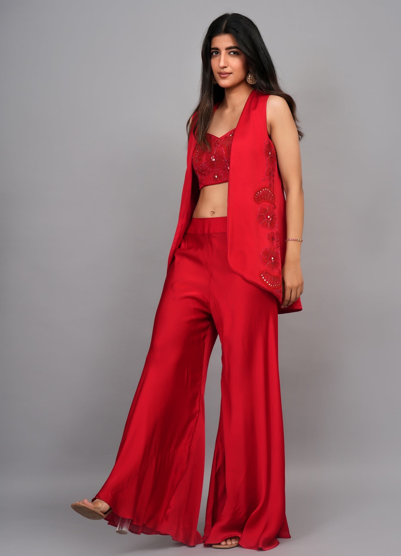 Jacket Color: Red Jacket Fabric : Satin Silk Jacket Work : Cutdana ,Moti , Sequine Blouse Color : Red Blouse Fabric : Satin Silk Blouse Work: Cutdana ,Moti , Sequine Divider Color : Red Divider Fabric : Satin Silk |