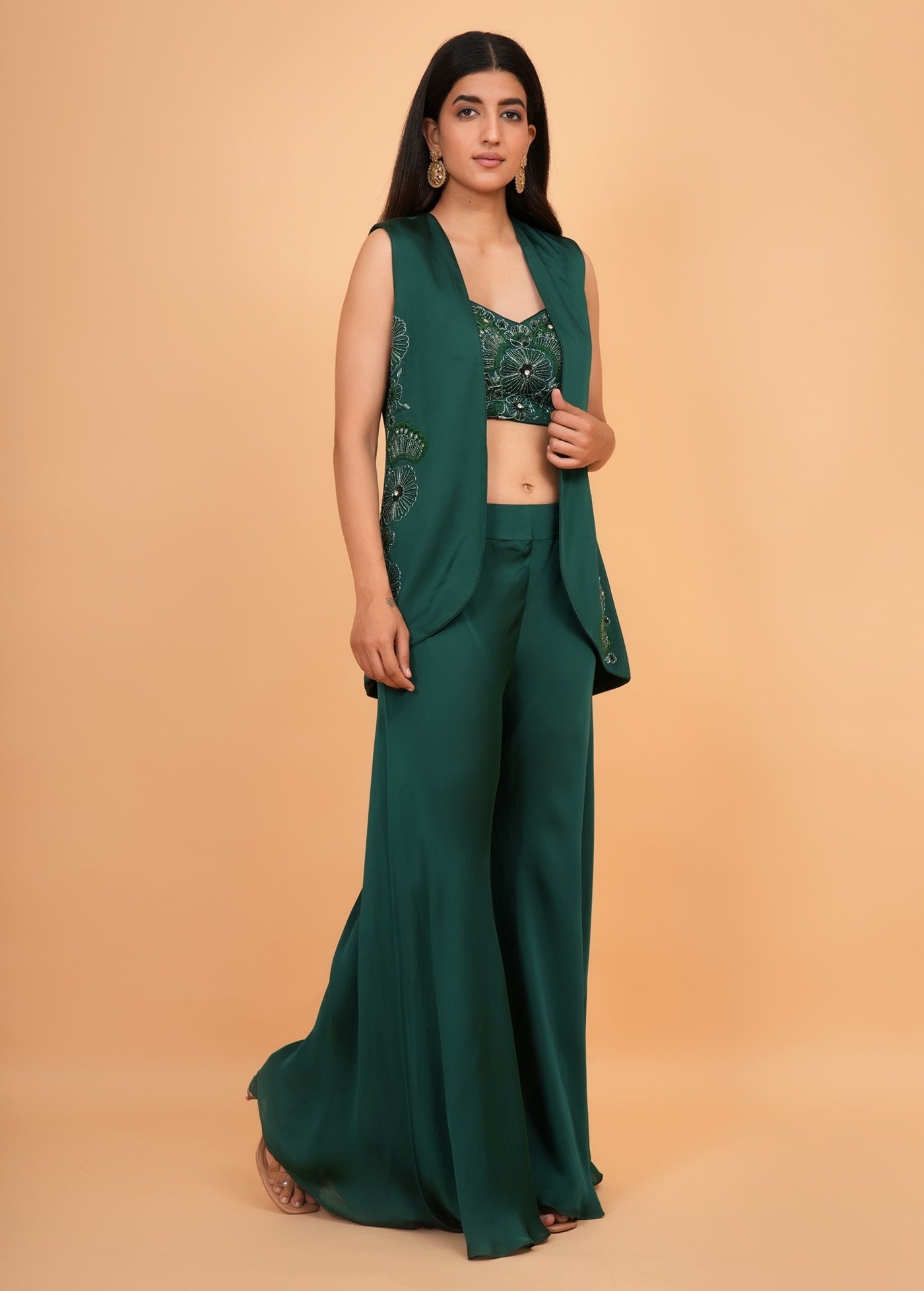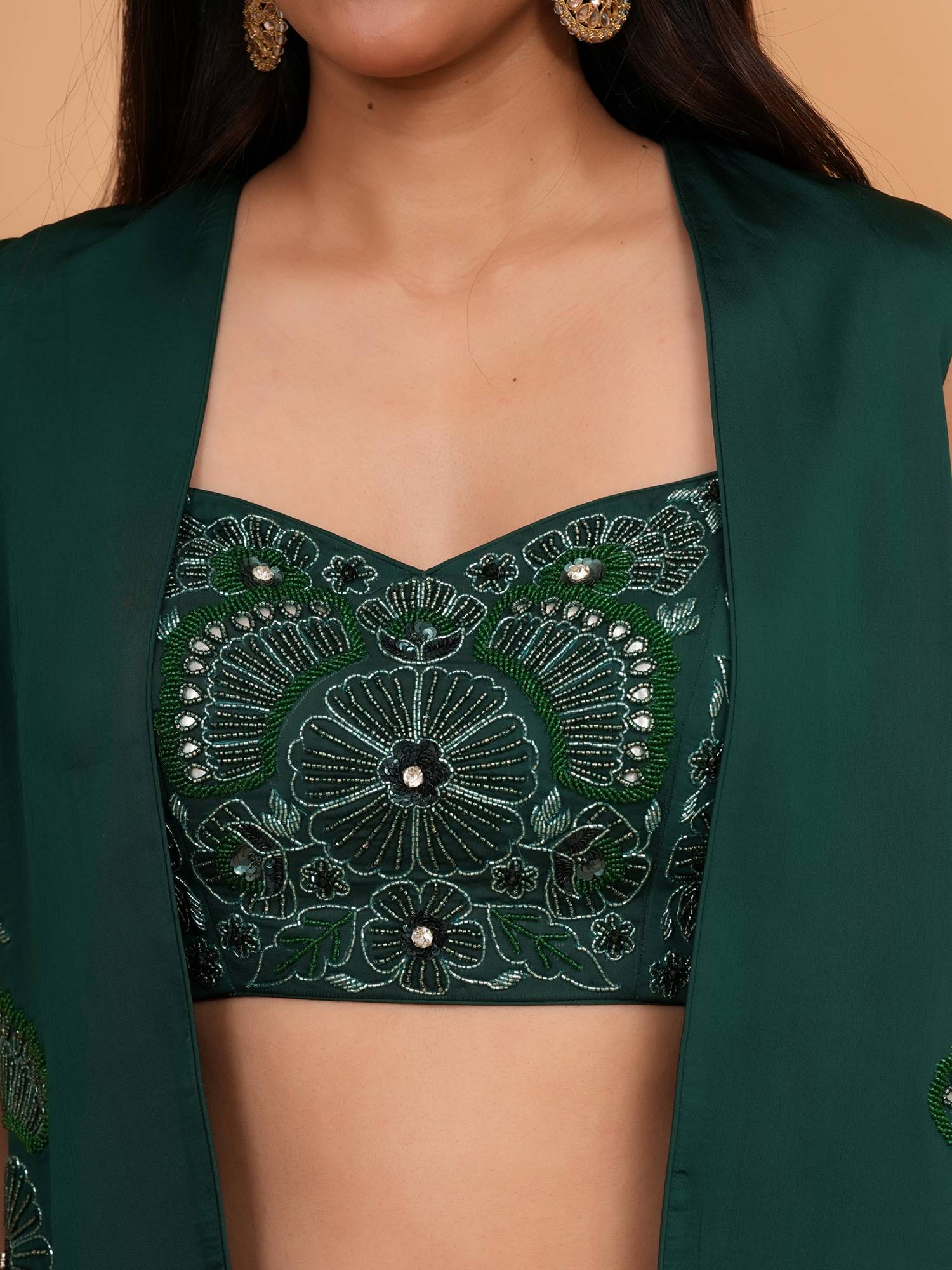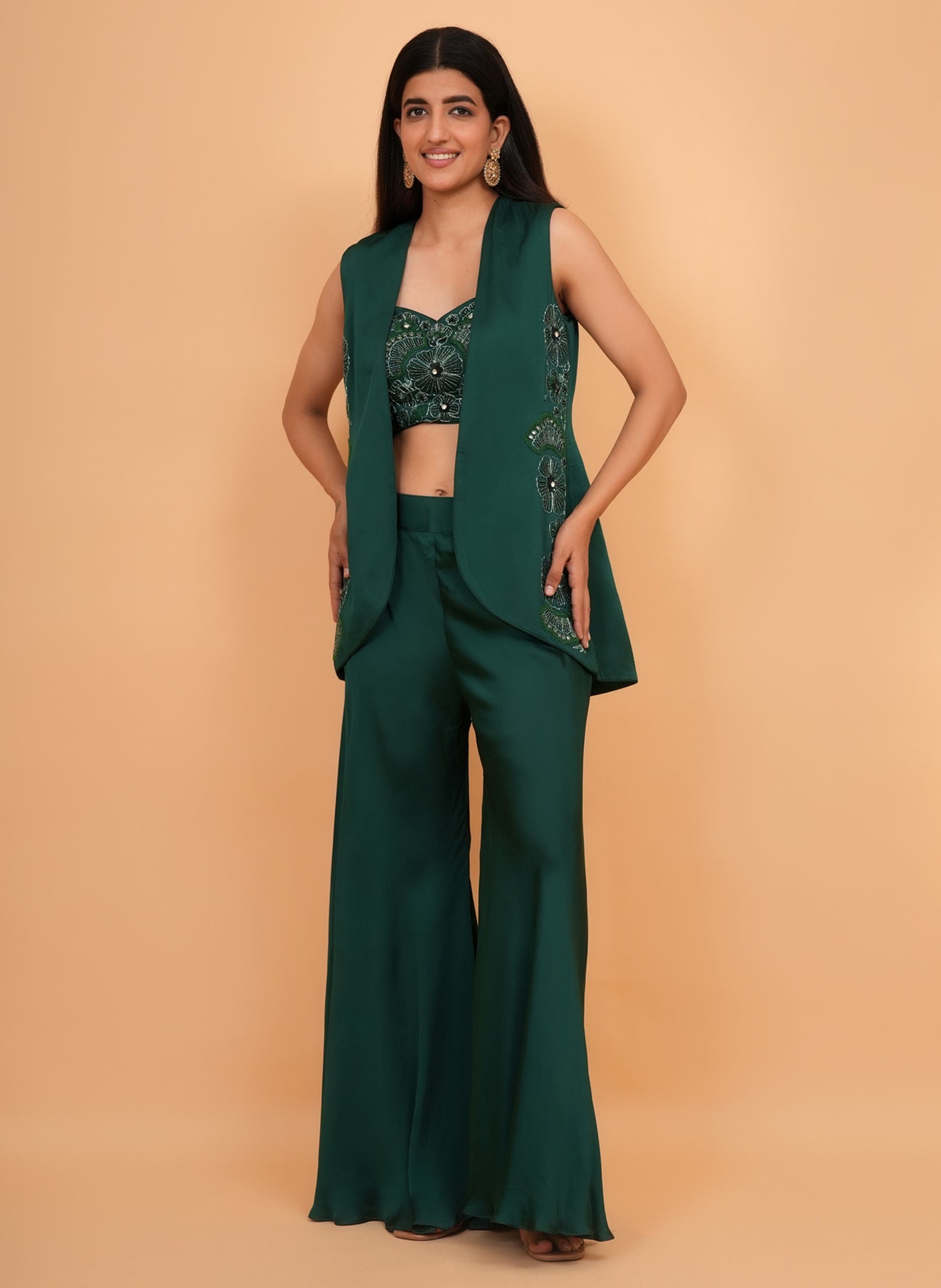 Jacket Color: Bottle Green Jacket Fabric : Satin Silk Jacket Work : Cutdana ,Moti , Sequine Blouse Color : Bottle Green Blouse Fabric : Satin Silk Blouse Work: Cutdana ,Moti , Sequine Divider Color : Bottle Green Divider Fabric : Satin Silk |