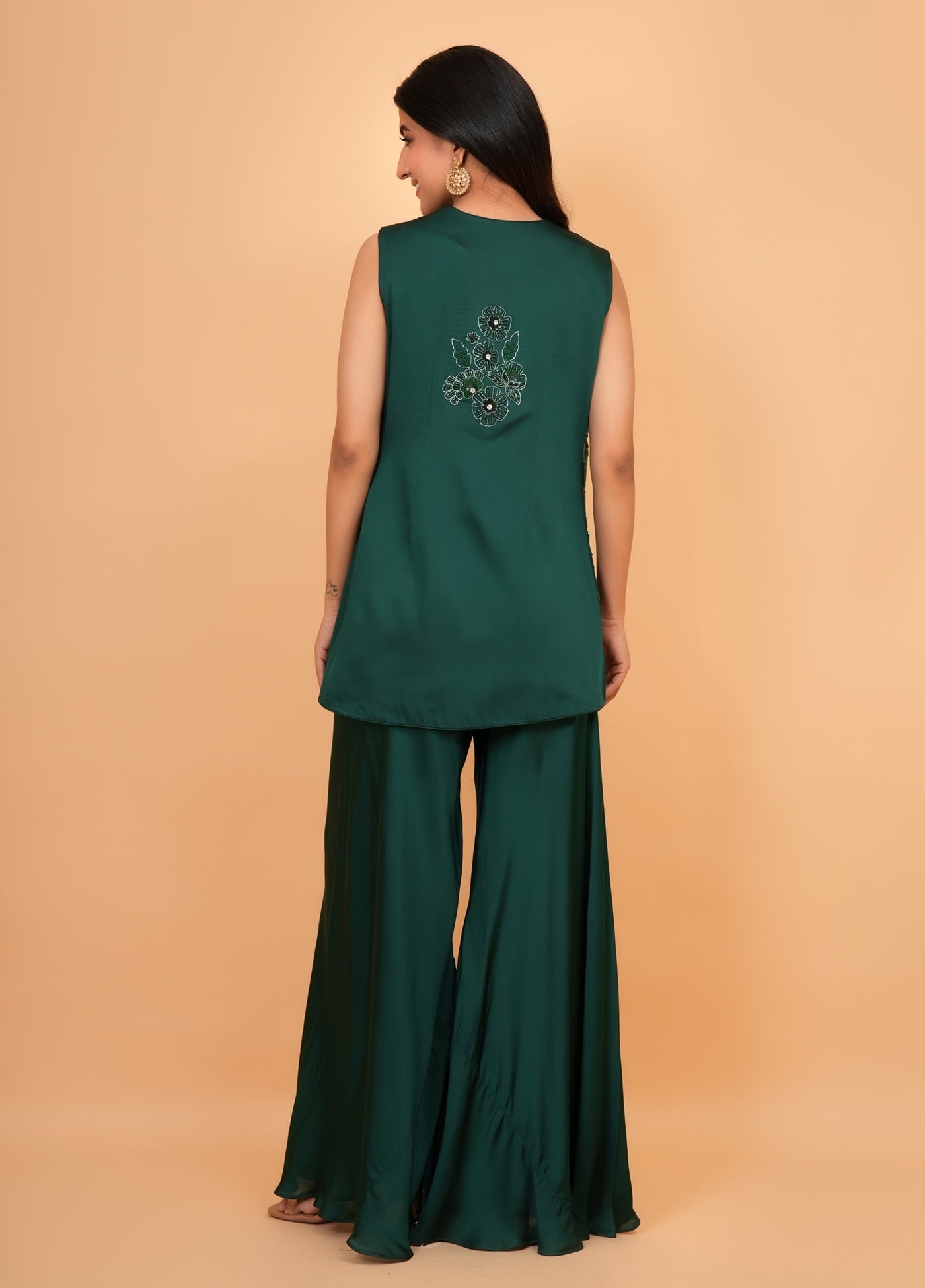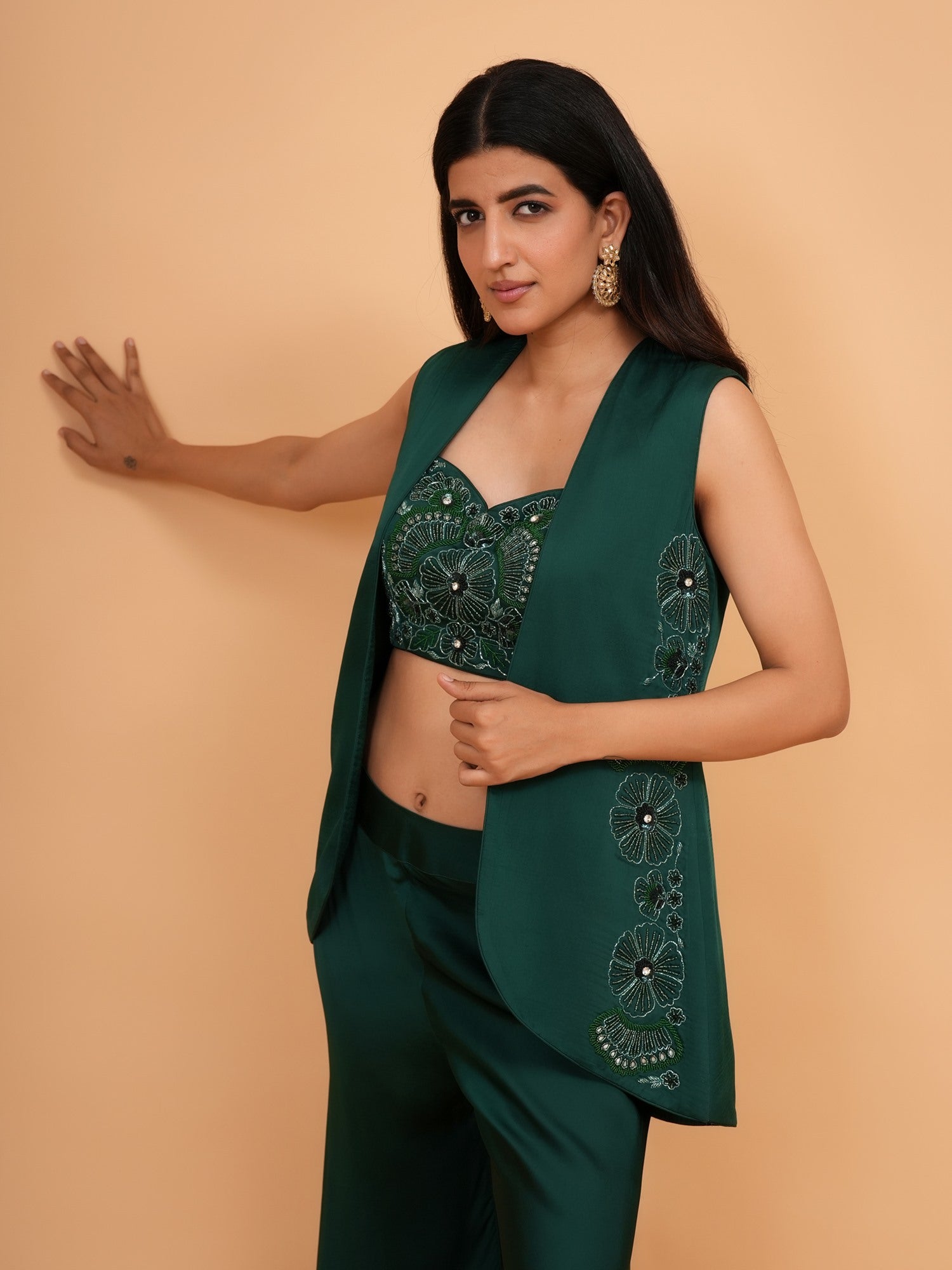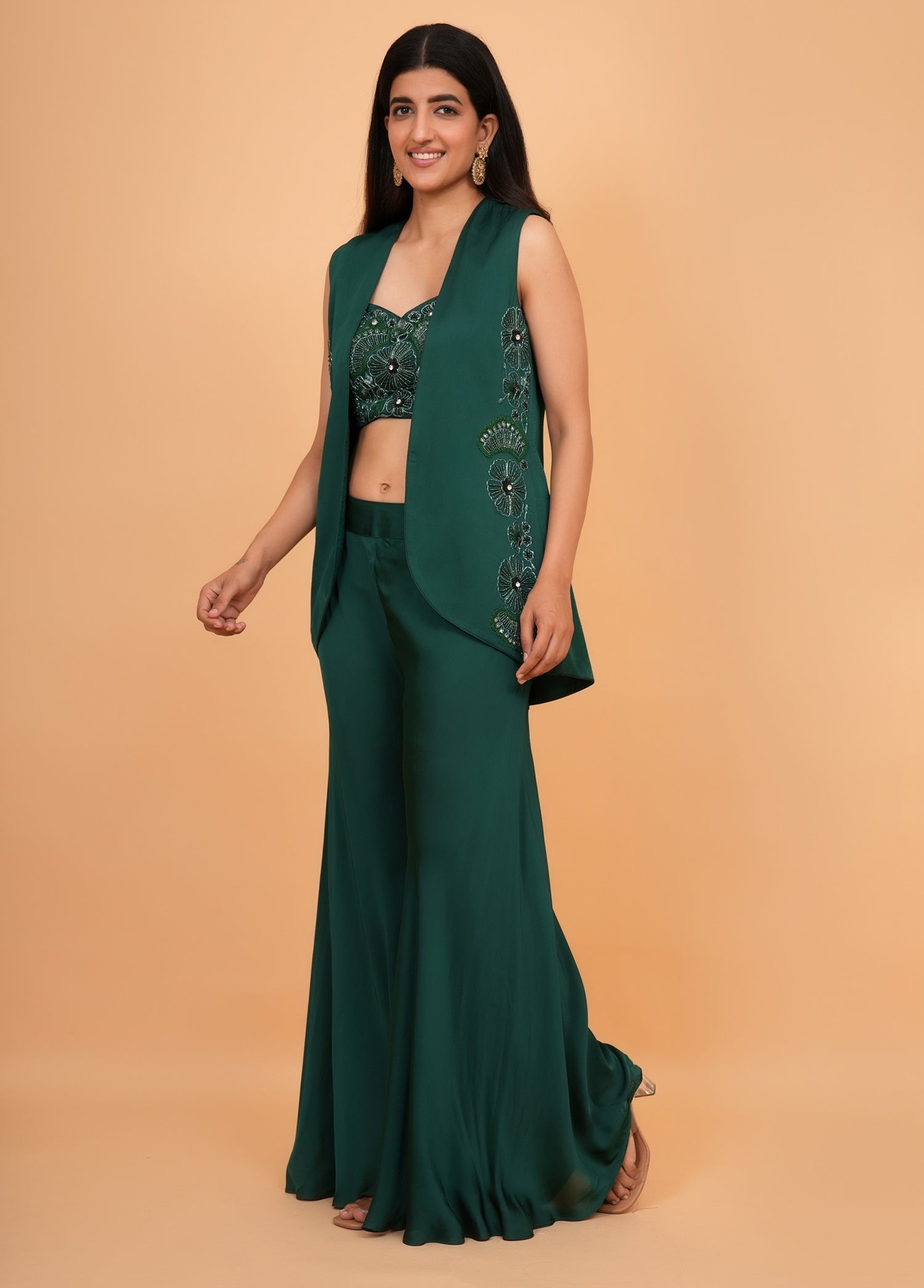 Jacket Color: Bottle Green Jacket Fabric : Satin Silk Jacket Work : Cutdana ,Moti , Sequine Blouse Color : Bottle Green Blouse Fabric : Satin Silk Blouse Work: Cutdana ,Moti , Sequine Divider Color : Bottle Green Divider Fabric : Satin Silk |