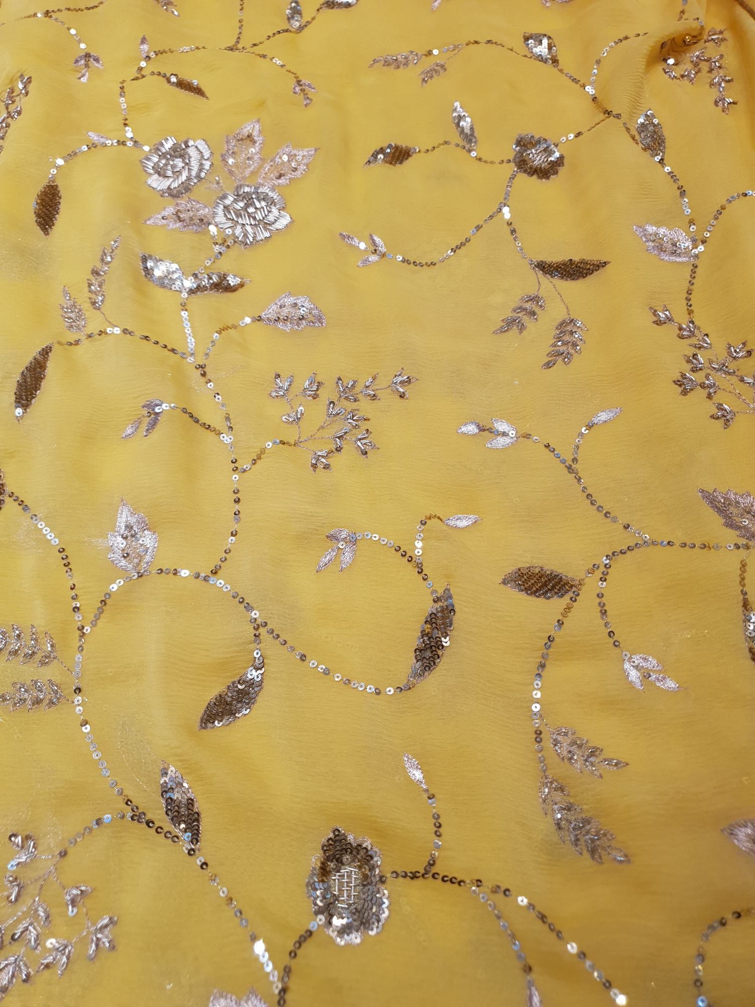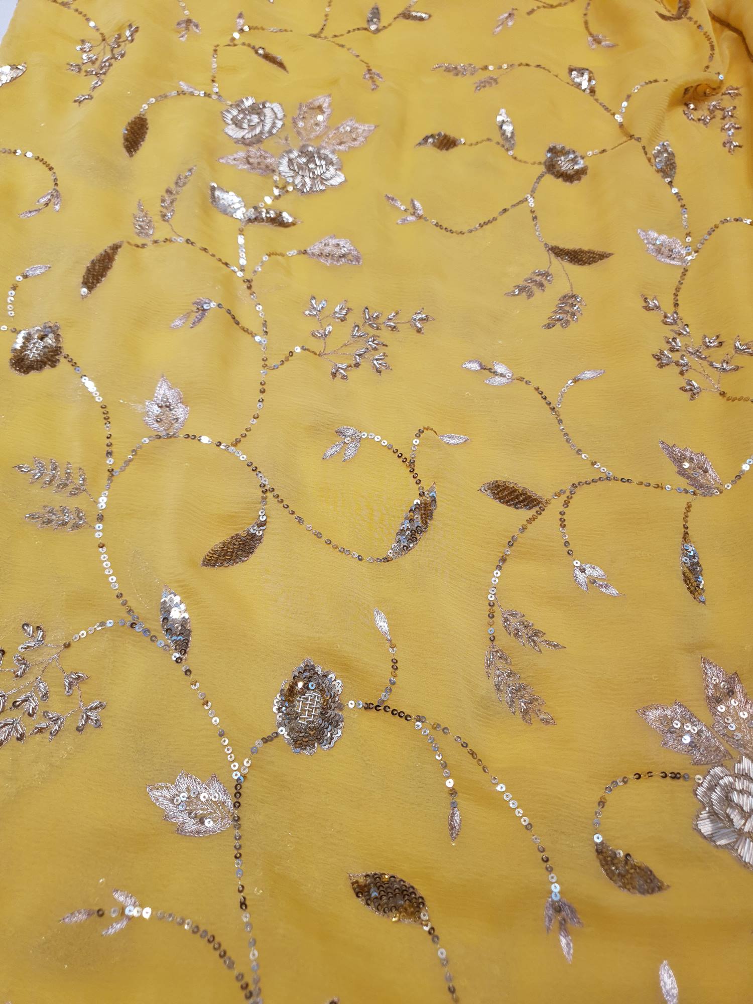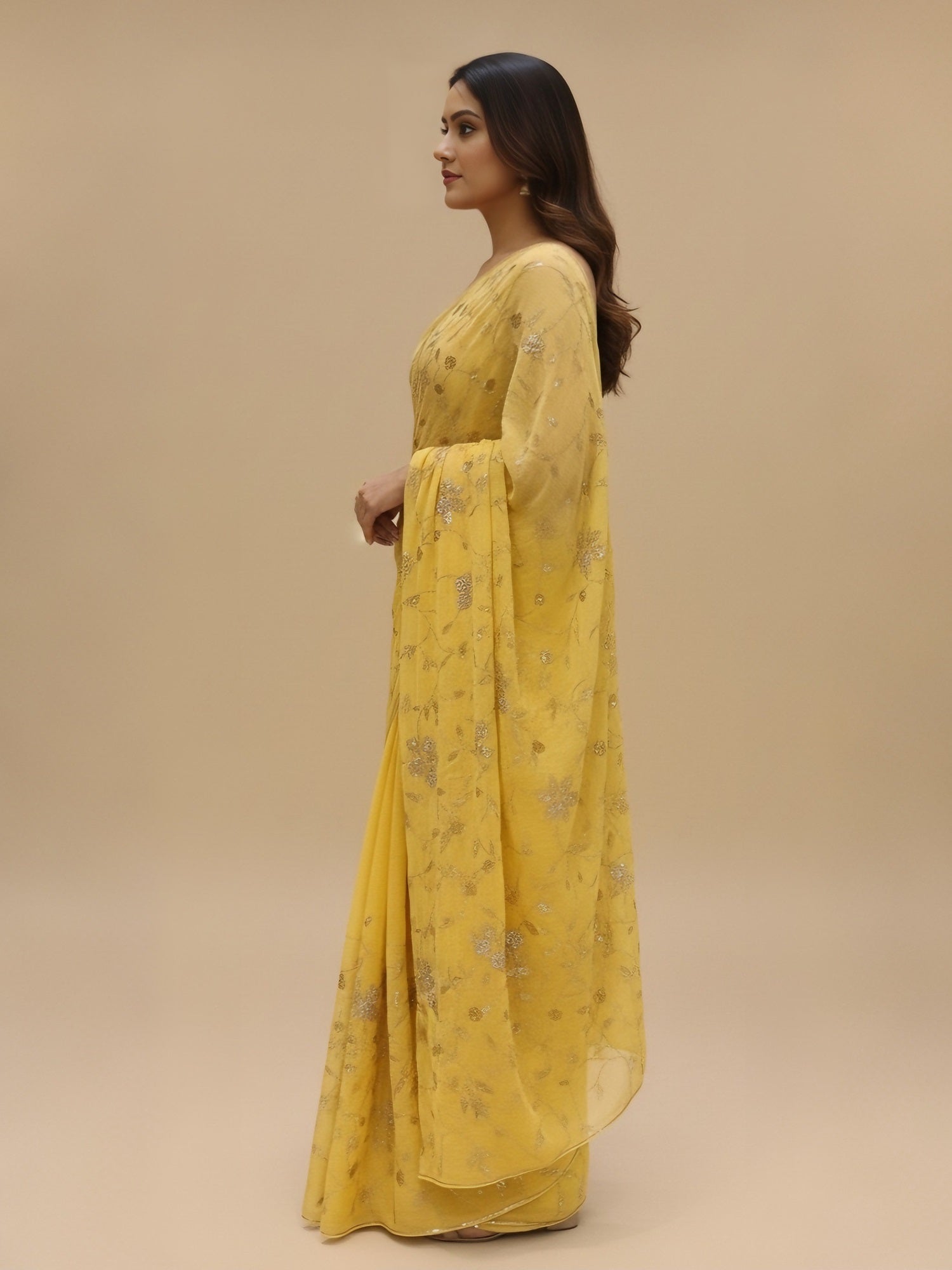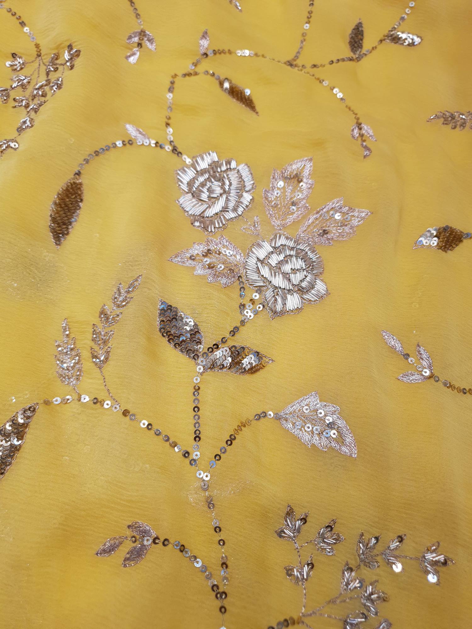 Elevate your traditional wardrobe with the Ranas Pure Chiffon Saree, meticulously crafted in vibrant yellow. Featuring exquisite Aari Tari and Zardosi embroidery, this saree blends delicate artistry with lightweight chiffon fabric for graceful draping. Included blouse fabric allows for a perfect custom fit, ensuring both elegance and comfort for special occasions.