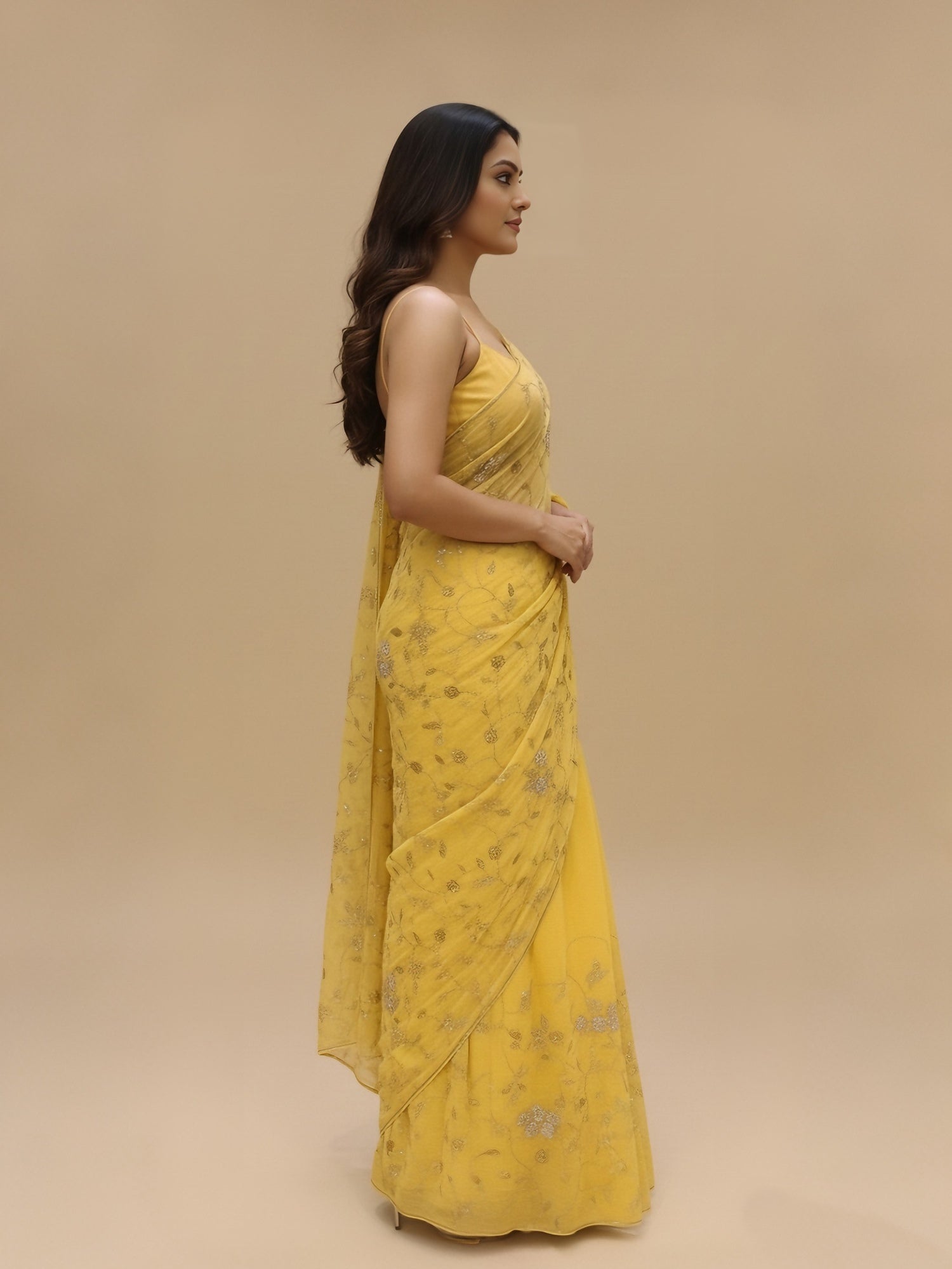 Saree Color : Yellow Saree Fabric : Pure Chiffon Saree Work : Aari , Tari & Zardosi Blouse Color : Yellow Blouse Fabric : Crepe Blouse Work : Aari , Tari & Zardosi |