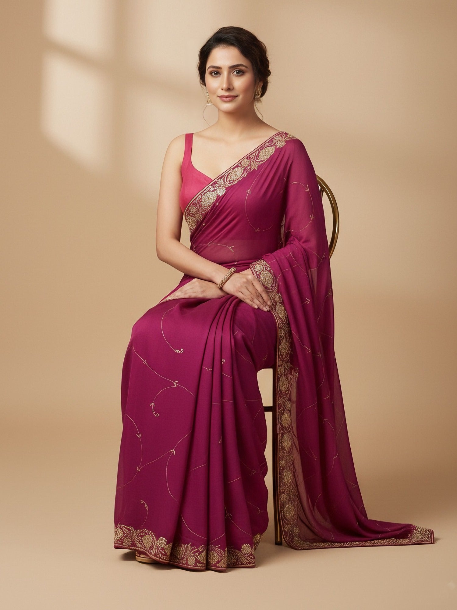 Elevate your festive wardrobe with the Ranas Pure Chiffon Party Wear Saree. Crafted in lightweight chiffon, it features intricate aari, sequin, cutdana, and resham embroidery that adds elegant texture and shimmer. This saree comes with matching blouse fabric for a coordinated, stylish look perfect for parties and special occasions. Combining traditional craftsmanship with contemporary trends, it offers both comfort and sophistication in one exquisite ensemble.