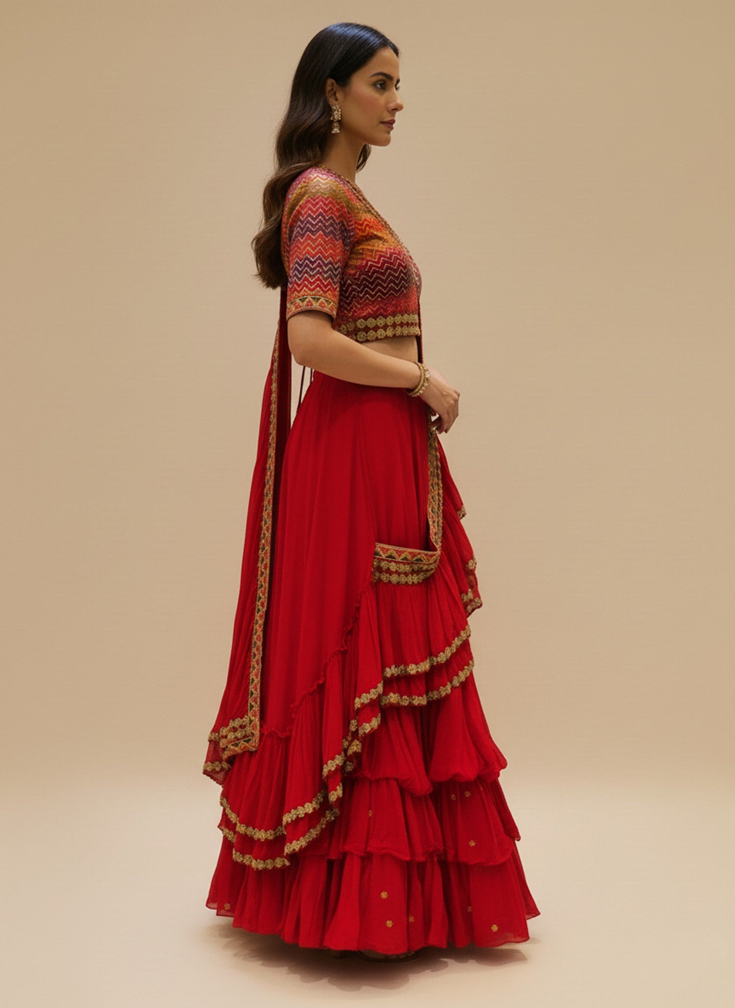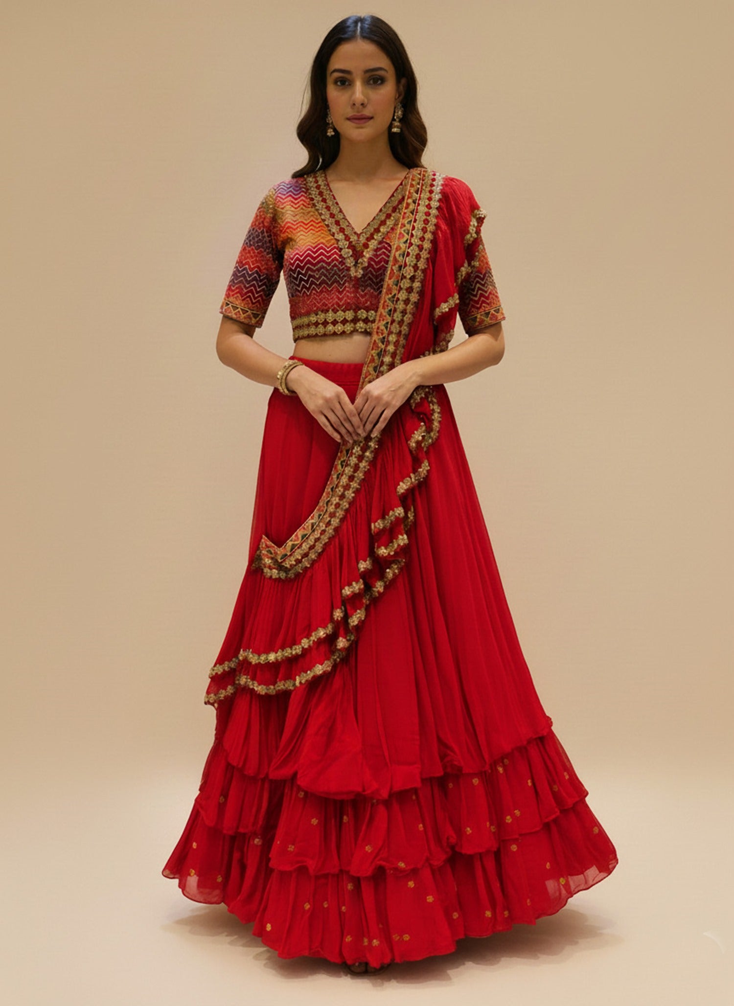 Lehenga Color : Red Lehenga Fabric : Georgette Lehenga Work : Sequine , Zardosi, Resham Dupatta Color : Red Dupatta Fabric : Georgette Dupatta Work : Sequine , Zardosi, Resham Blouse Color : Red Blouse Fabric : Silk Blouse Work : Sequine , Zardosi, Resham |