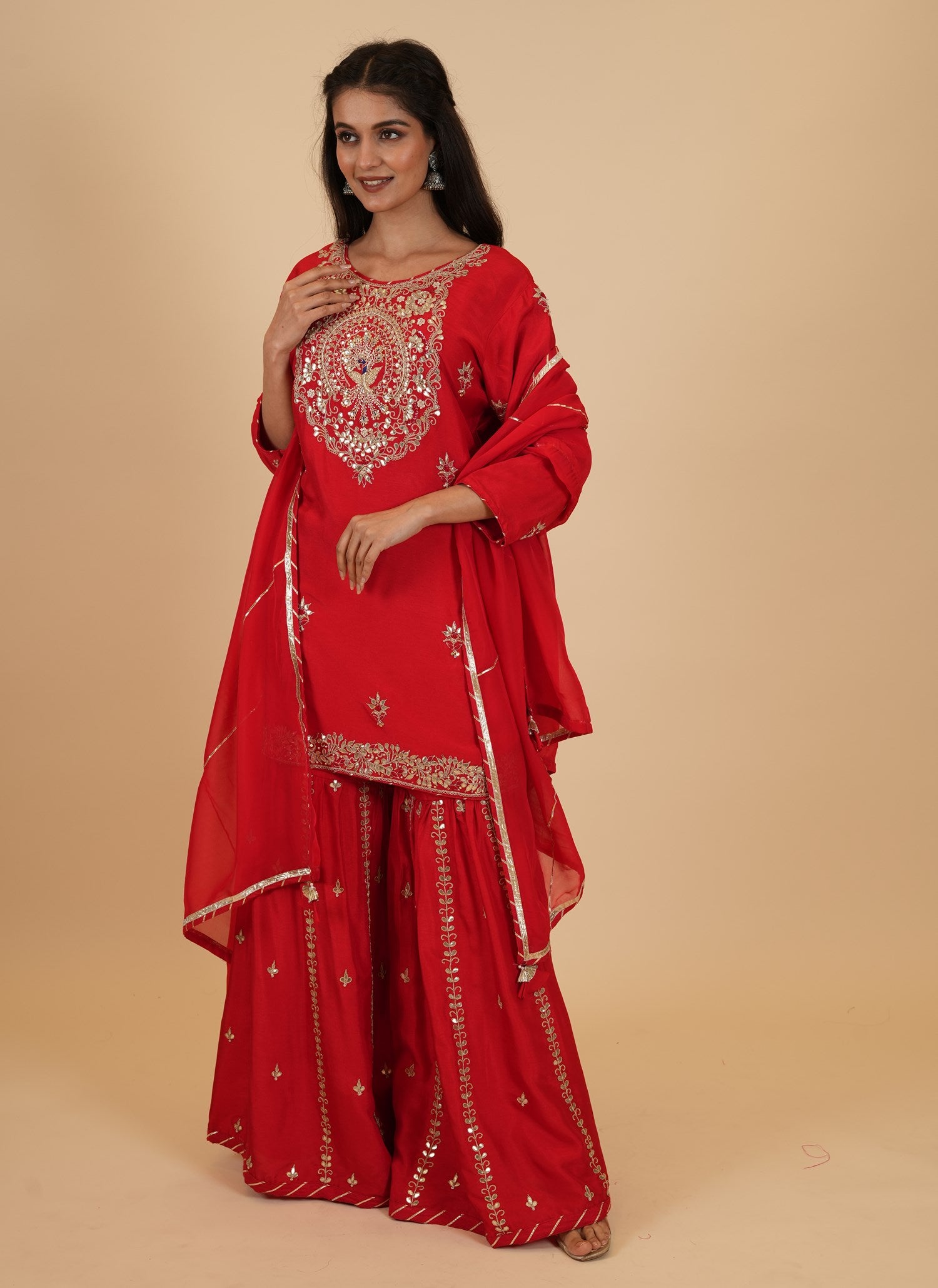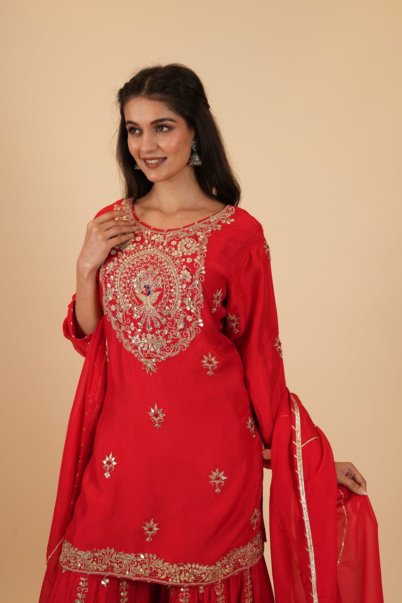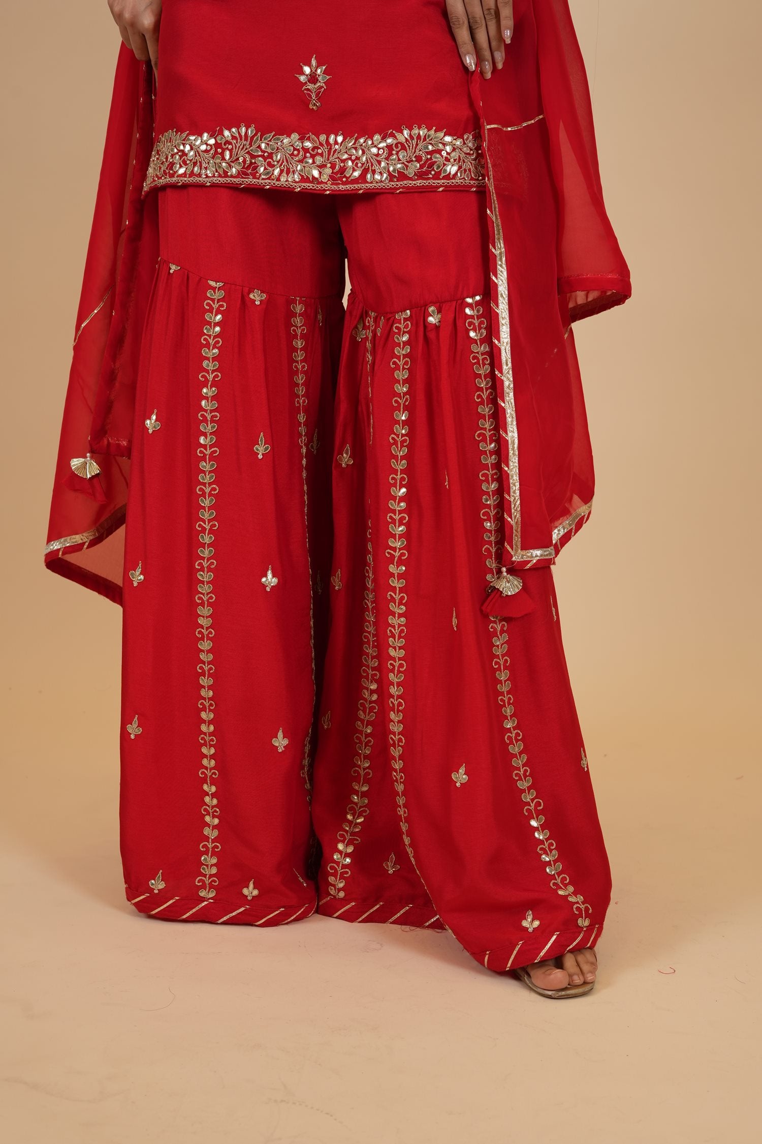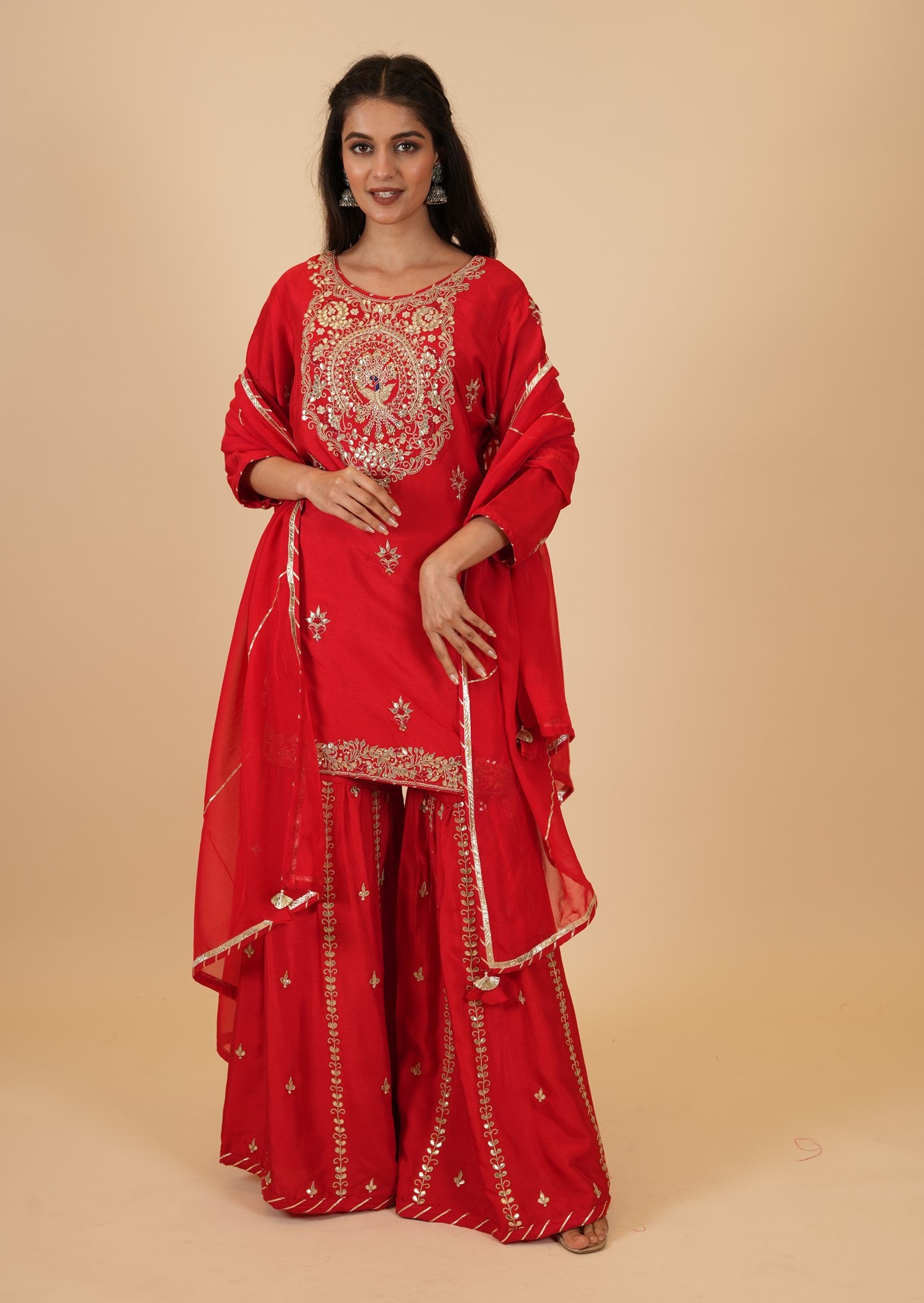 | Kurta Color : Red Kurta Fabric : Silk Kurta Work : Gota Patti , Zardosi, Moti, Sequine, Resham Dupatta Color : Red Dupatta Fabric : Art Organza Dupatta Work : Sikiya Gota Dupatta Border : Magzi Finishing Bottom Type : Sharara Sharara Color : Red Sharara Fabric : Silk Sharara Work : Gota Patti , Moti |