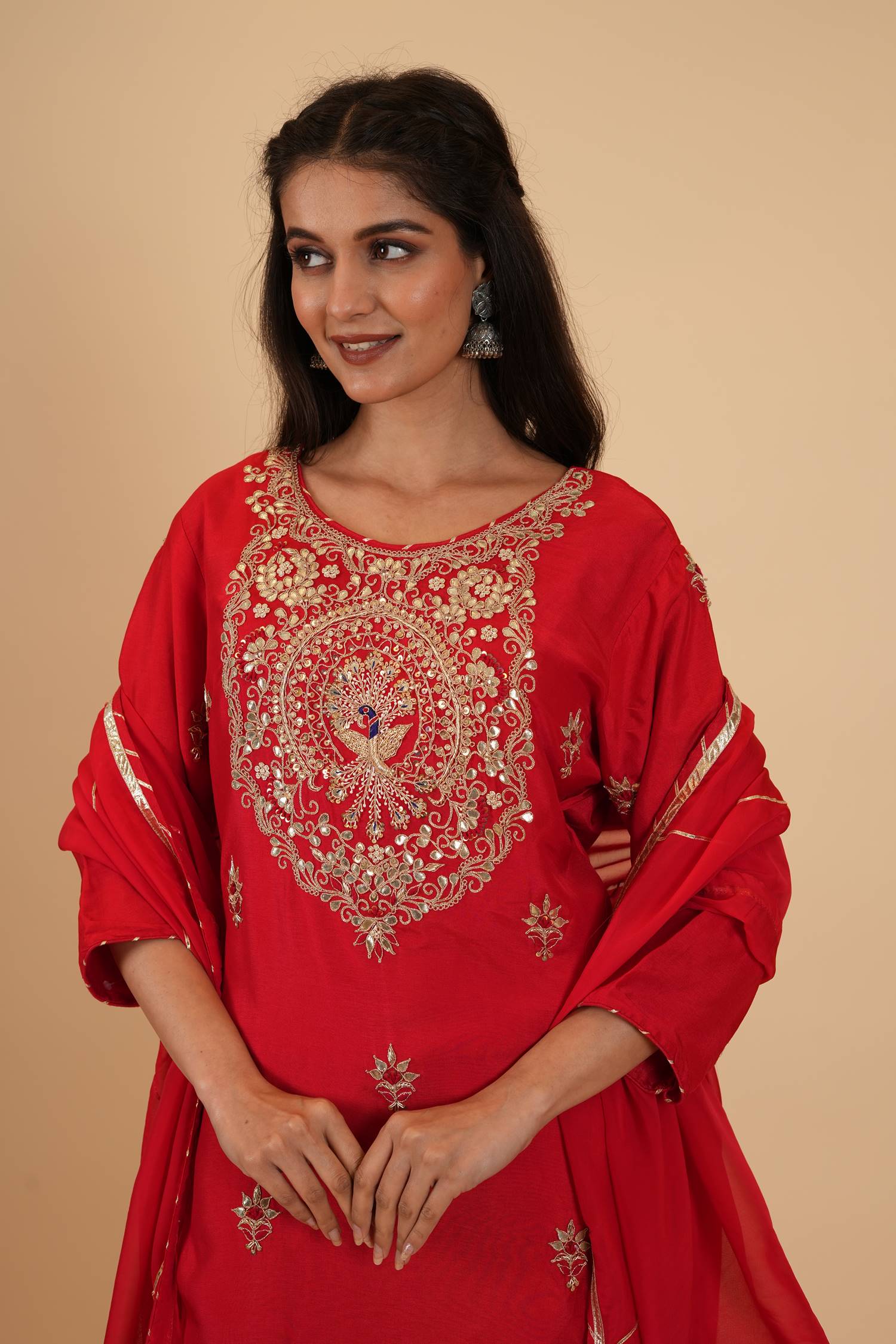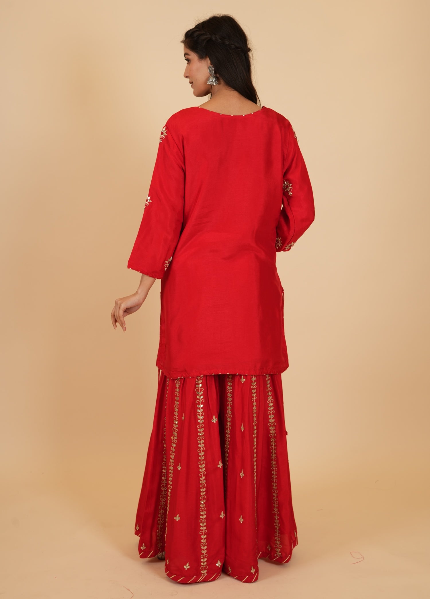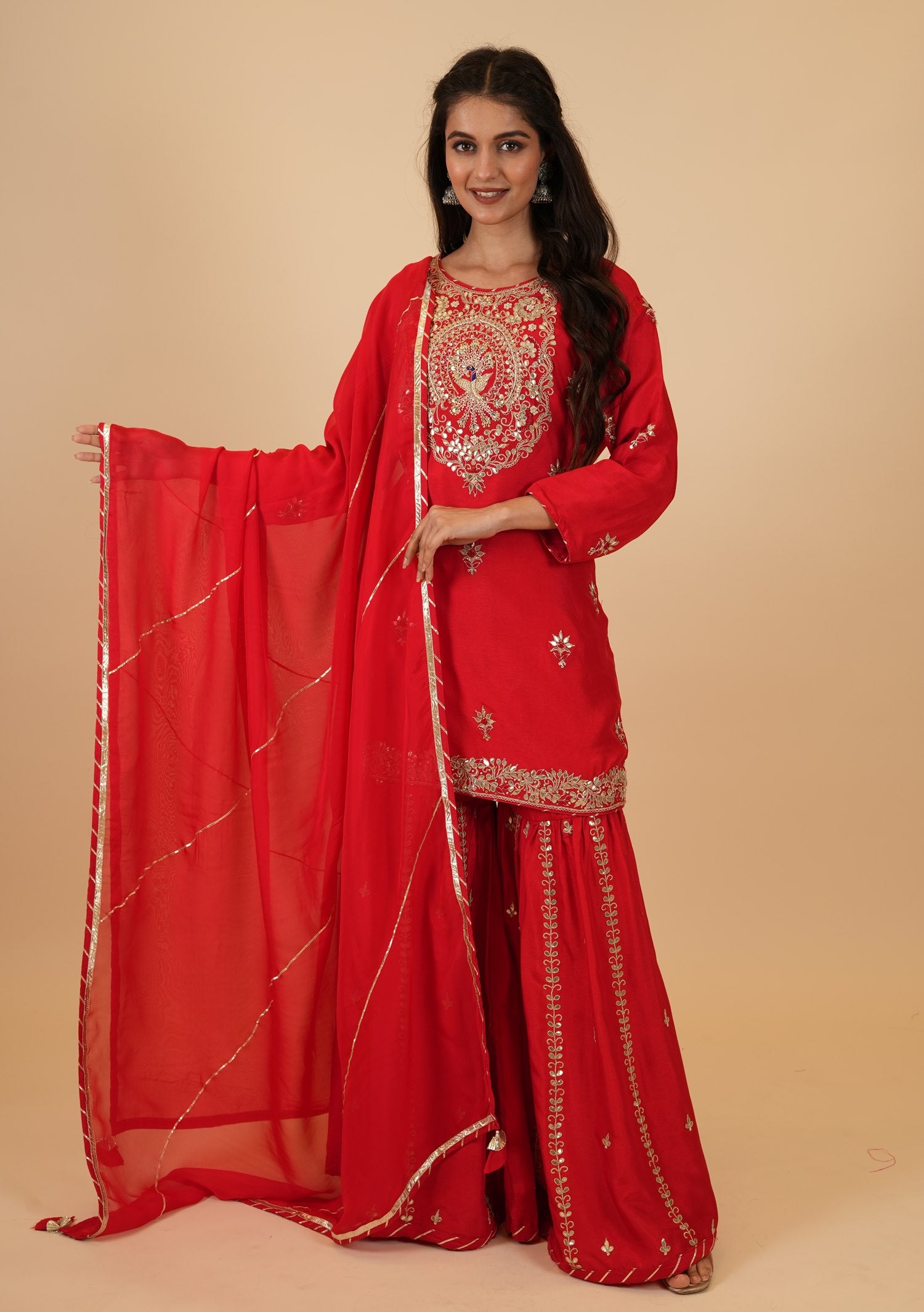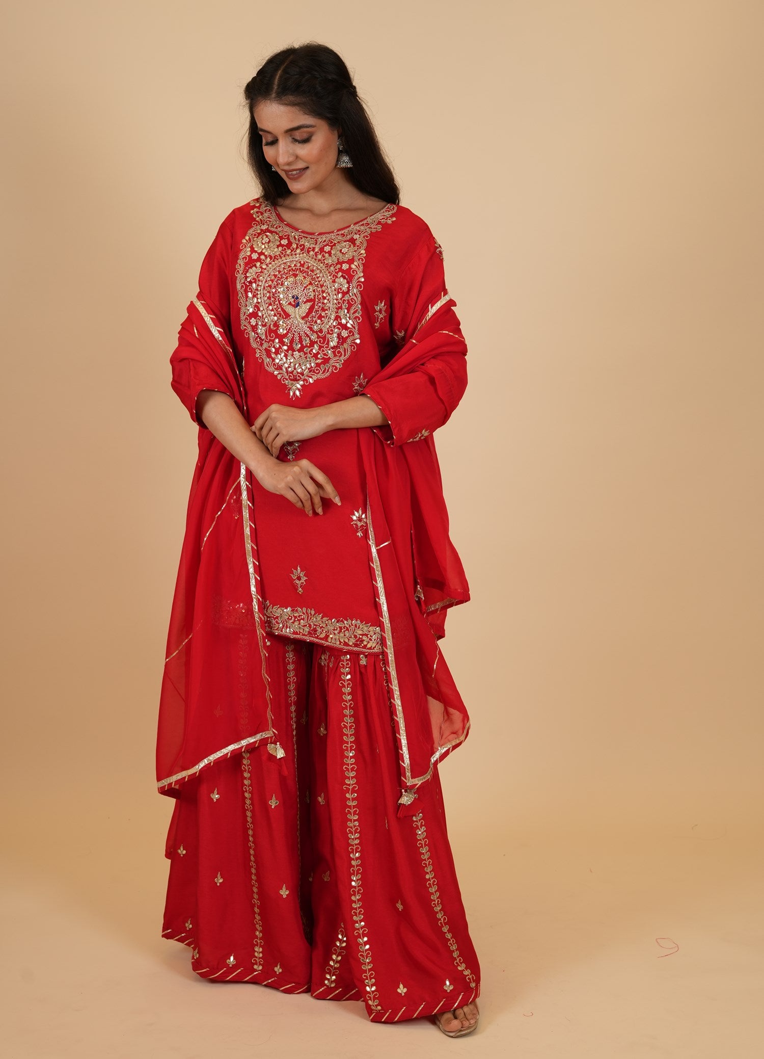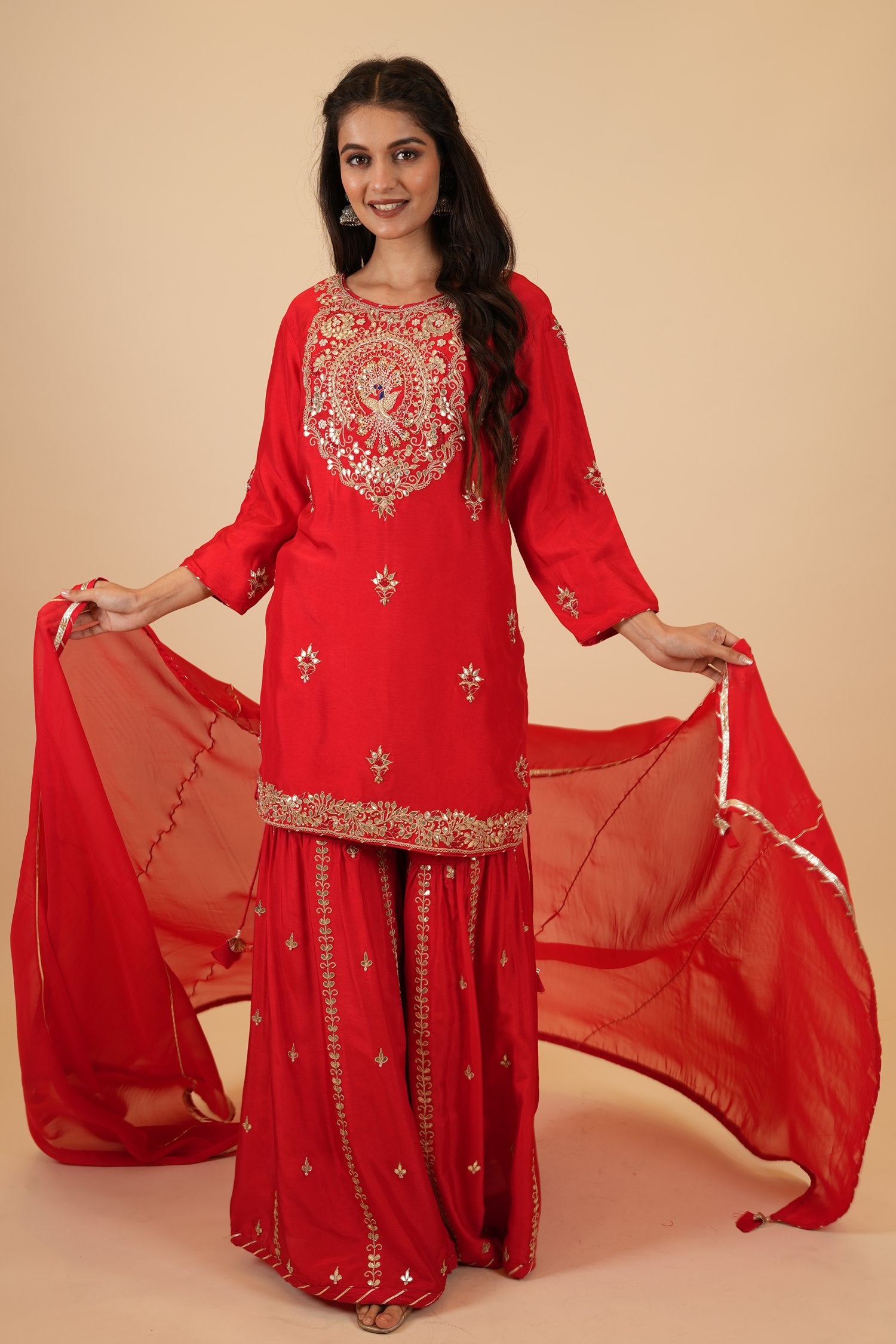 | Kurta Color : Red Kurta Fabric : Silk Kurta Work : Gota Patti , Zardosi, Moti, Sequine, Resham Dupatta Color : Red Dupatta Fabric : Art Organza Dupatta Work : Sikiya Gota Dupatta Border : Magzi Finishing Bottom Type : Sharara Sharara Color : Red Sharara Fabric : Silk Sharara Work : Gota Patti , Moti |
