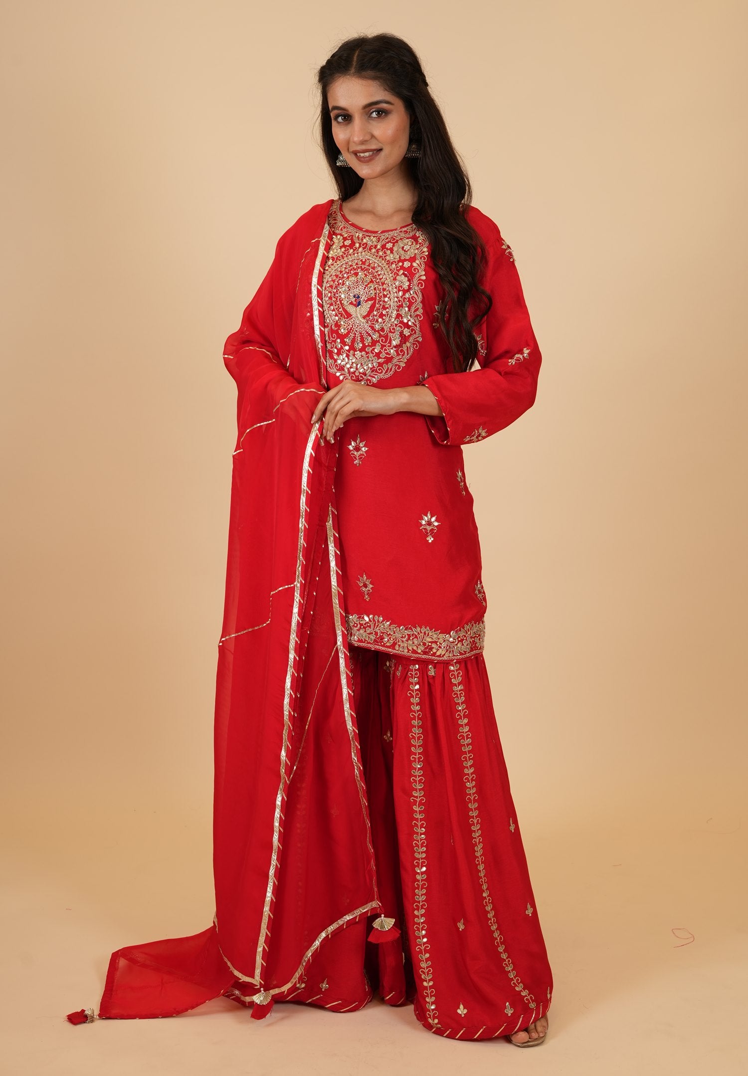 This exquisite sharara set features intricate designer gota patti, zardozi, and sequin work, along with beautiful peacock embroidery on the kurta. Perfect for parties and weddings, it comes with a stunning organza dupatta. Elevate your style with this trendy and elegant ensemble.