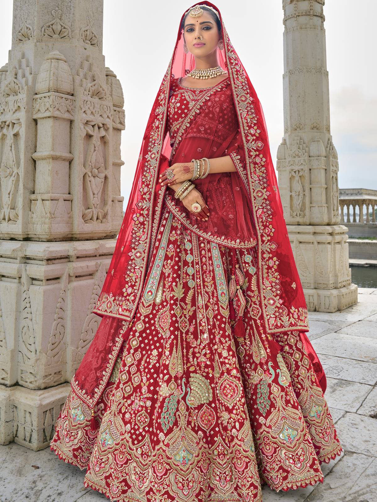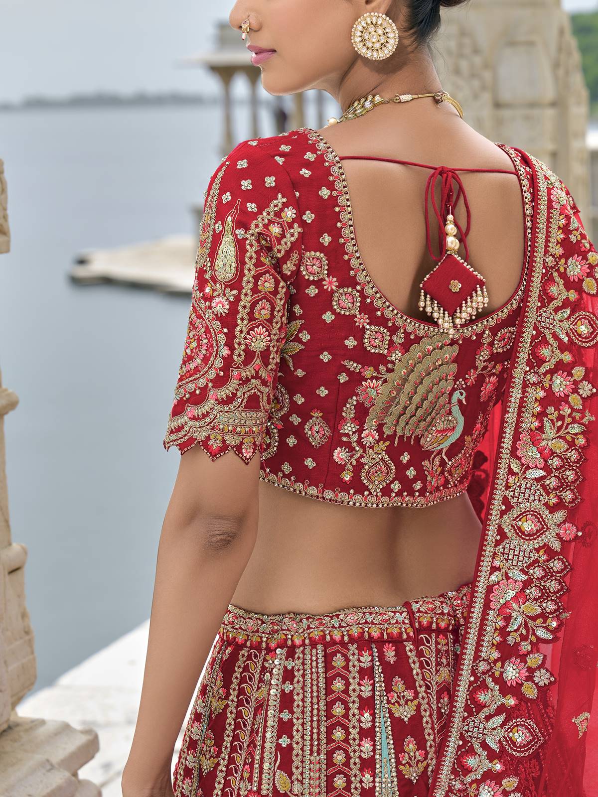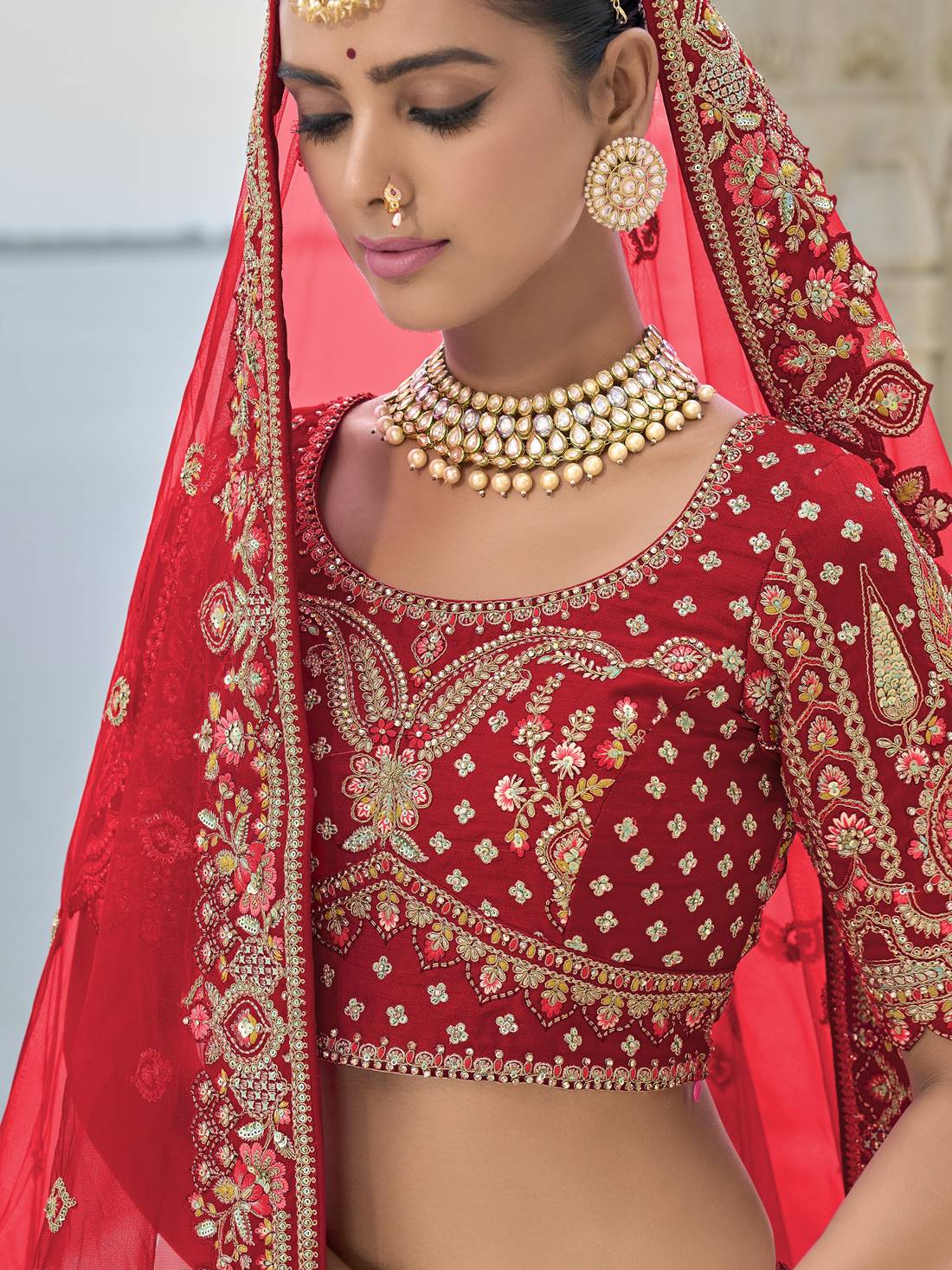 Lehenga Color : Red Lehenga Fabric : Raw Silk Lehenga Work : Embroidered Work, Patch Work, Cut Work, Hand Work Dupatta Color : Red Dupatta Fabric : Net Blouse Color : Red Blouse Fabric : SilkΒ |