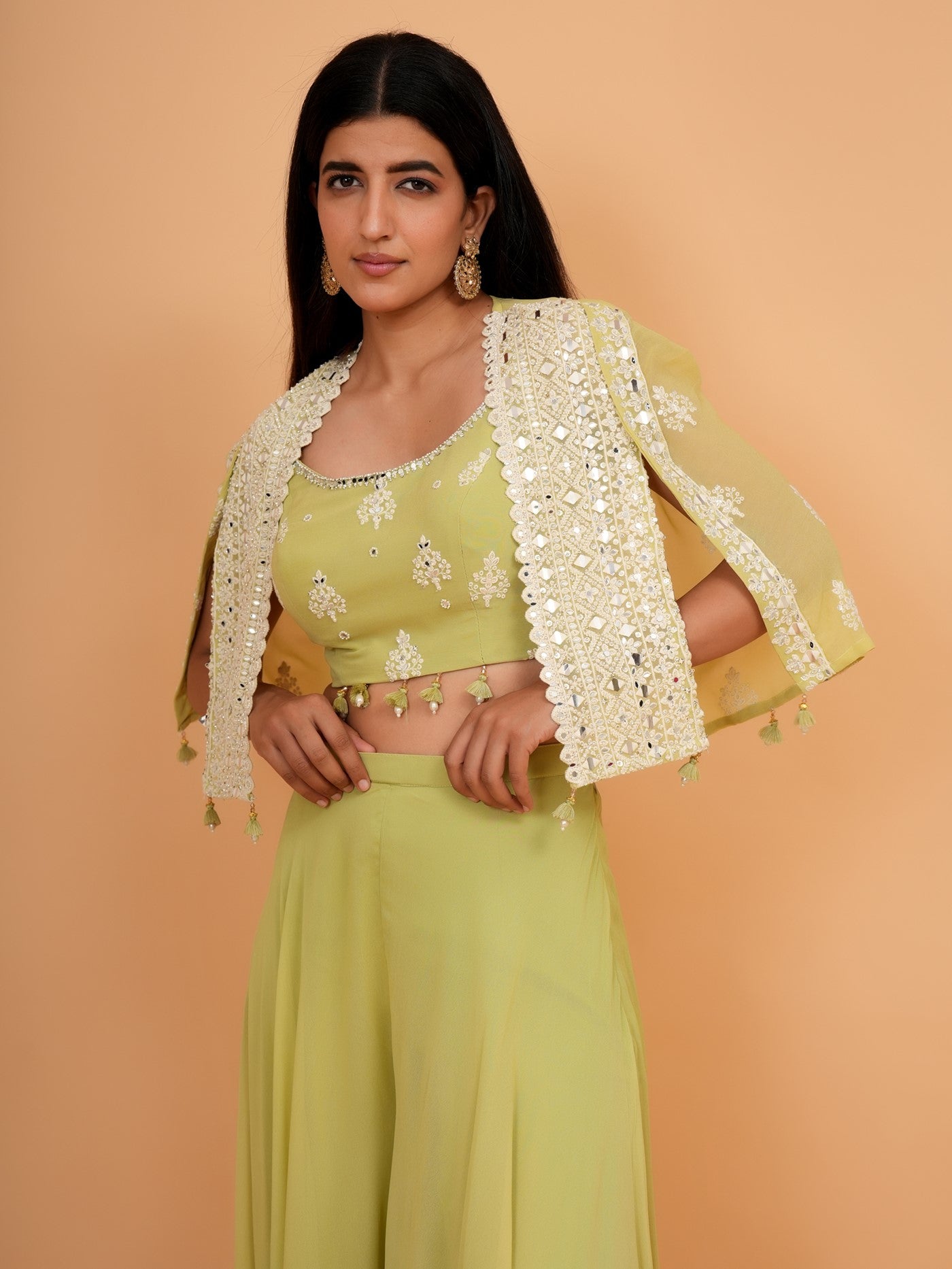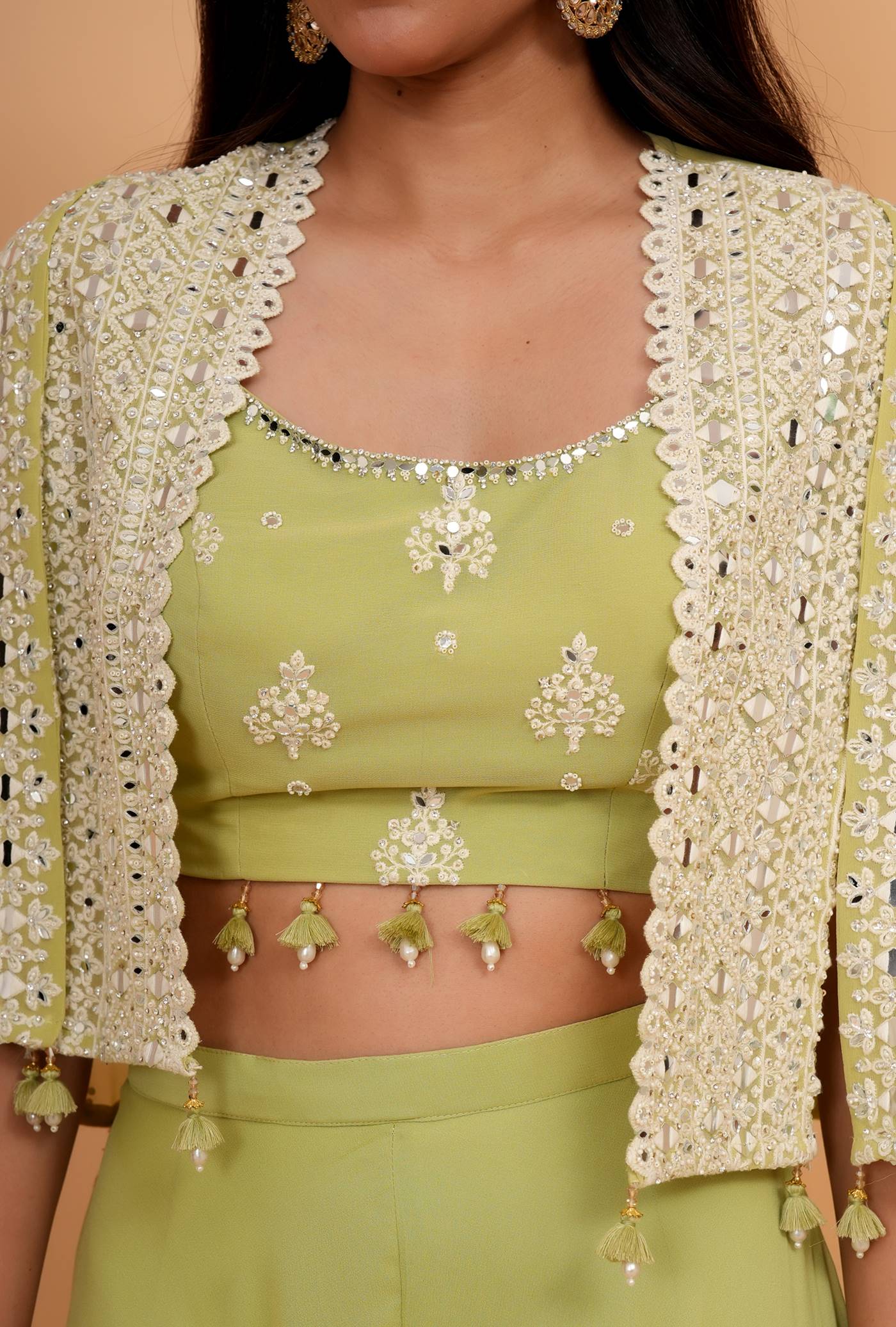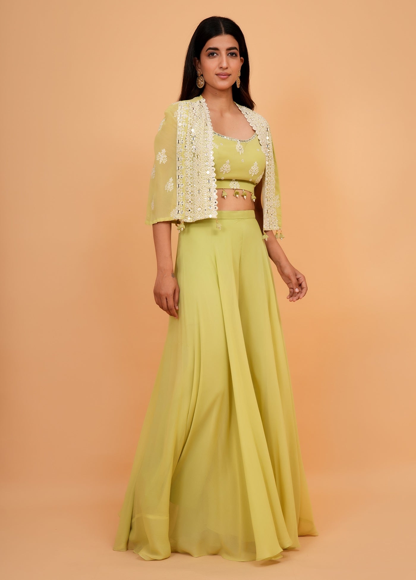 Jacket Color: Pista Green Jacket Fabric : Georgette Jacket Work : Resham & Mirror Blouse Color : Pista Green Blouse Fabric : Georgette Blouse Work : Resham & Mirror Bottom TypeΒ : Divider Divider Color : Pista Green Divider Fabric : Georgette |