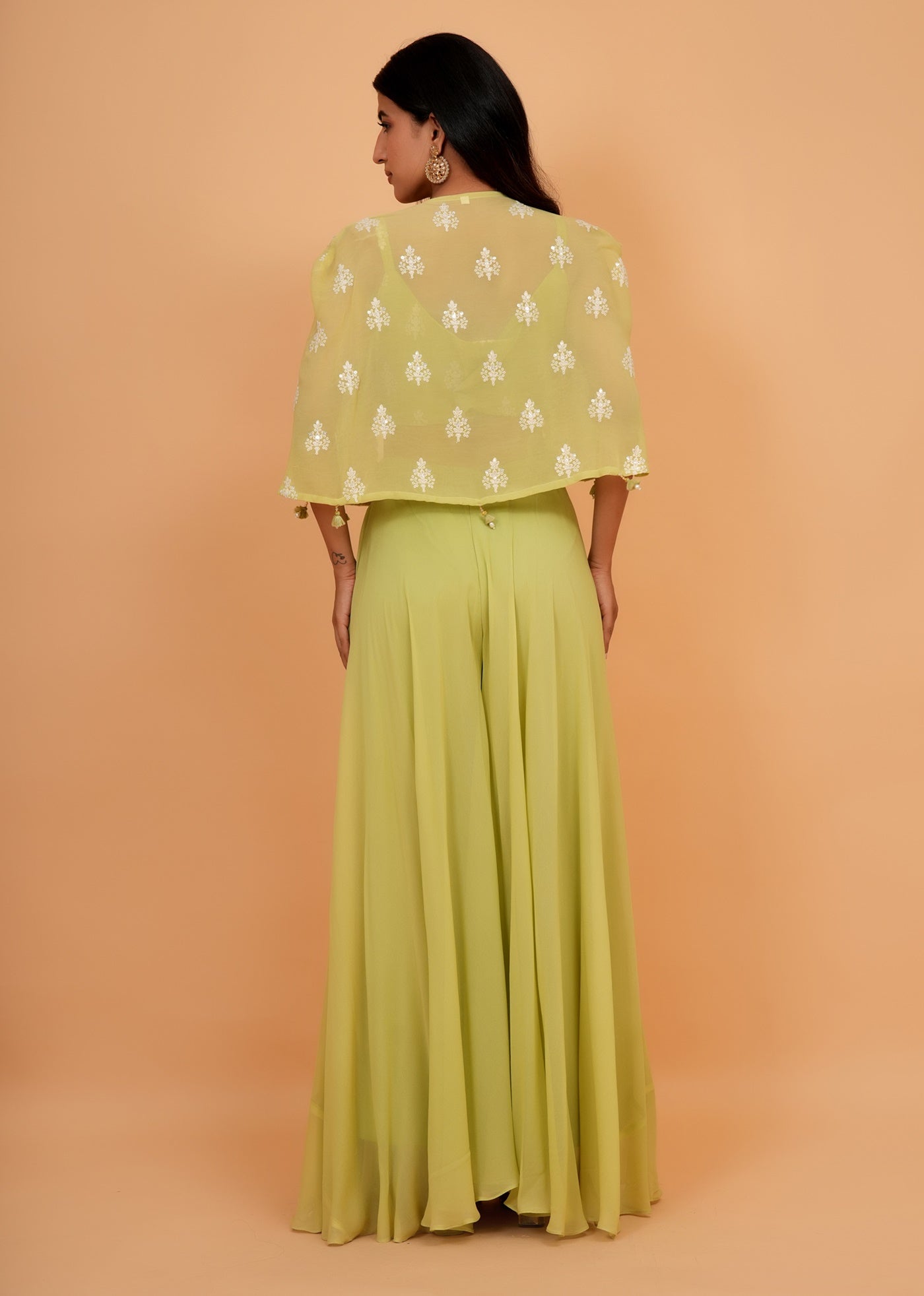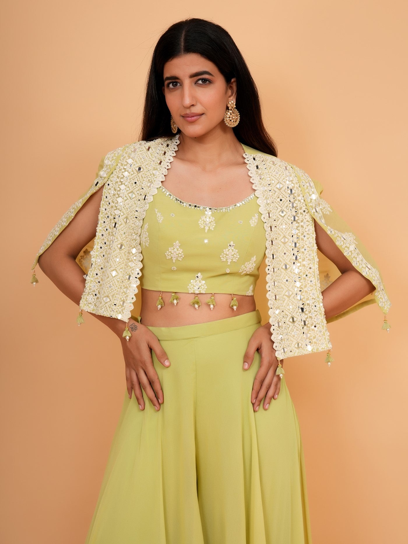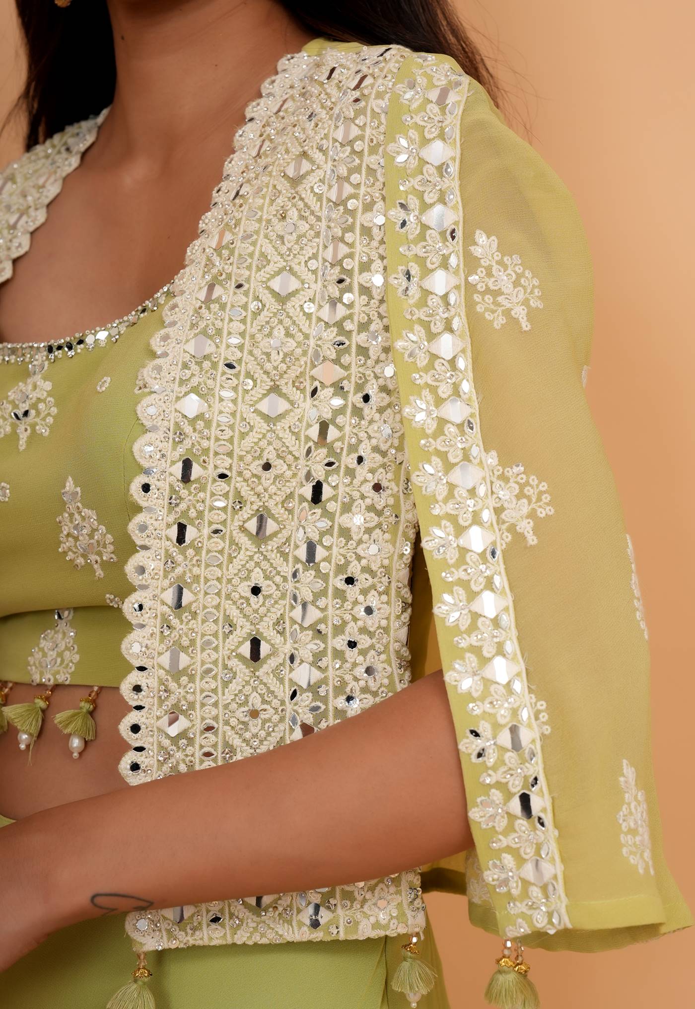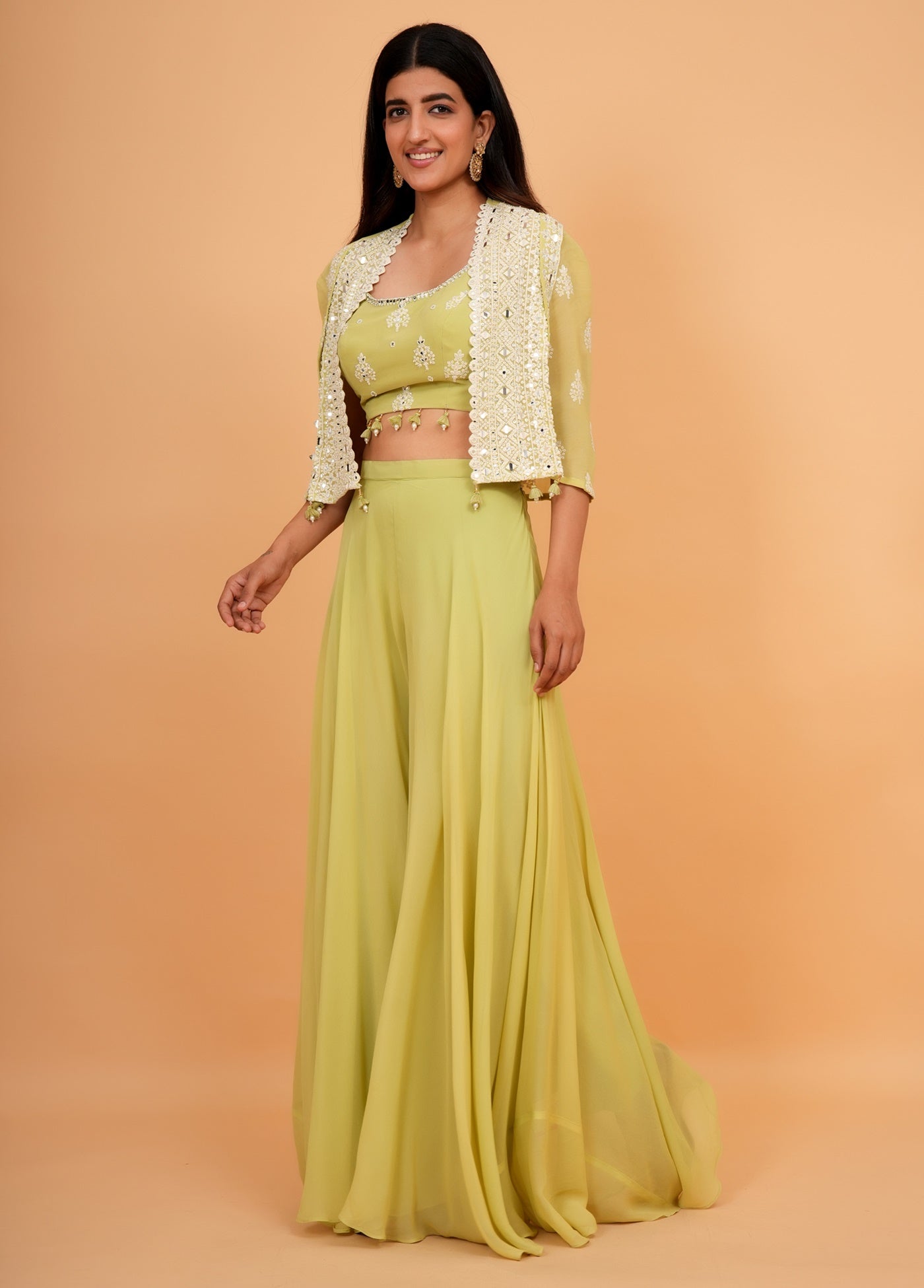 Jacket Color: Pista Green Jacket Fabric : Georgette Jacket Work : Resham & Mirror Blouse Color : Pista Green Blouse Fabric : Georgette Blouse Work : Resham & Mirror Bottom TypeΒ : Divider Divider Color : Pista Green Divider Fabric : Georgette |