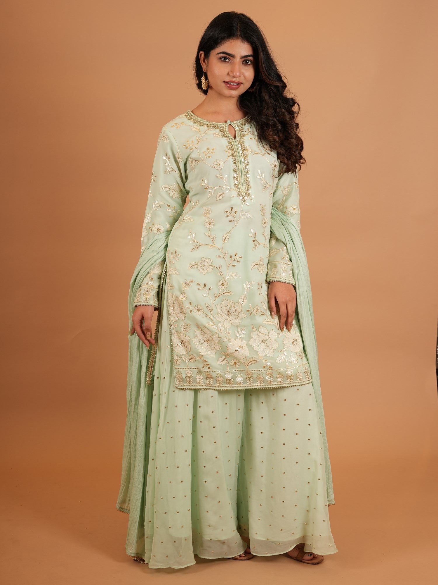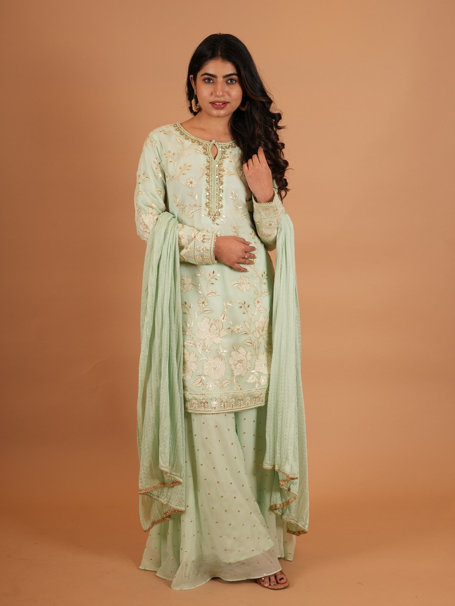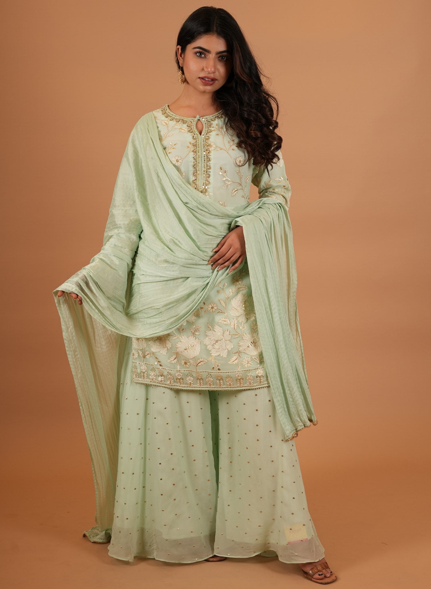 Kurta Color : Sea Green Kurta Fabric : Art Georgette Kurta Work : Resham, Moti , Sequine , Gota Patti Dupatta Color : Sea Green Dupatta Fabric : Art Chinon Chiffon Dupatta Border : Lace Bottom Type : PlazoΒ Plazo Color : Sea Green Plazo Fabric : Art Organza |