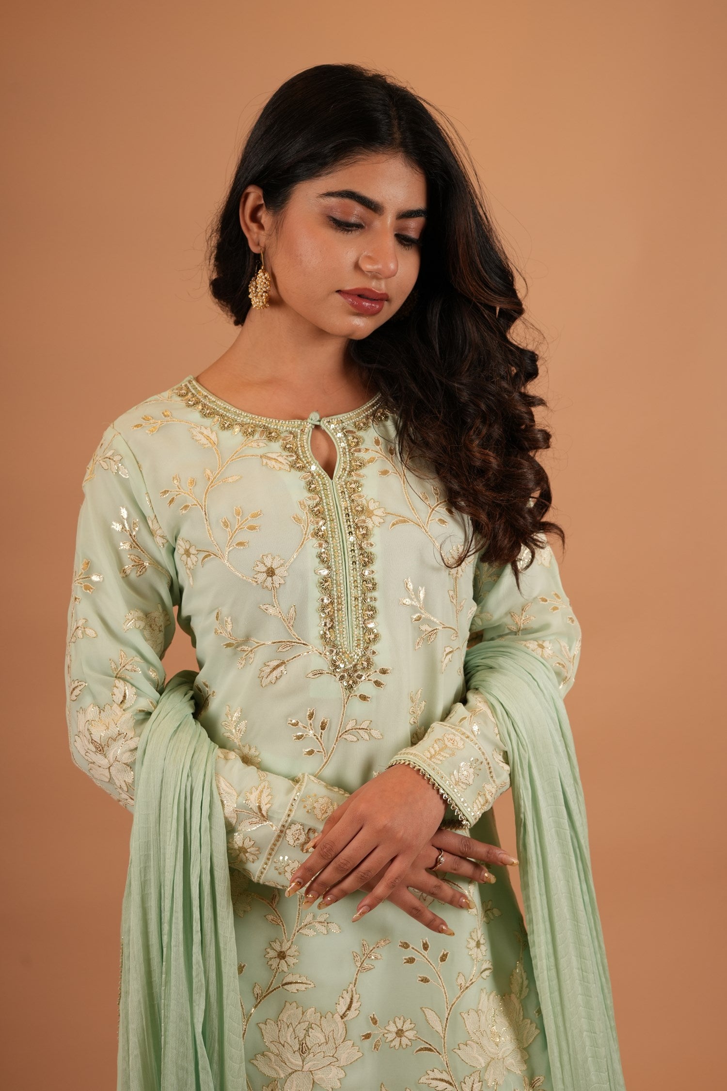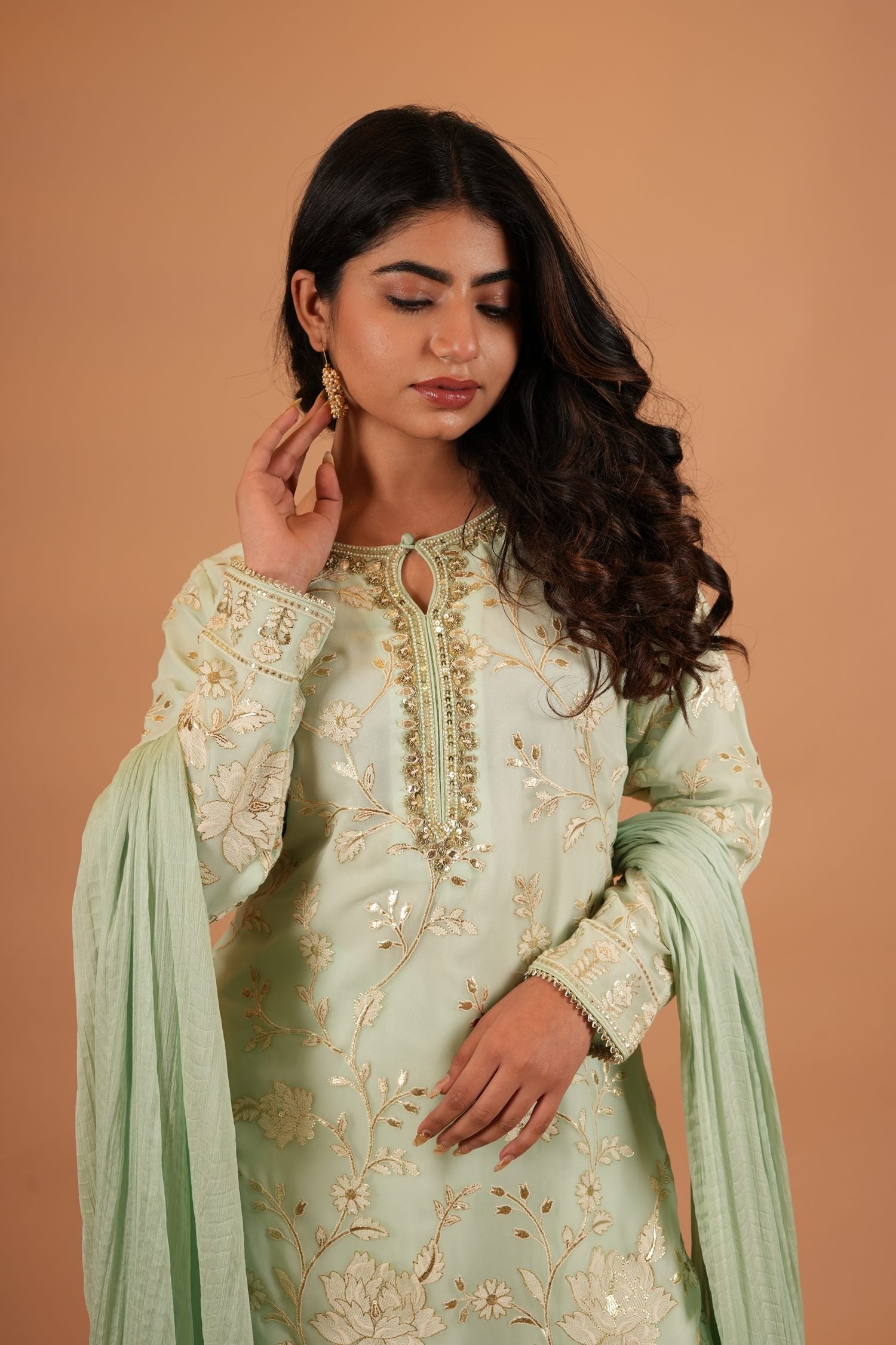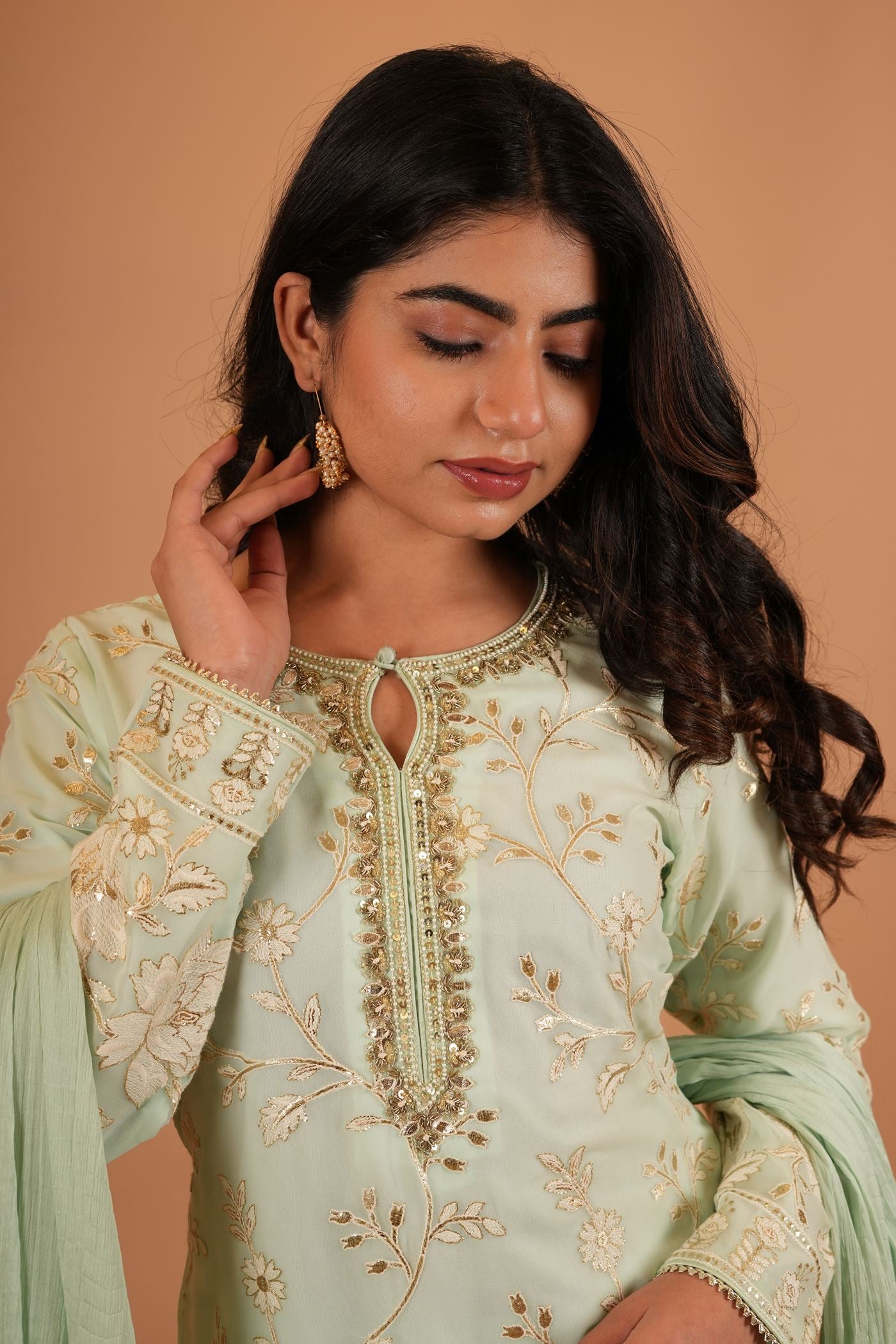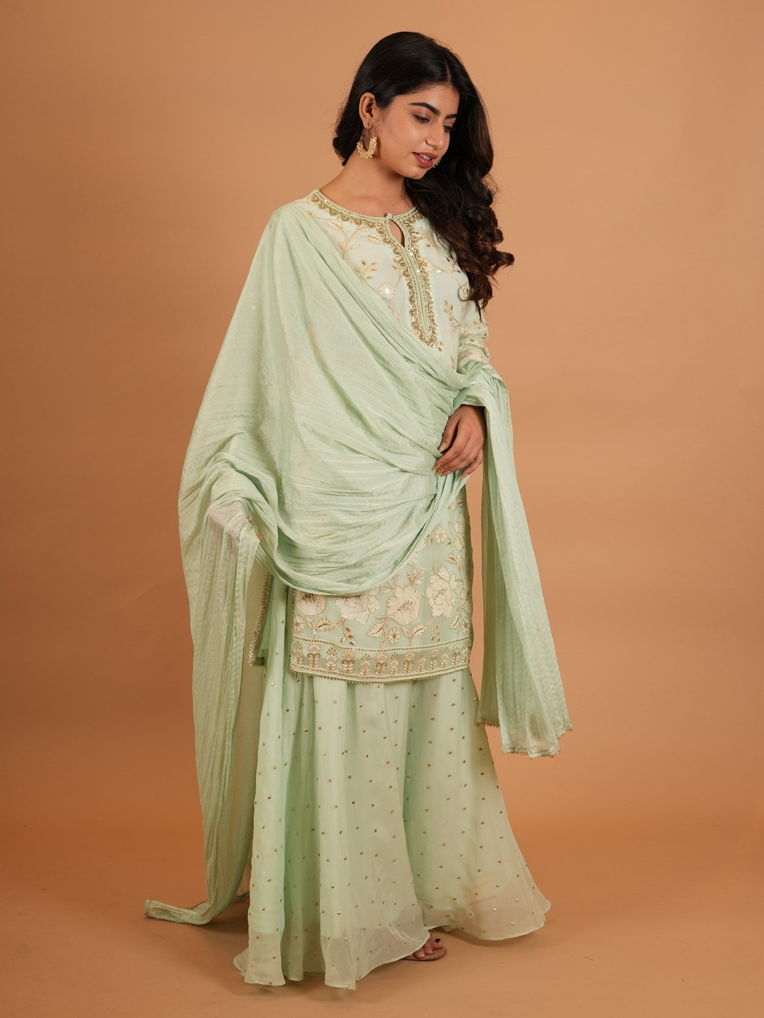 Kurta Color : Sea Green Kurta Fabric : Art Georgette Kurta Work : Resham, Moti , Sequine , Gota Patti Dupatta Color : Sea Green Dupatta Fabric : Art Chinon Chiffon Dupatta Border : Lace Bottom Type : PlazoΒ Plazo Color : Sea Green Plazo Fabric : Art Organza |