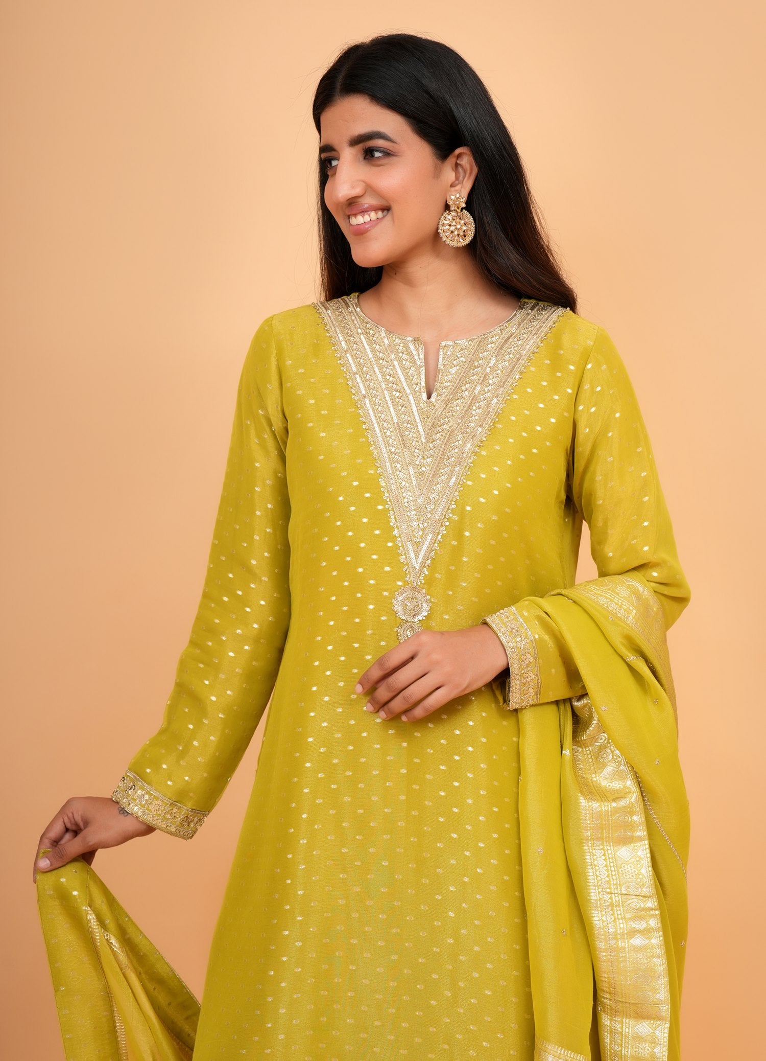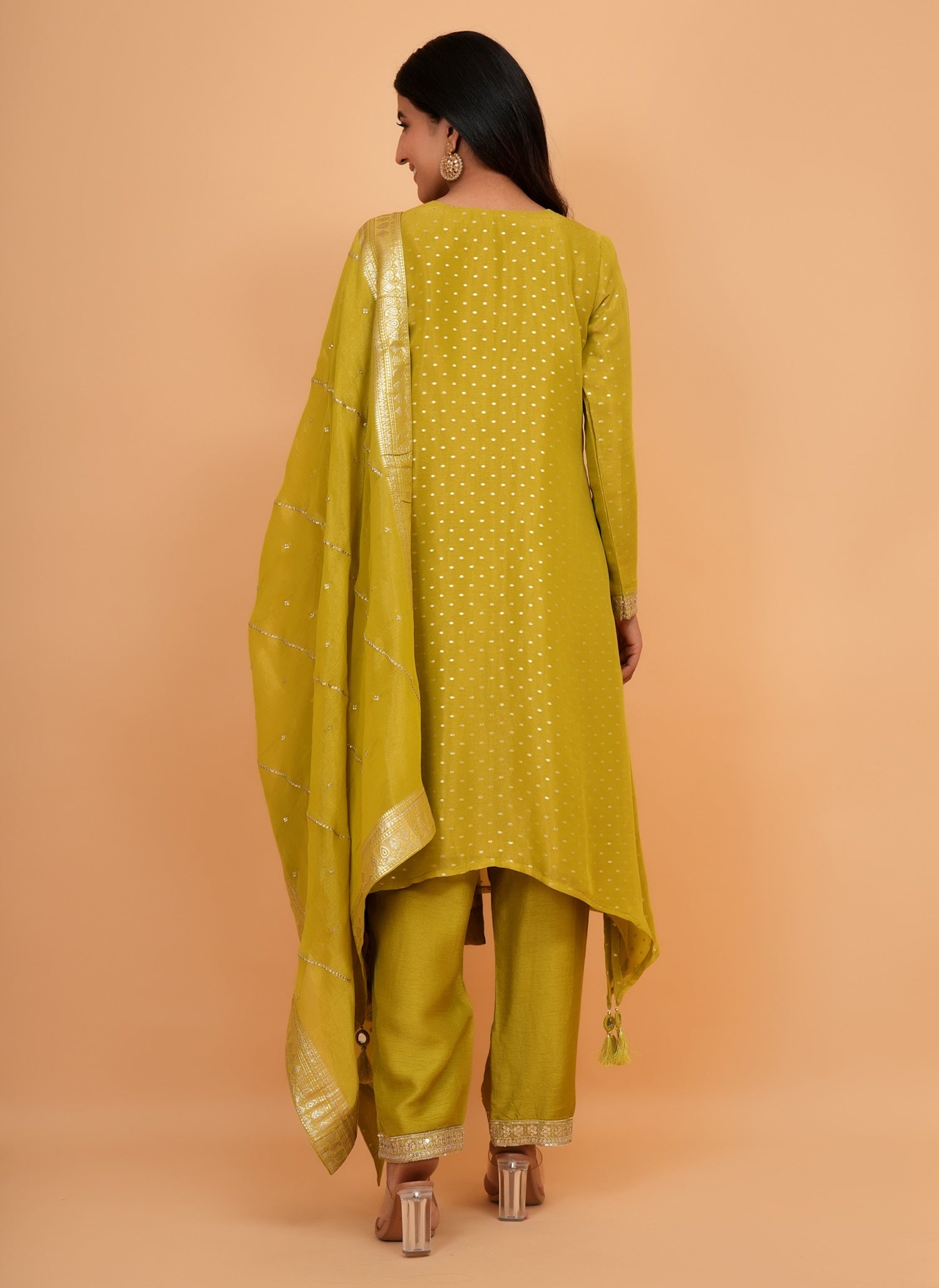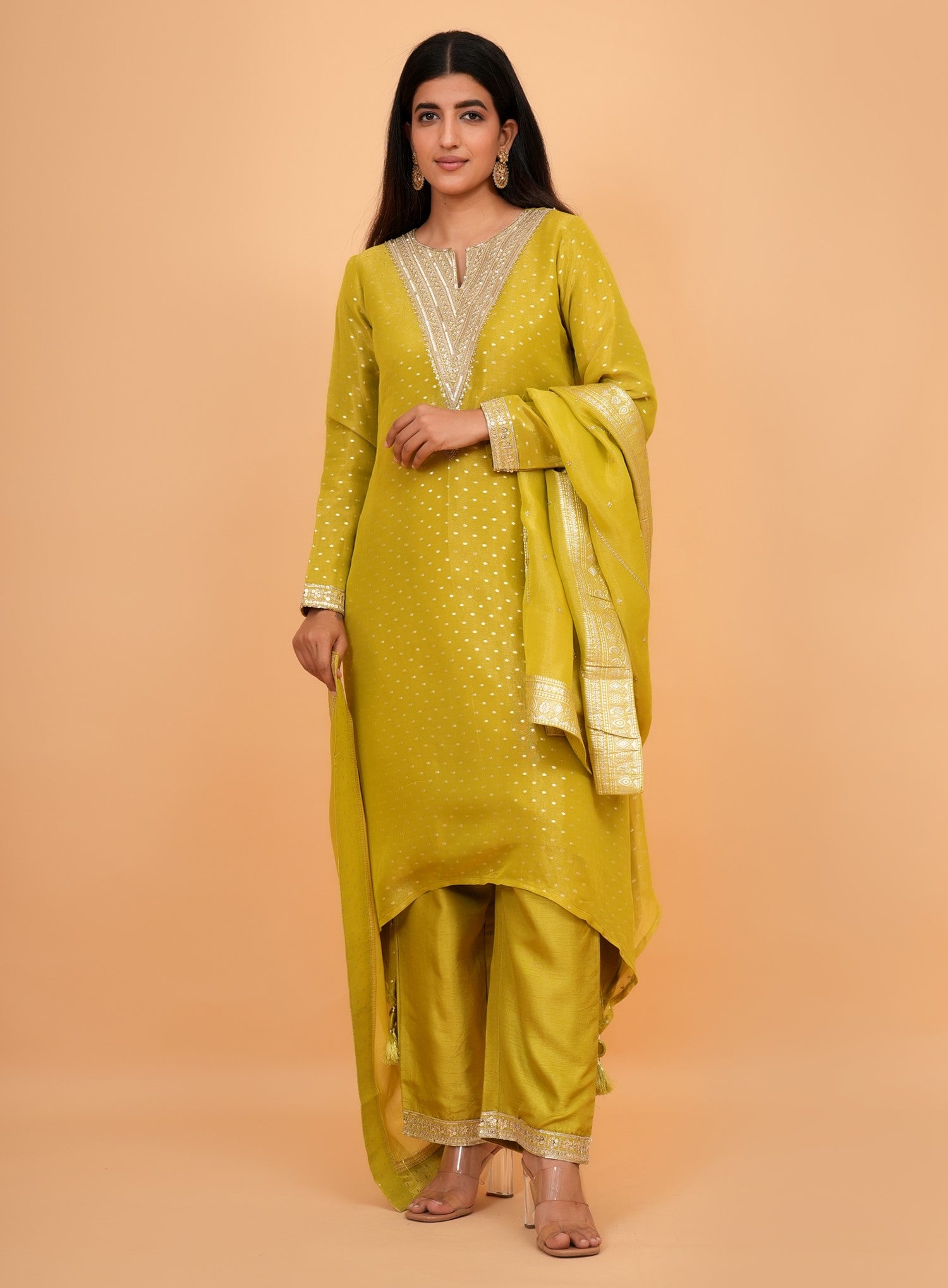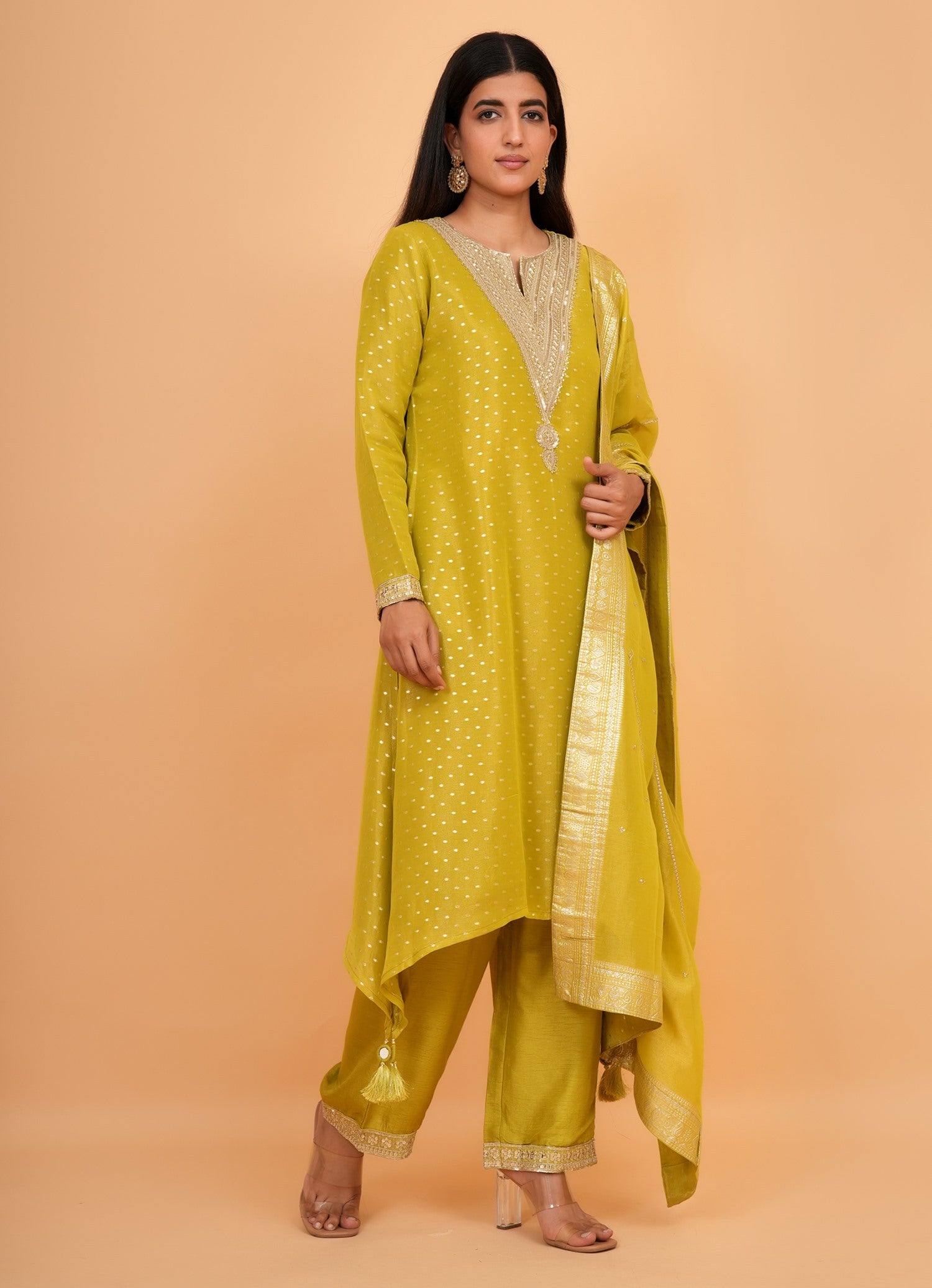 | Kurti Color: Mehendi Color Kurti Fabric : Chanderi Silk Kurti Work : Sequine Dupatta Color : Mehendi Color Dupatta Fabric : Banarsi Silk Pant Color : Mehendi Color Pant Fabric : Silk Pant Work : Sequine |