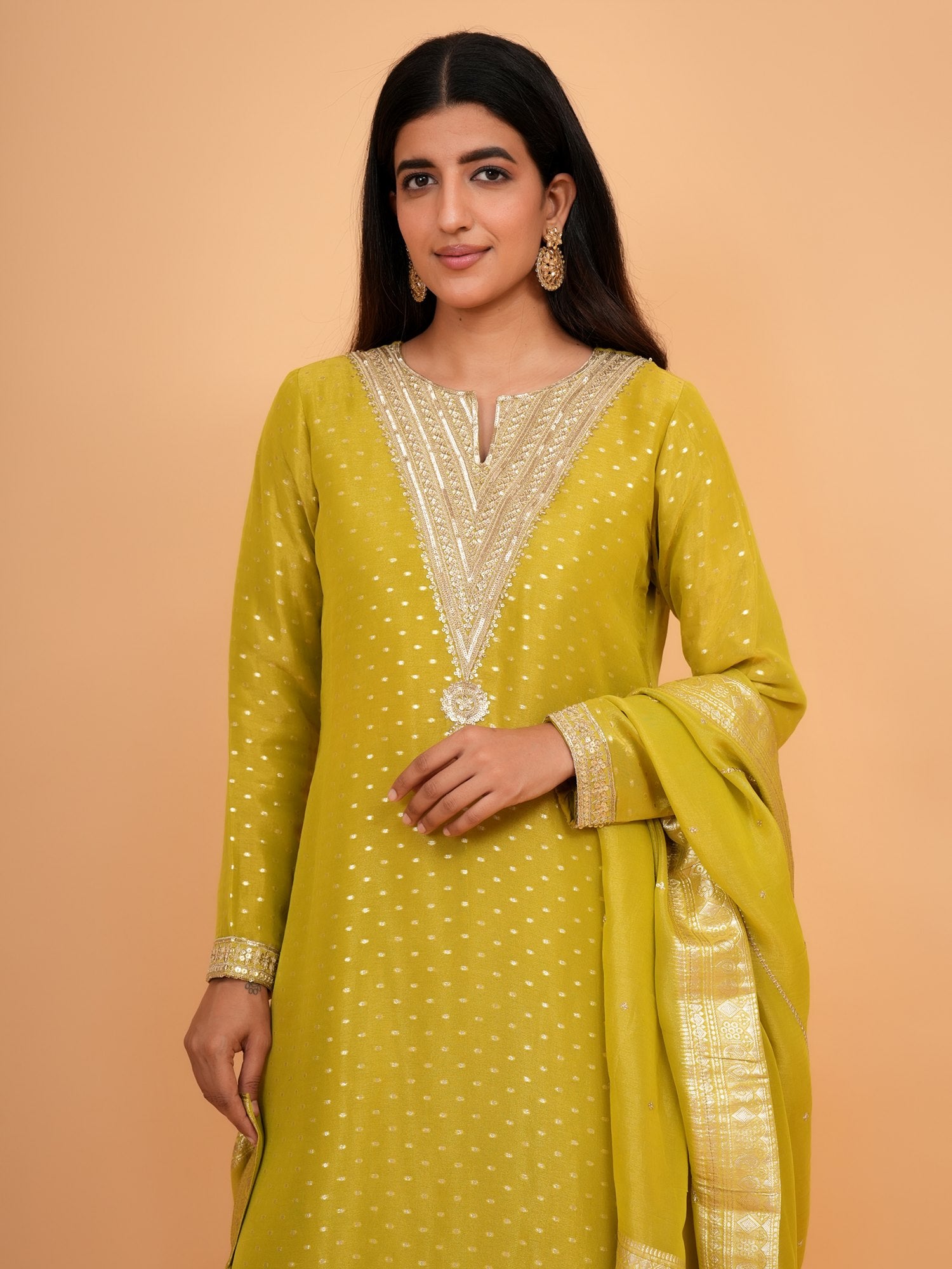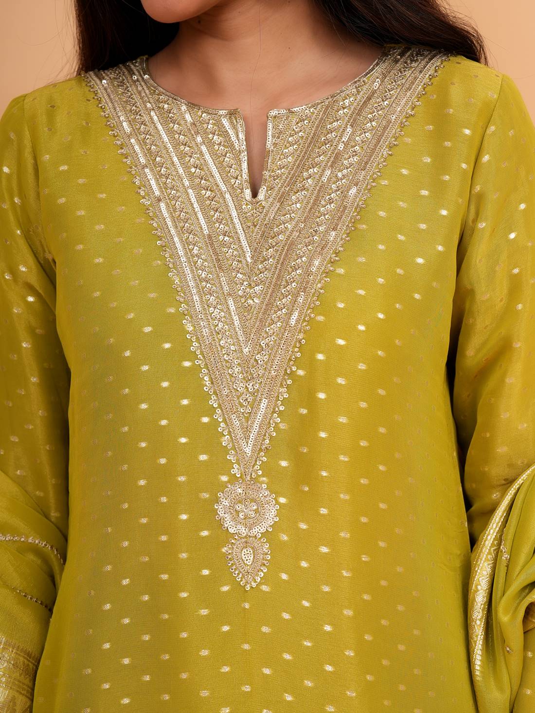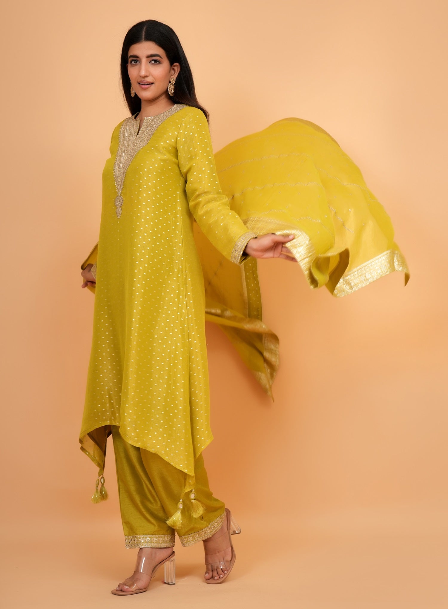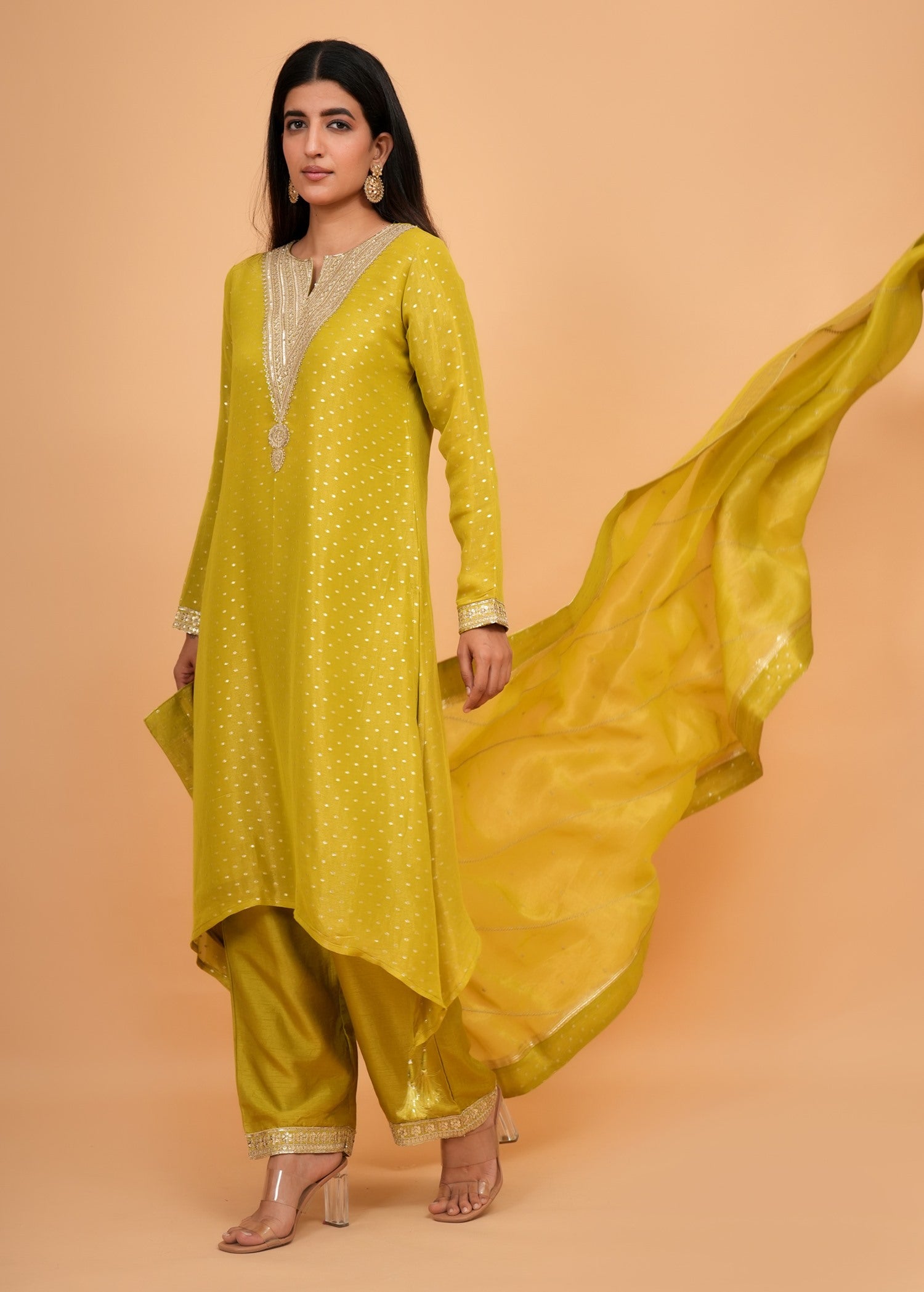 | Kurti Color: Mehendi Color Kurti Fabric : Chanderi Silk Kurti Work : Sequine Dupatta Color : Mehendi Color Dupatta Fabric : Banarsi Silk Pant Color : Mehendi Color Pant Fabric : Silk Pant Work : Sequine |