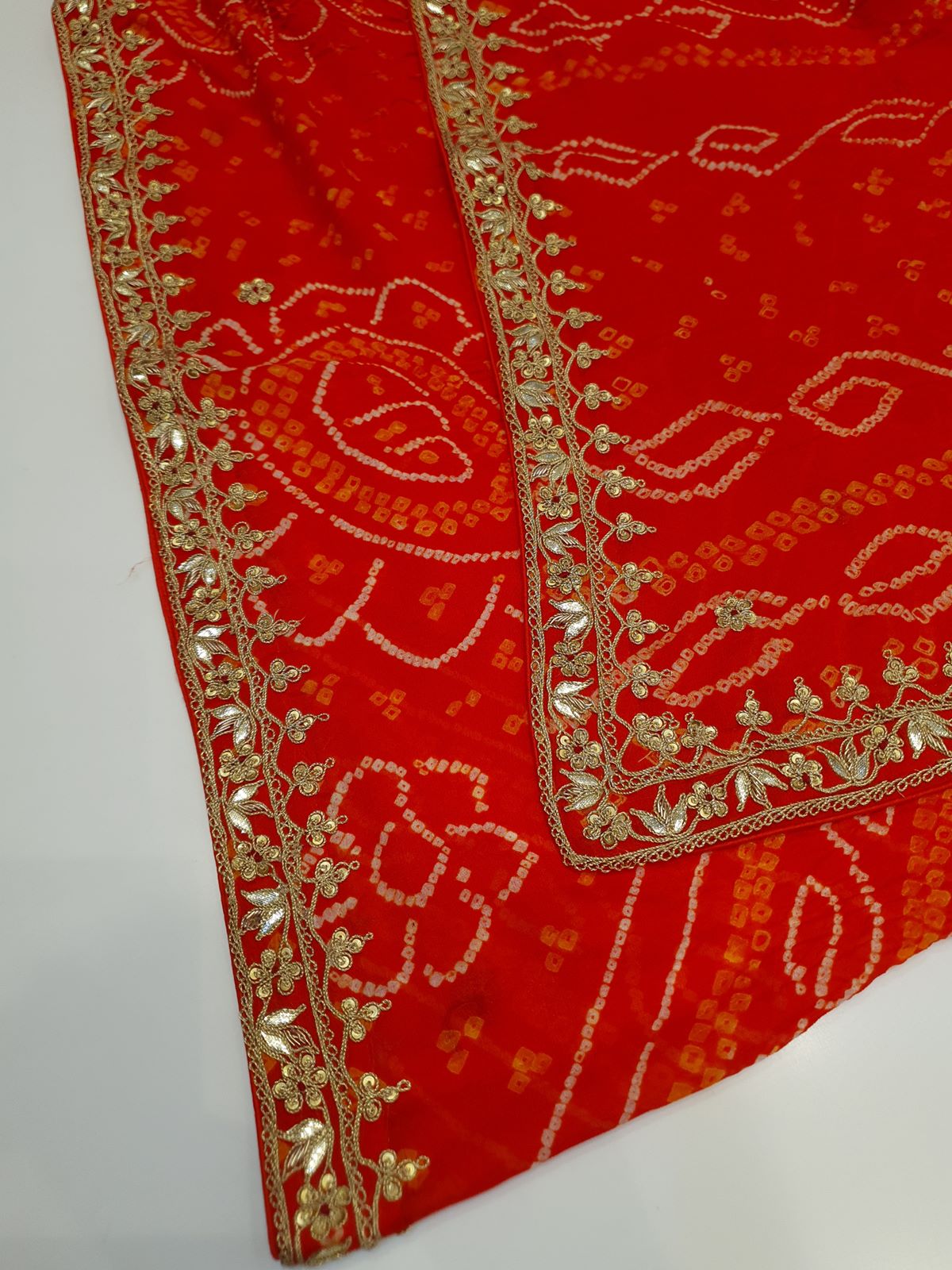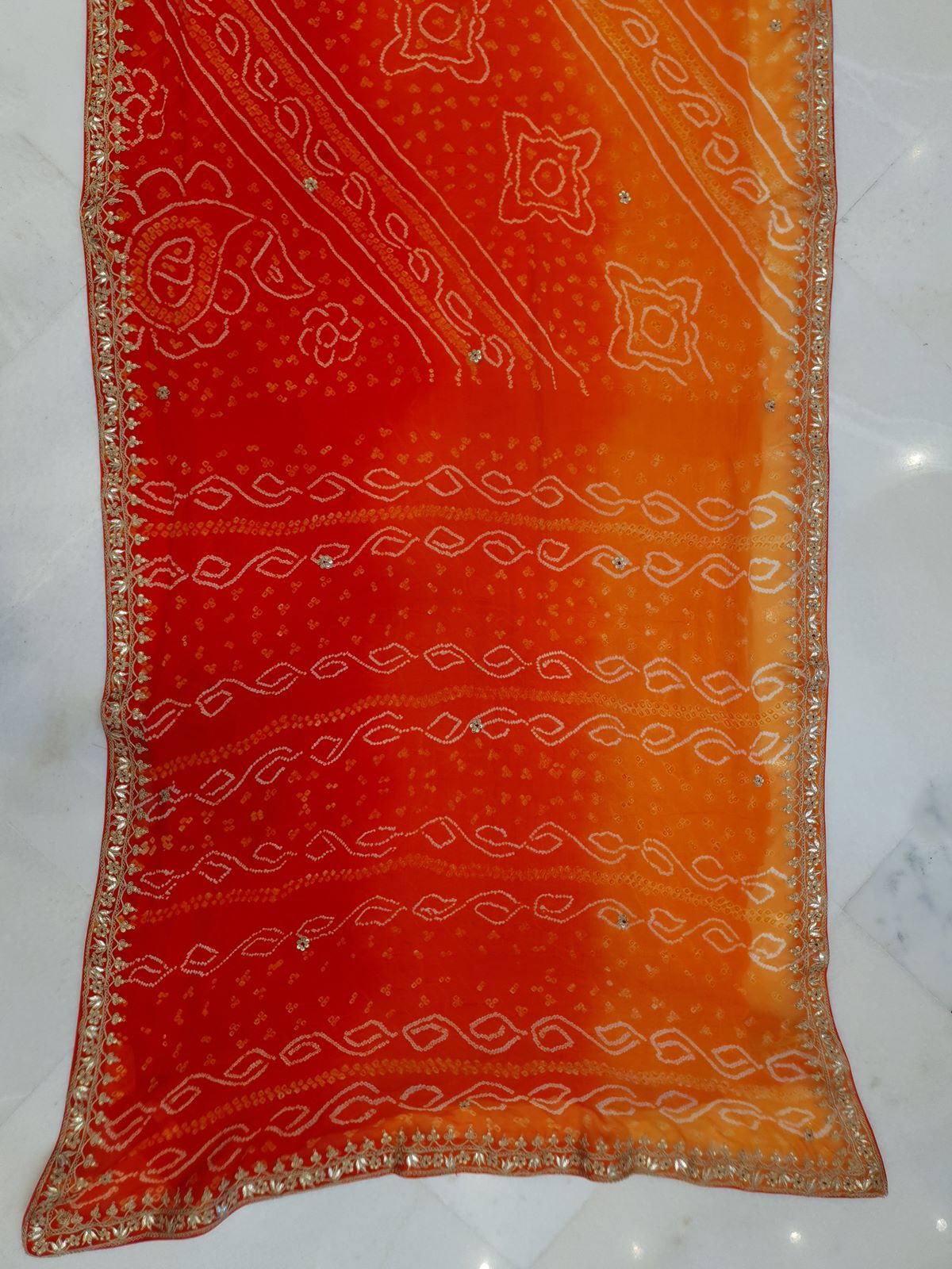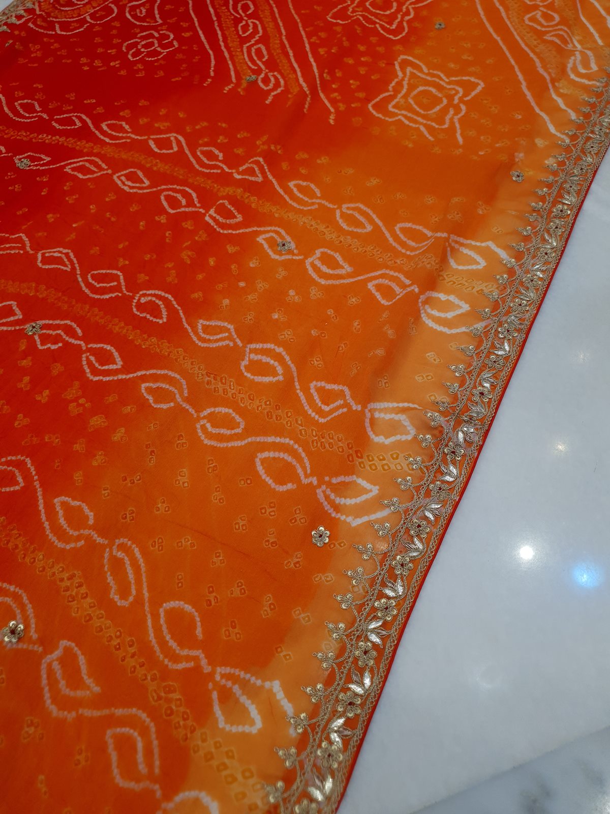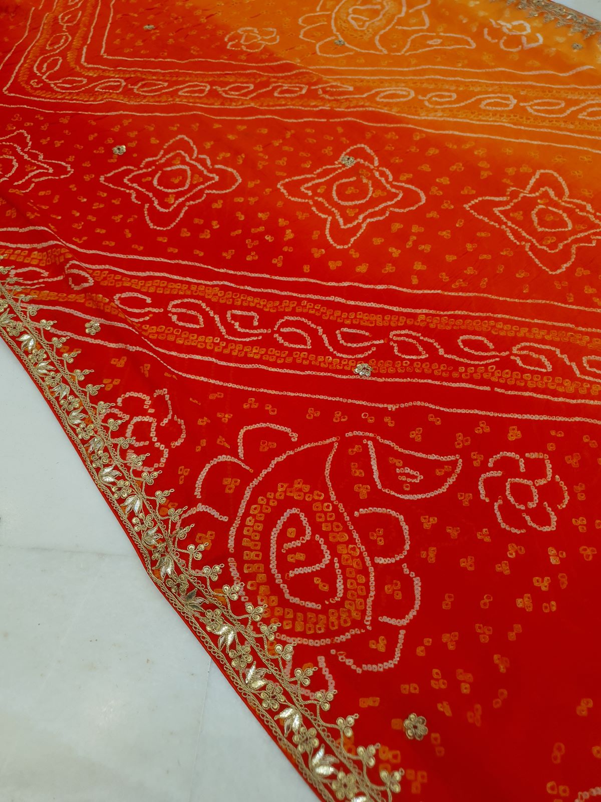 Saree Color : Shaded Orange Saree Fabric : Pure Chinon Saree Work : Gota, Zardosi, Marori, Sequine Blouse Color : Orange Blouse Fabric : Chinon Blouse Work : Gota, Zardosi, Marori, Sequine |