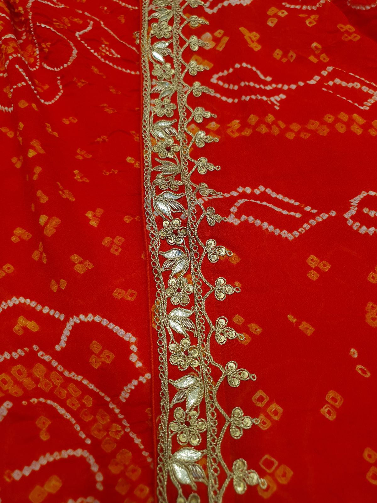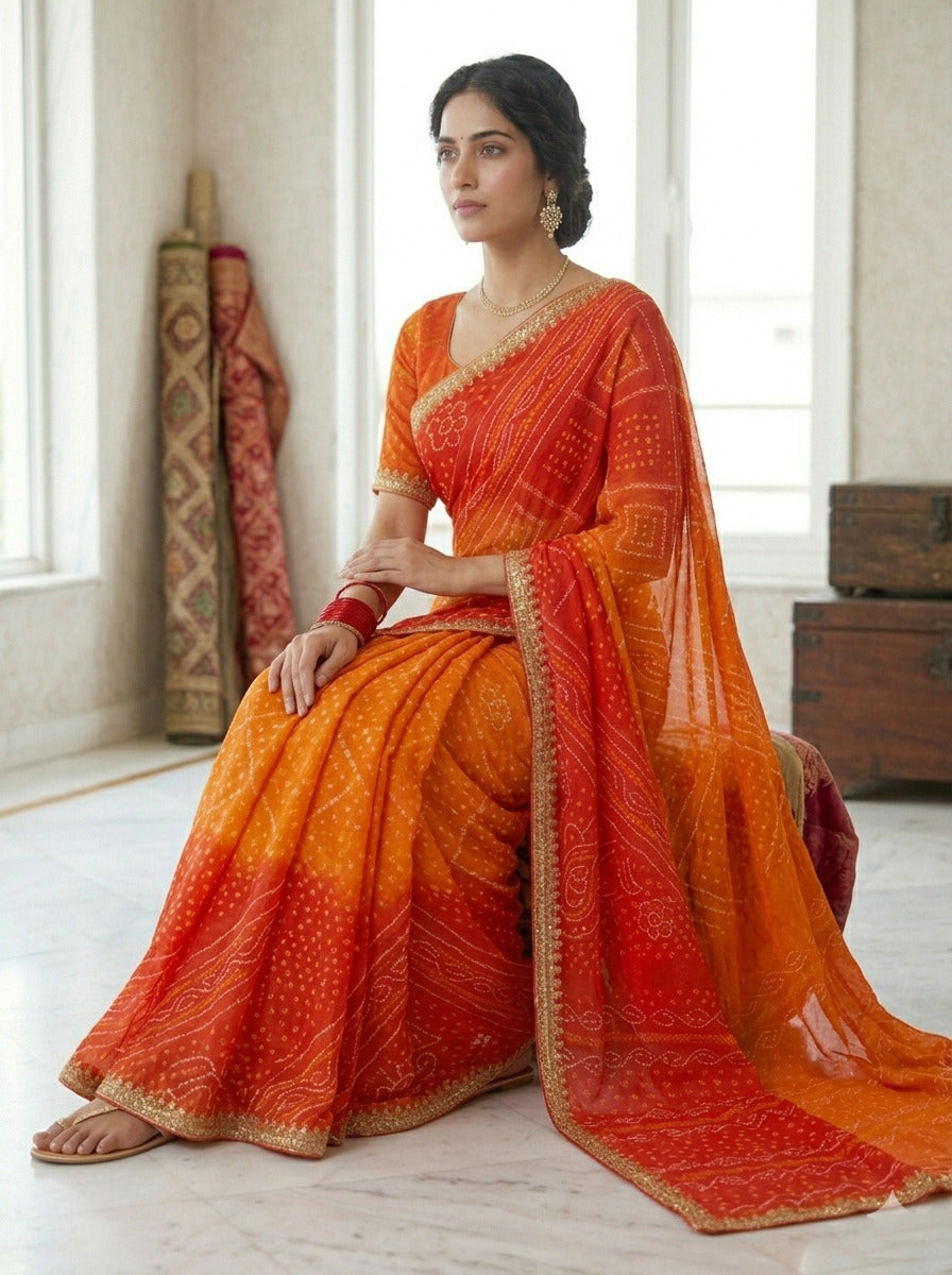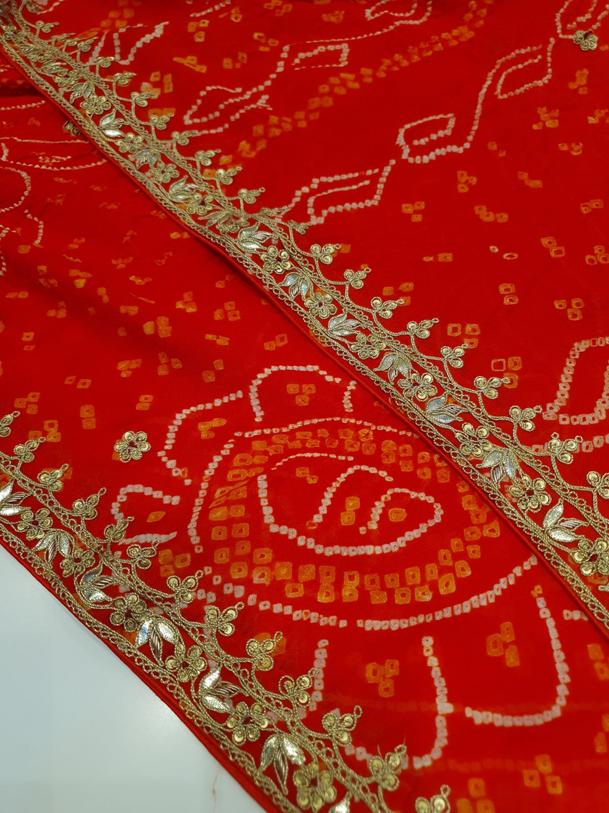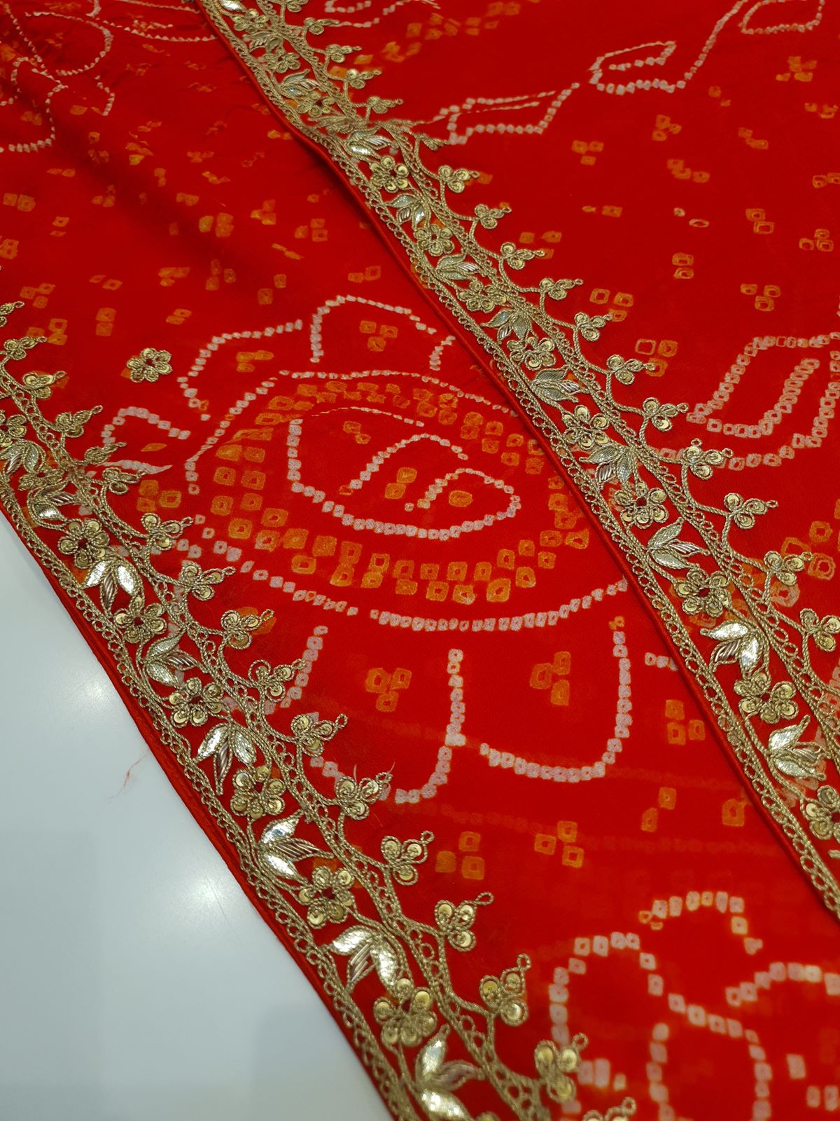 Saree Color : Shaded Orange Saree Fabric : Pure Chinon Saree Work : Gota, Zardosi, Marori, Sequine Blouse Color : Orange Blouse Fabric : Chinon Blouse Work : Gota, Zardosi, Marori, Sequine |