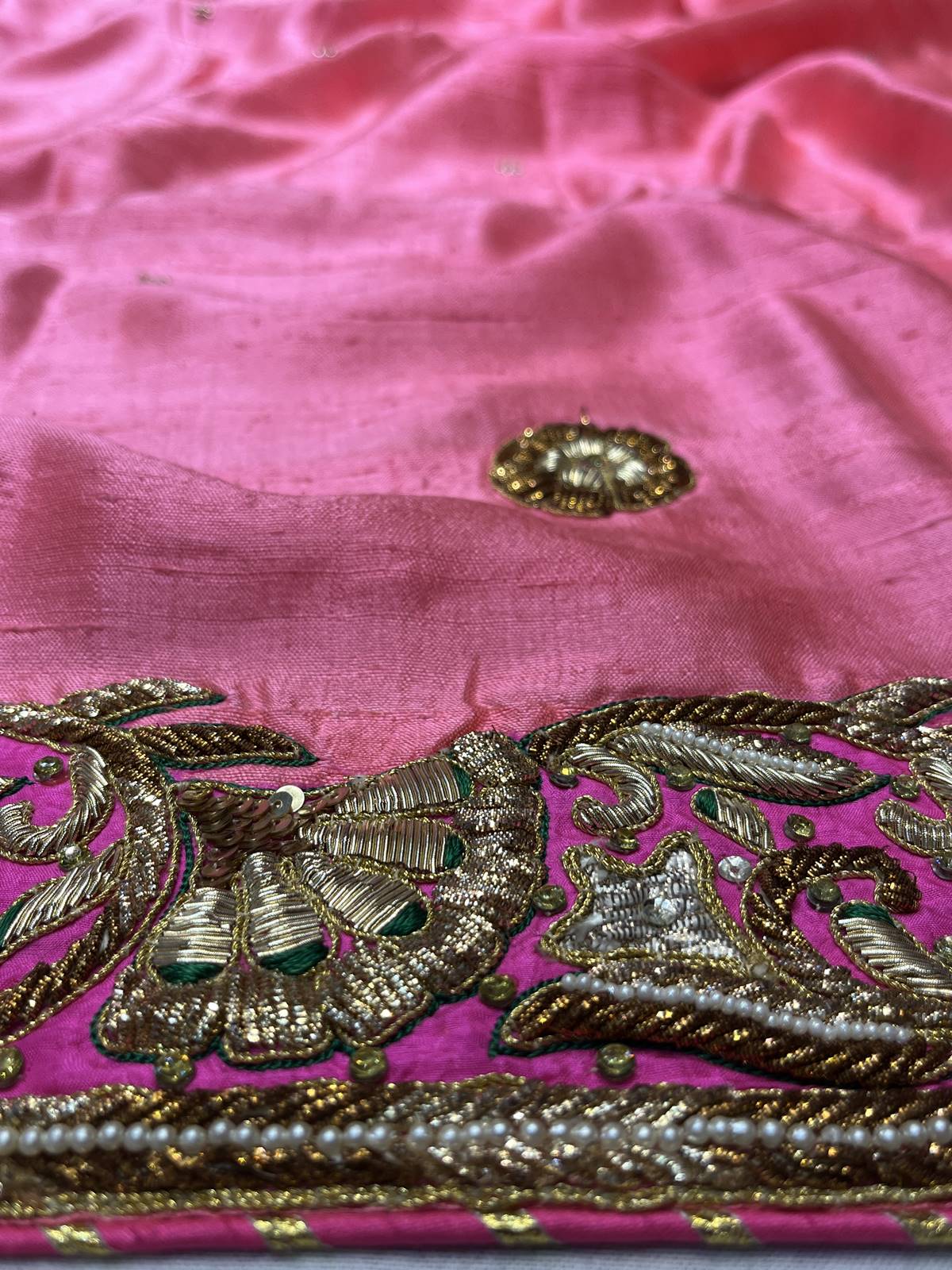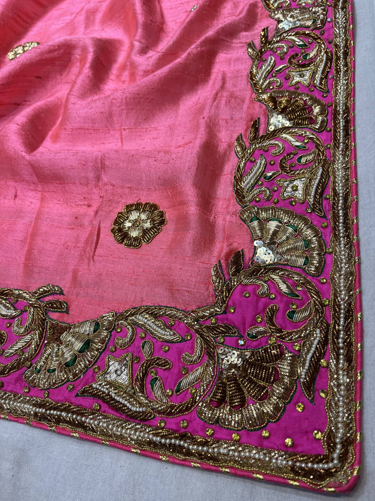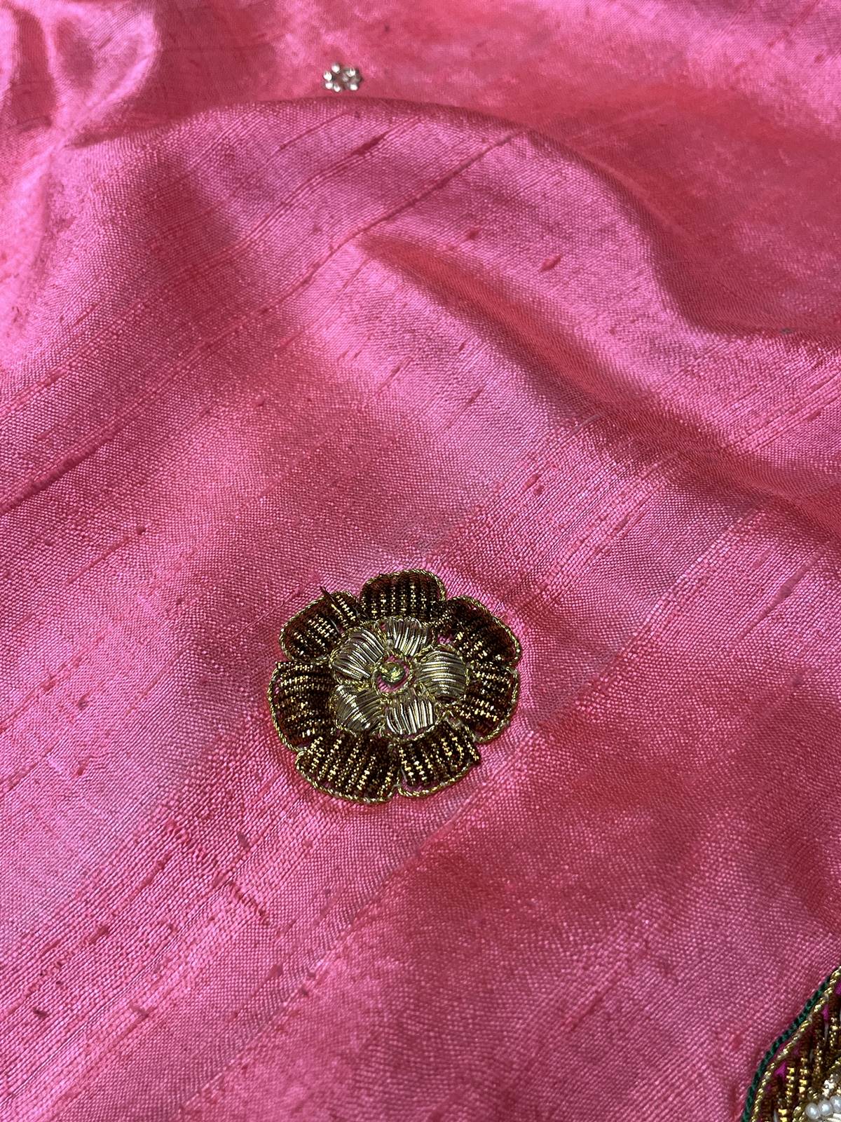 Saree Color : Peachy Pink Saree Fabric : Raw Silk Saree Work : Salma , Zardosi ,Sequins, Pearl Blouse Color : Peachy Pink Blouse Fabric : Raw Silk Blouse Work : Salma , Zardosi ,Sequins, Pearl |