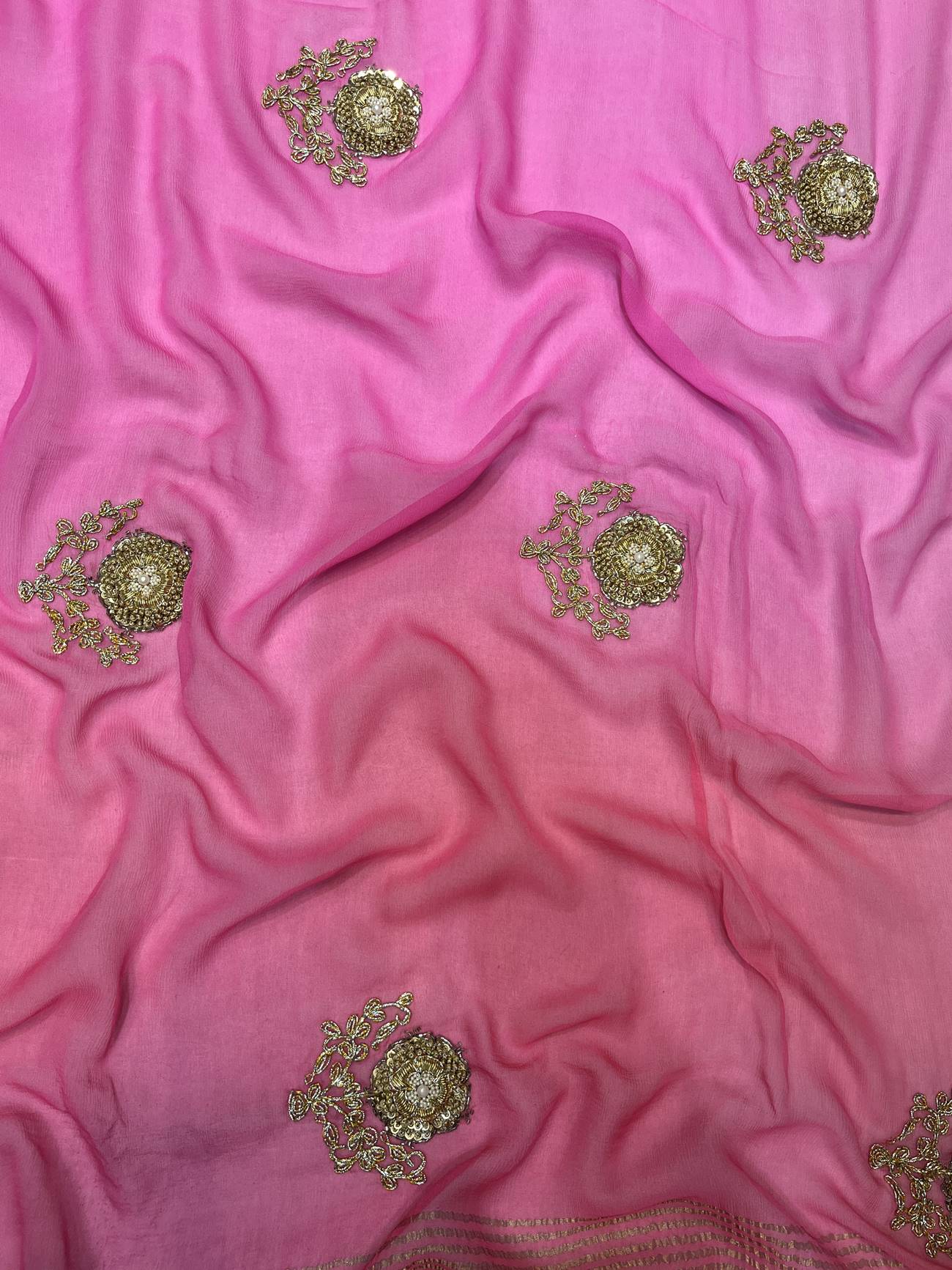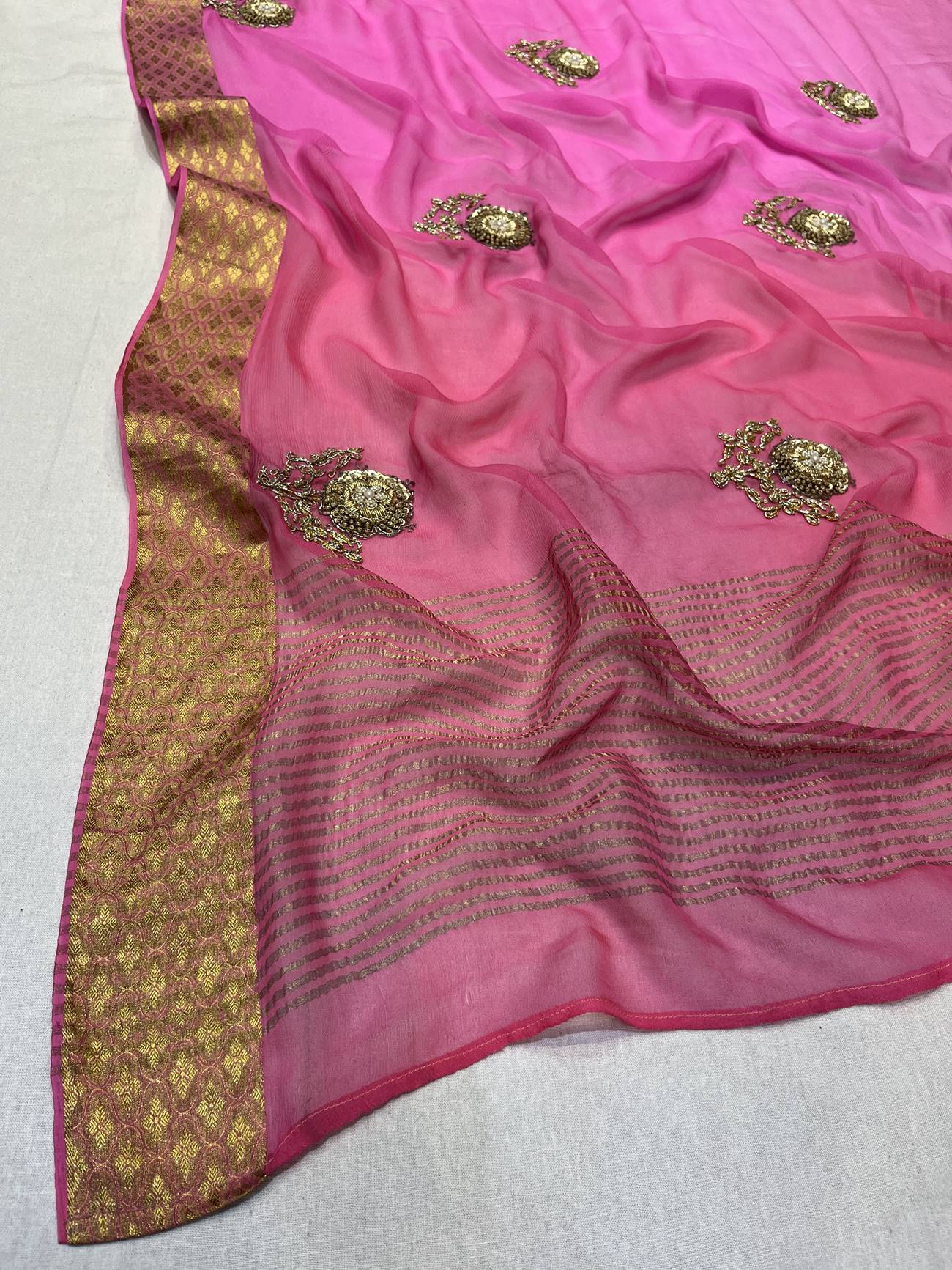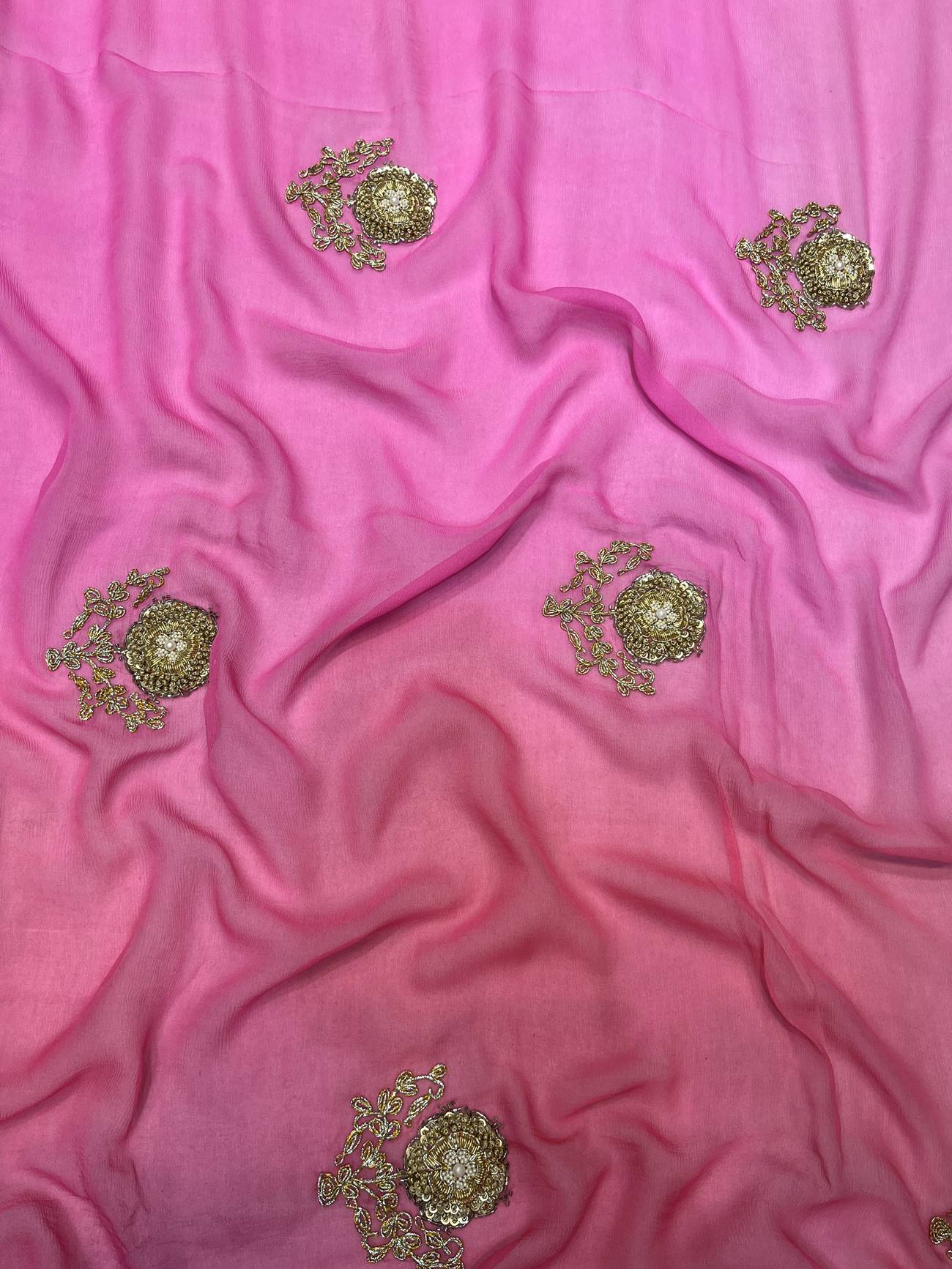 Saree Color : Shaded Peachy Pink Saree Fabric : Binny Chiffon Saree Work : Zardosi , Moti , Dori , French Knot , Sequine , Cutdana Blouse Color : Pink Blouse Fabric : Crepe Blouse Work : Zardosi , Moti , Dori |