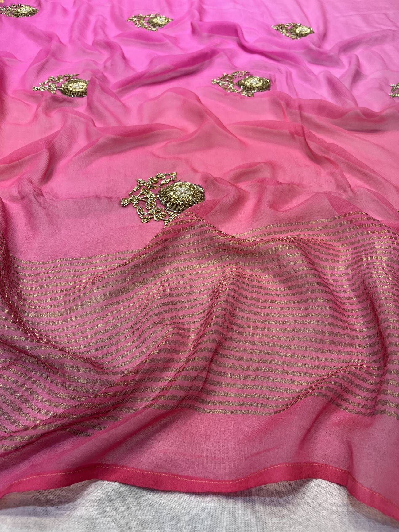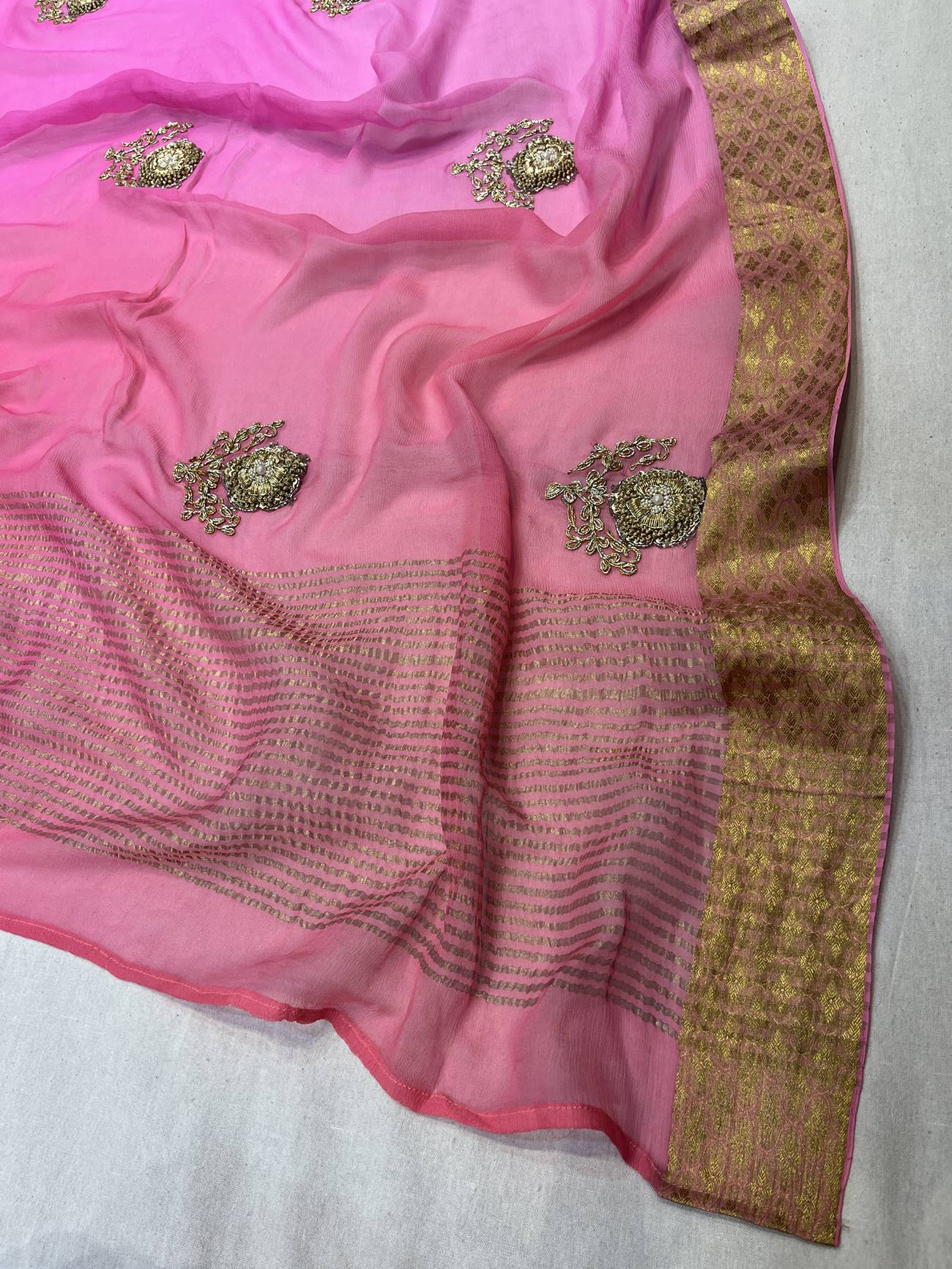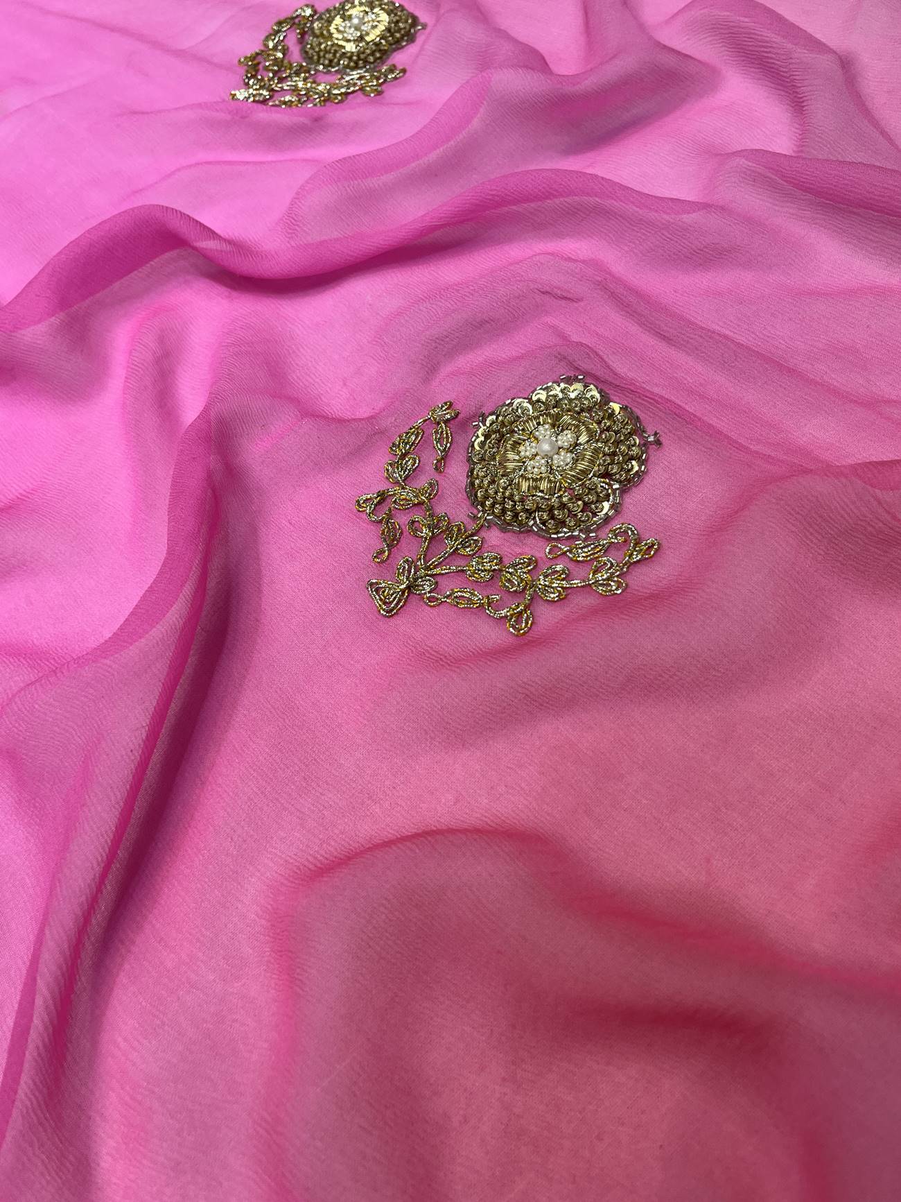 Saree Color : Shaded Peachy Pink Saree Fabric : Binny Chiffon Saree Work : Zardosi , Moti , Dori , French Knot , Sequine , Cutdana Blouse Color : Pink Blouse Fabric : Crepe Blouse Work : Zardosi , Moti , Dori |